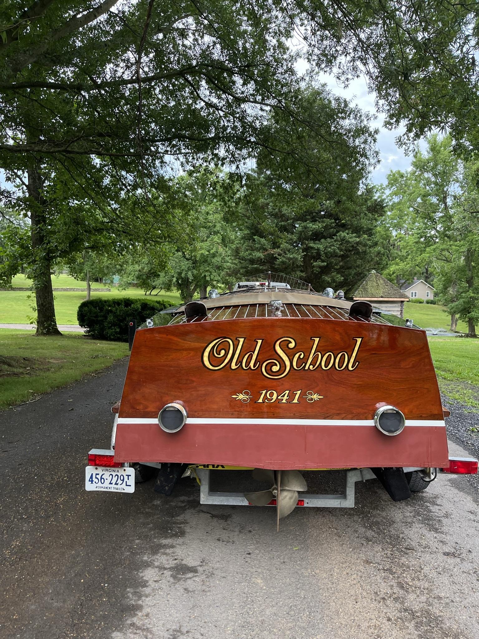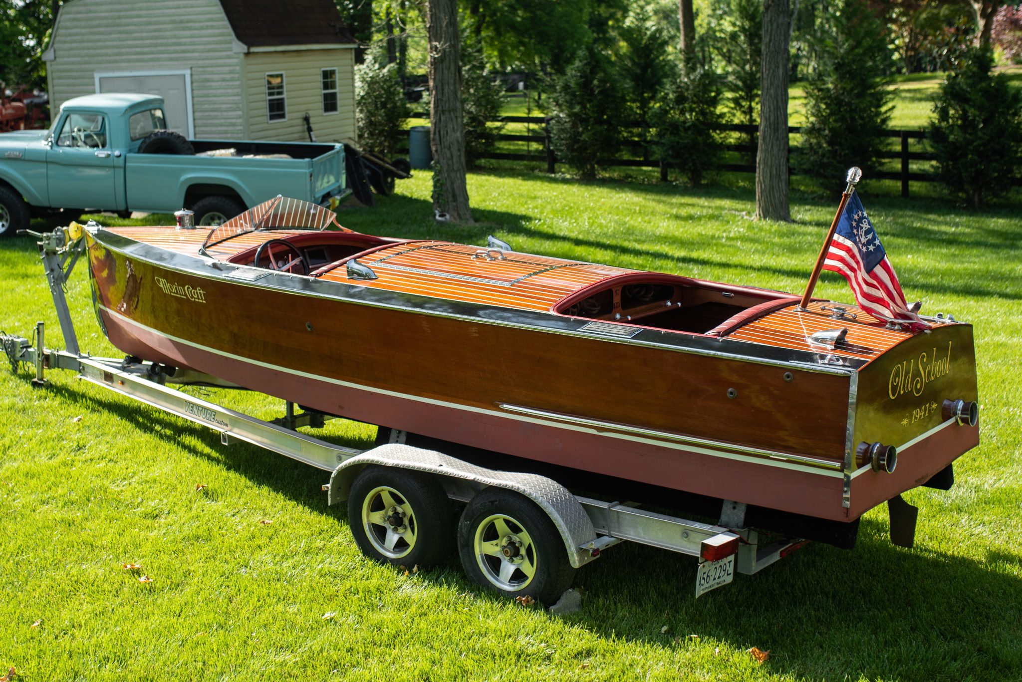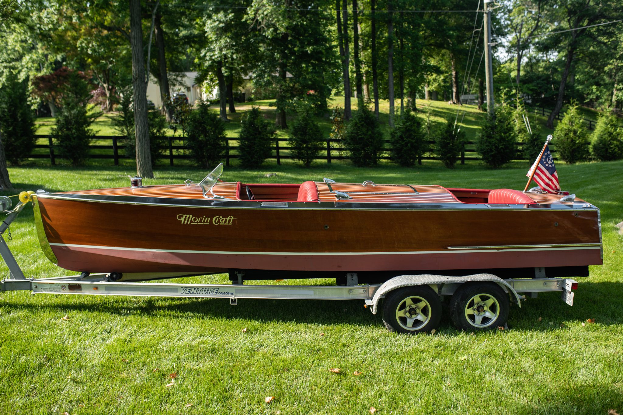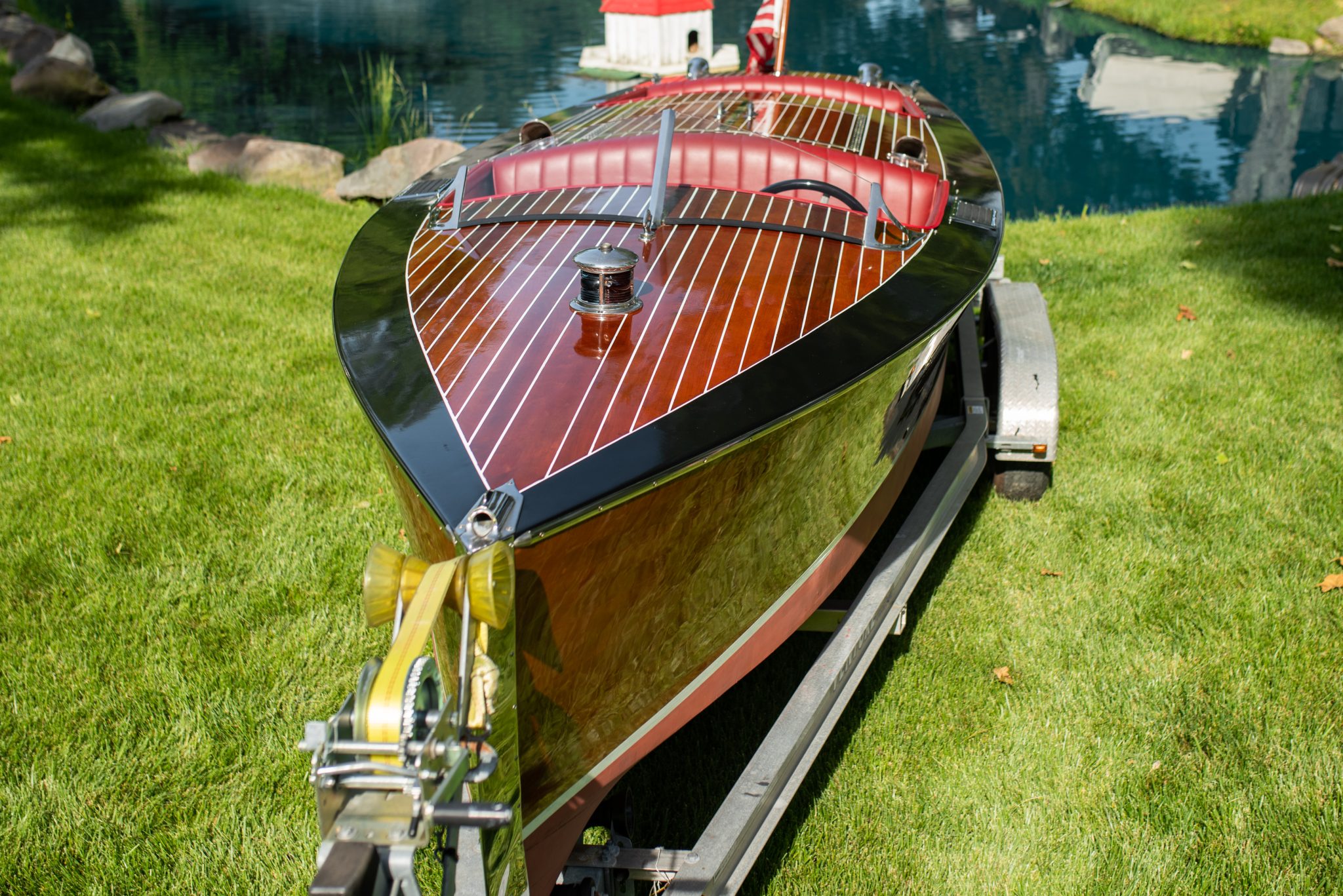 The split double-cockpit layout features two seating areas with bench seats upholstered in red vinyl along with color-coordinated crash pads and varnished side panels. Additional details include a split windscreen, rubber step pads, a gray floor in the forward cockpit, and a black rubber floor covering in the aft cockpit. A video of the boat on the water and underway can be viewed in the gallery below.