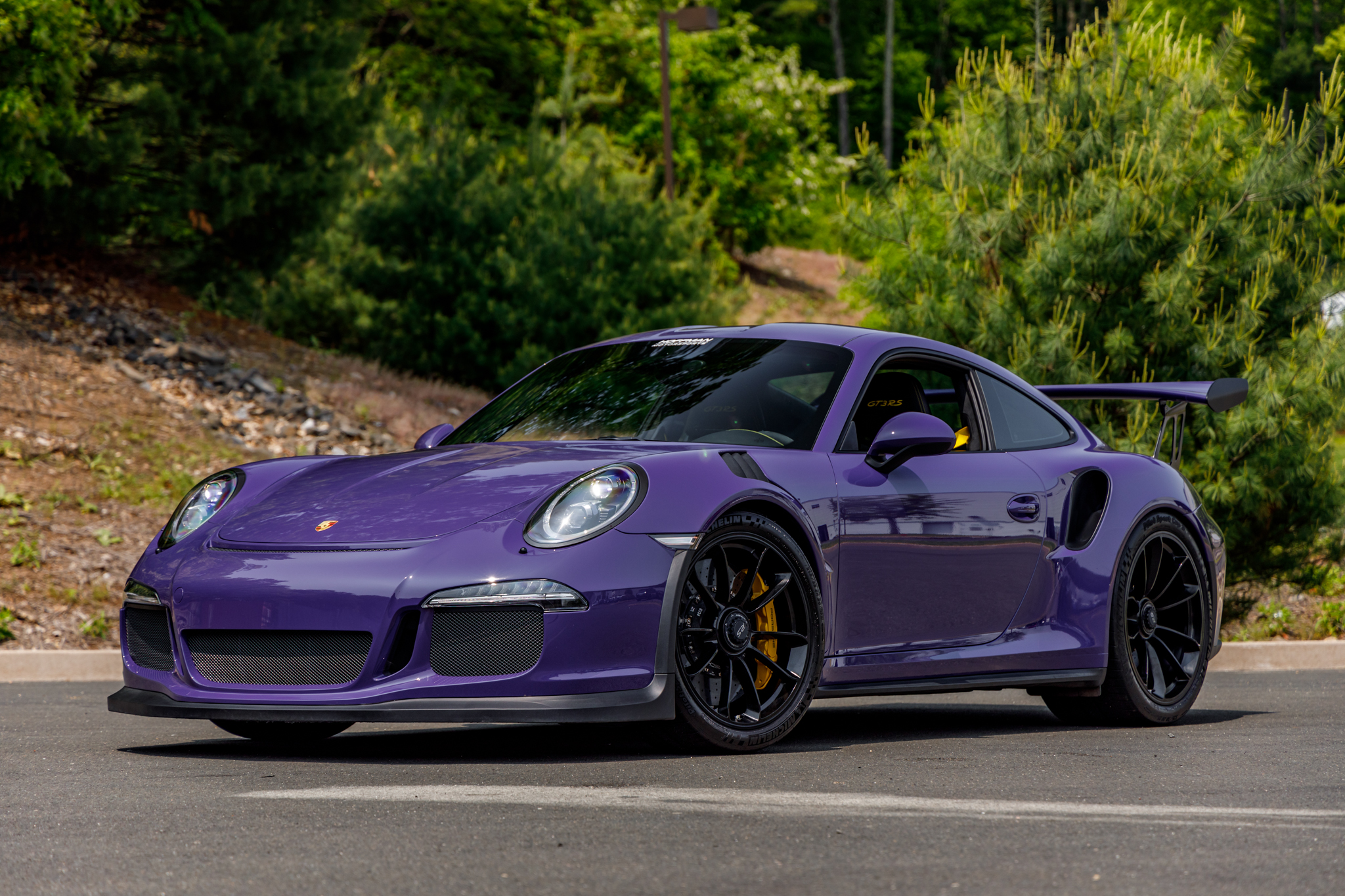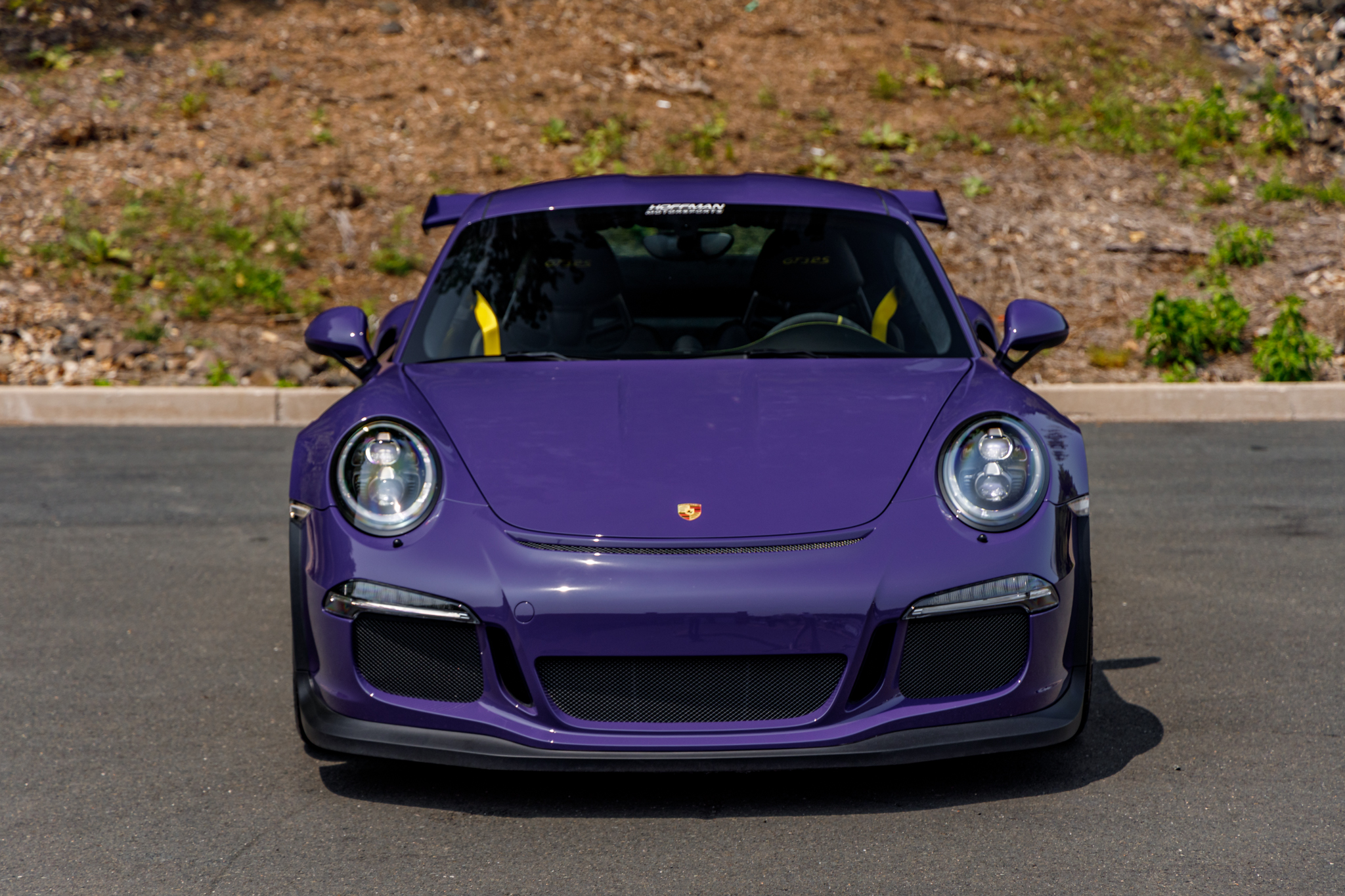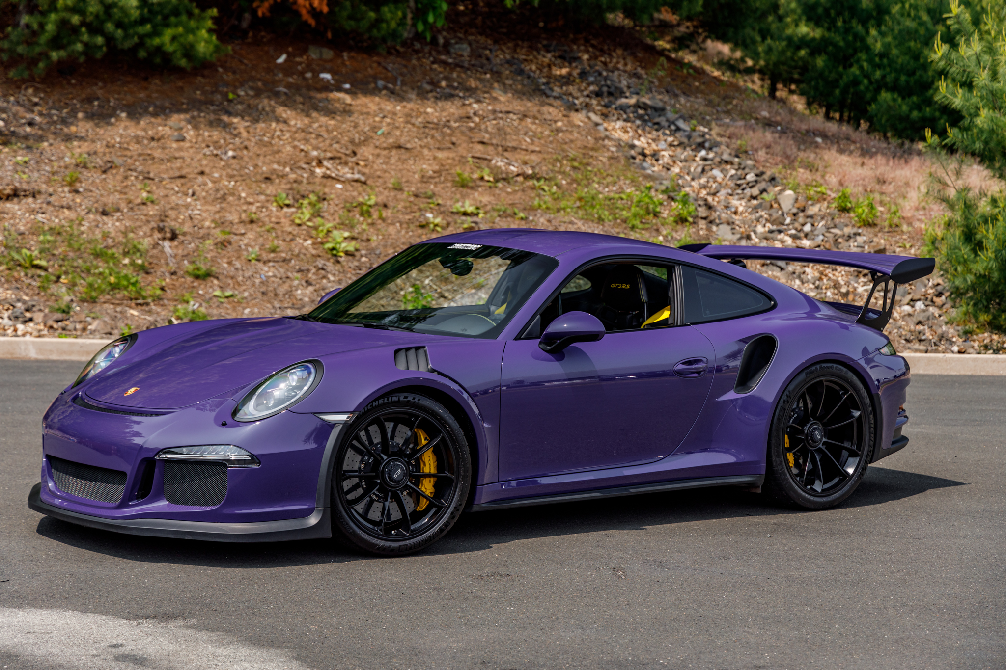 Black-finished 20″ and 21″ center-lock alloy wheels are mounted with 265/35 front and 325/30 rear Michelin Pilot Sport Cup 2 tires showing 2016 and 2021 date codes. Braking is handled by yellow Porsche-branded calipers over ceramic-composite rotors, and the car is equipped with a front-axle lift system. Standard GT3 RS equipment included rear-axle steering, Porsche Active Suspension Management, and Porsche Torque Vectoring Plus.