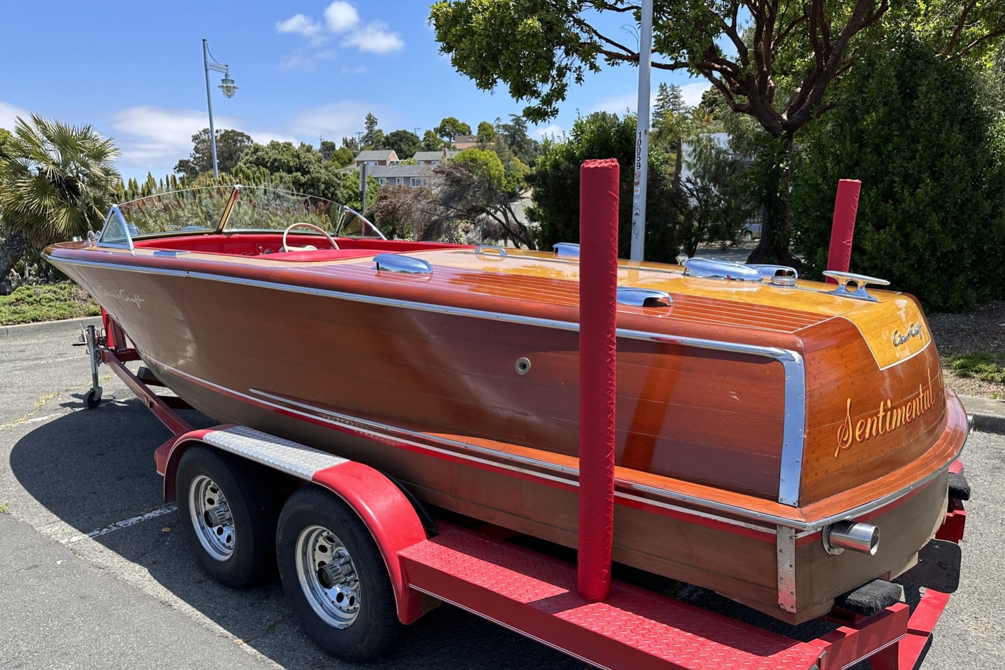 The six-place cockpit is upholstered in red vinyl and features chrome-trimmed rear storage compartments.