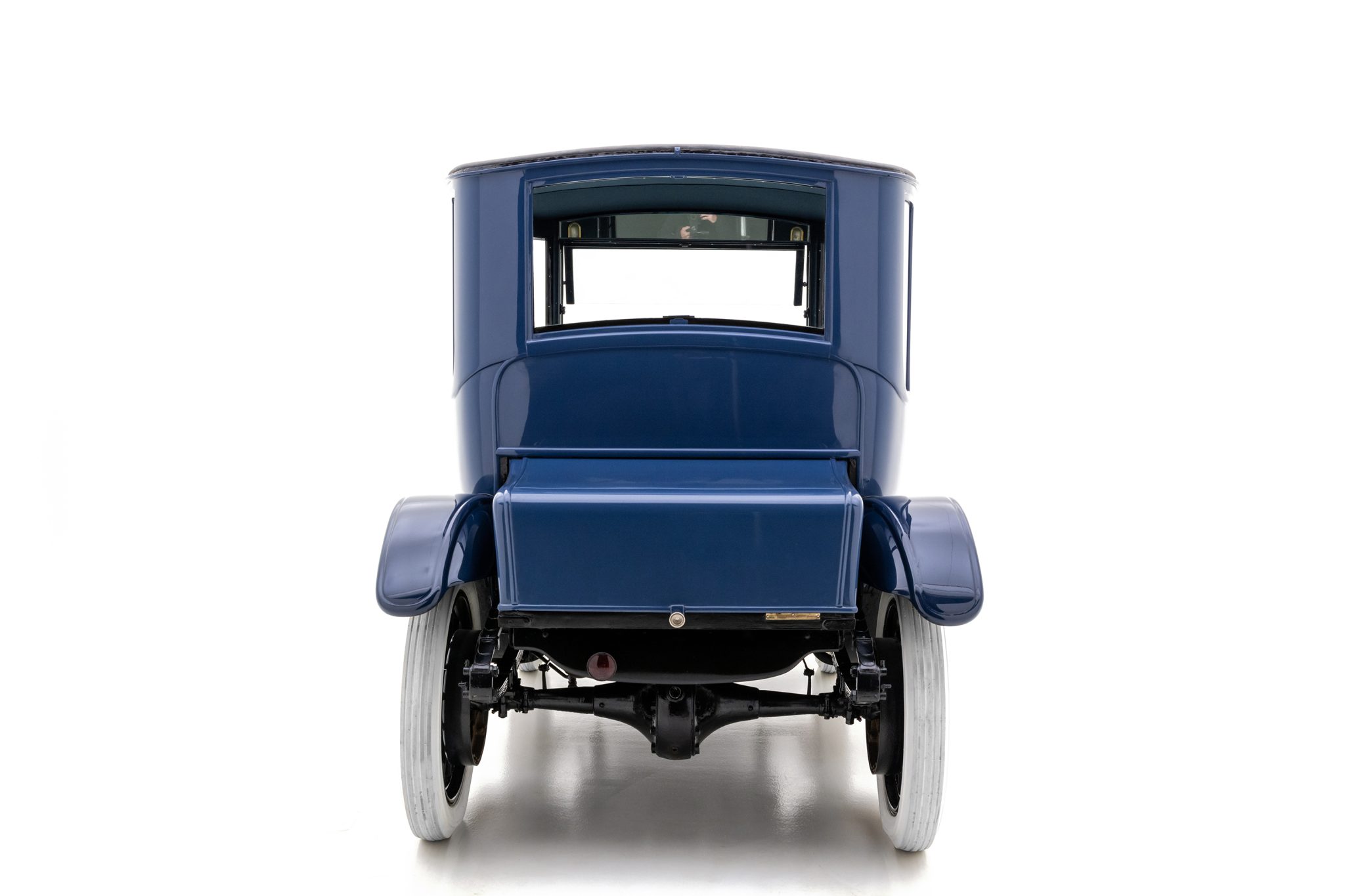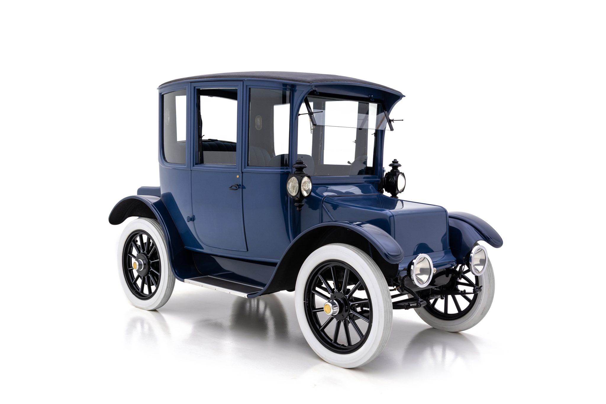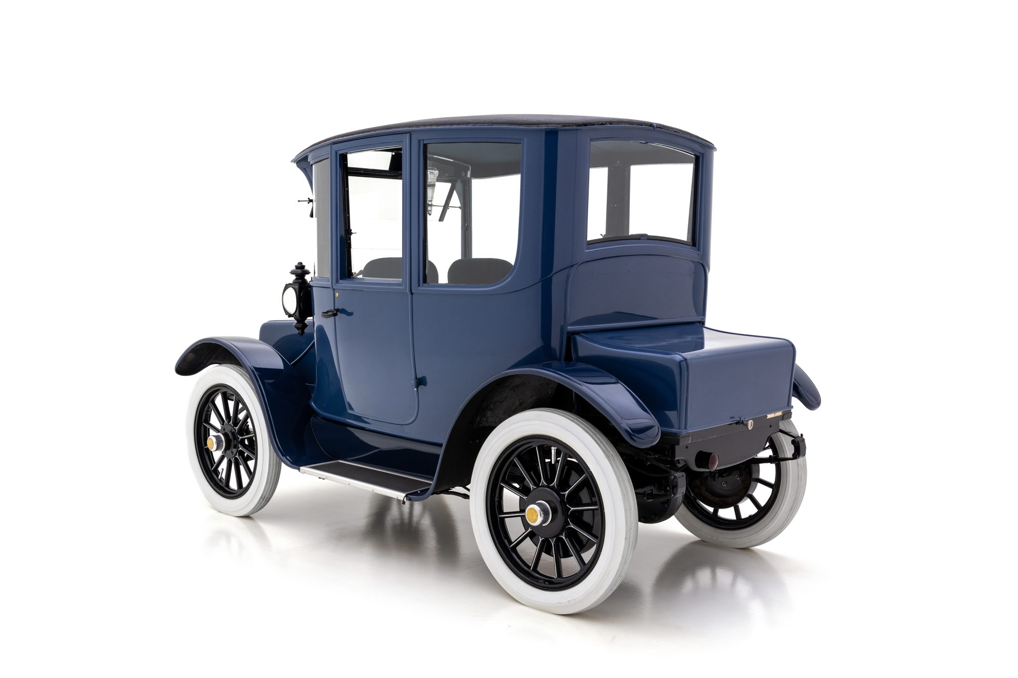 Riding on a 92” wheelbase, this example’s aluminum Brougham coachwork wears an older repaint in two-tone blue. Areas of paint blistering are noted ahead of the left-side door, on the right rear and left front of the body, and on the front battery compartment cover. Features include rear-hinged doors, curved side windows, a pop-out upper windshield panel, a textured fabric roof, running boards, nickel-rimmed headlights, and twin cowl lamps. A scuff is present on the roof covering.