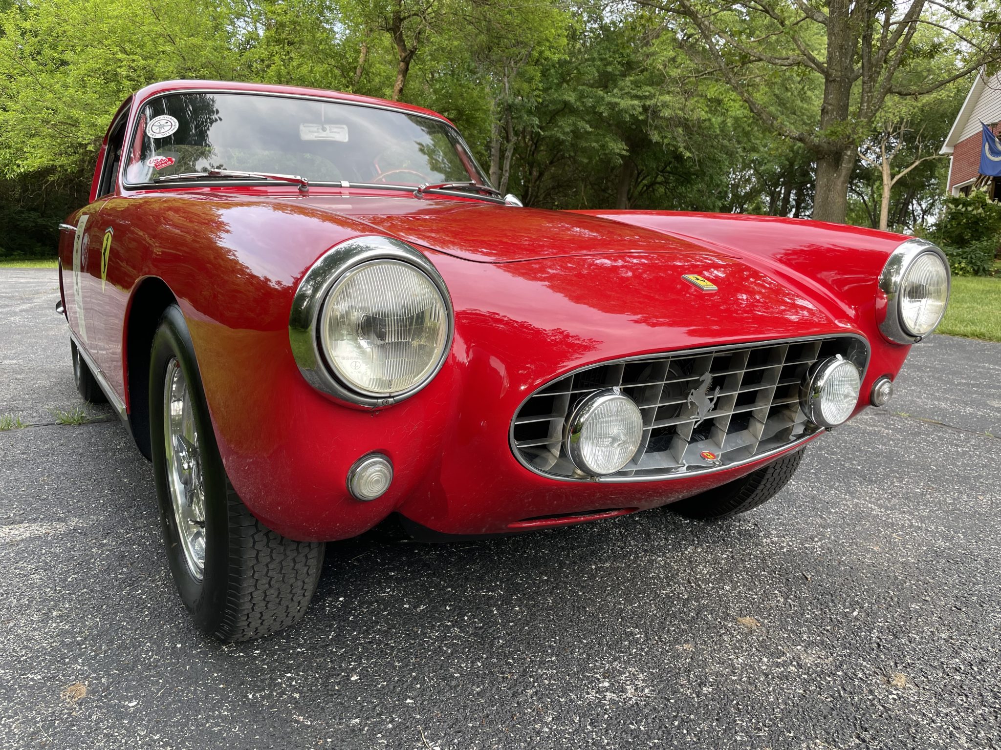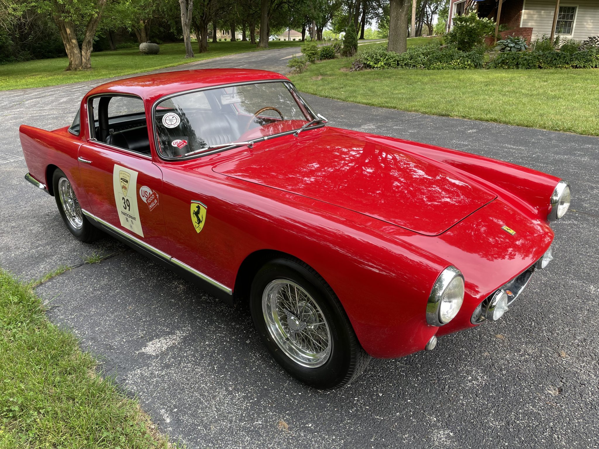 This high-roof example was repainted in red with dark gray rockers prior to current ownership, and areas of crazing and chipping on the frontal surfaces are shown up close in the photo gallery below. Cracks are present in the windshield, and a replacement windshield housed in a crate is included in the sale. Features include grille-mounted Marchal fog lamps, a wraparound rear window, tail fins, a driver-side Talbot mirror, Scuderia Ferrari shield decals, and quad Megs exhaust outlets. Graphics from the California Mille and Louis Vuitton Classic China Run remain affixed to the doors.