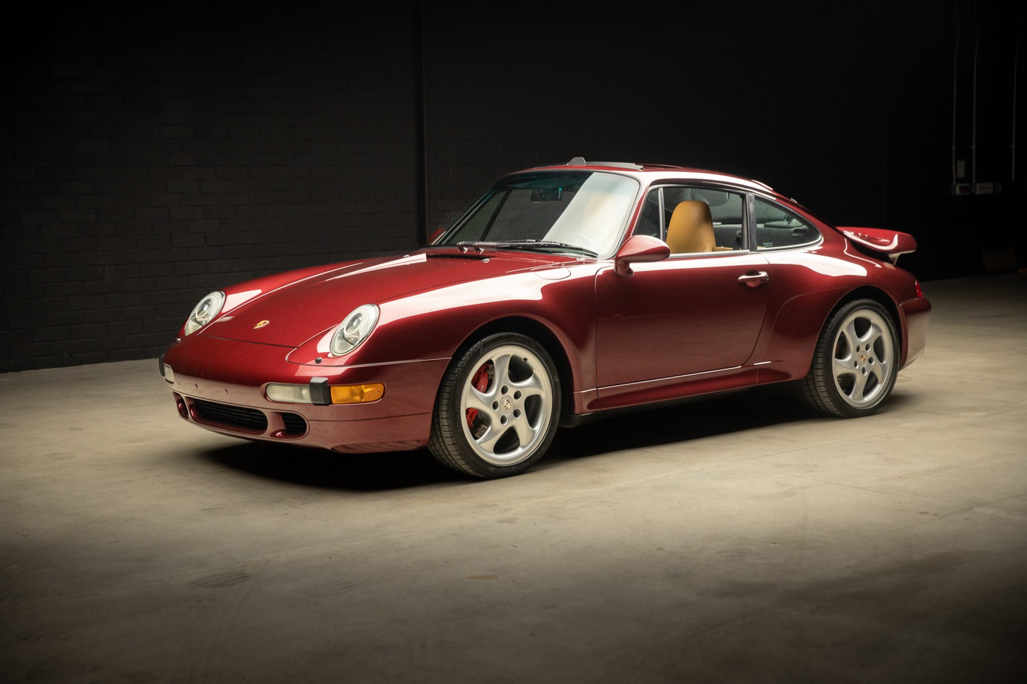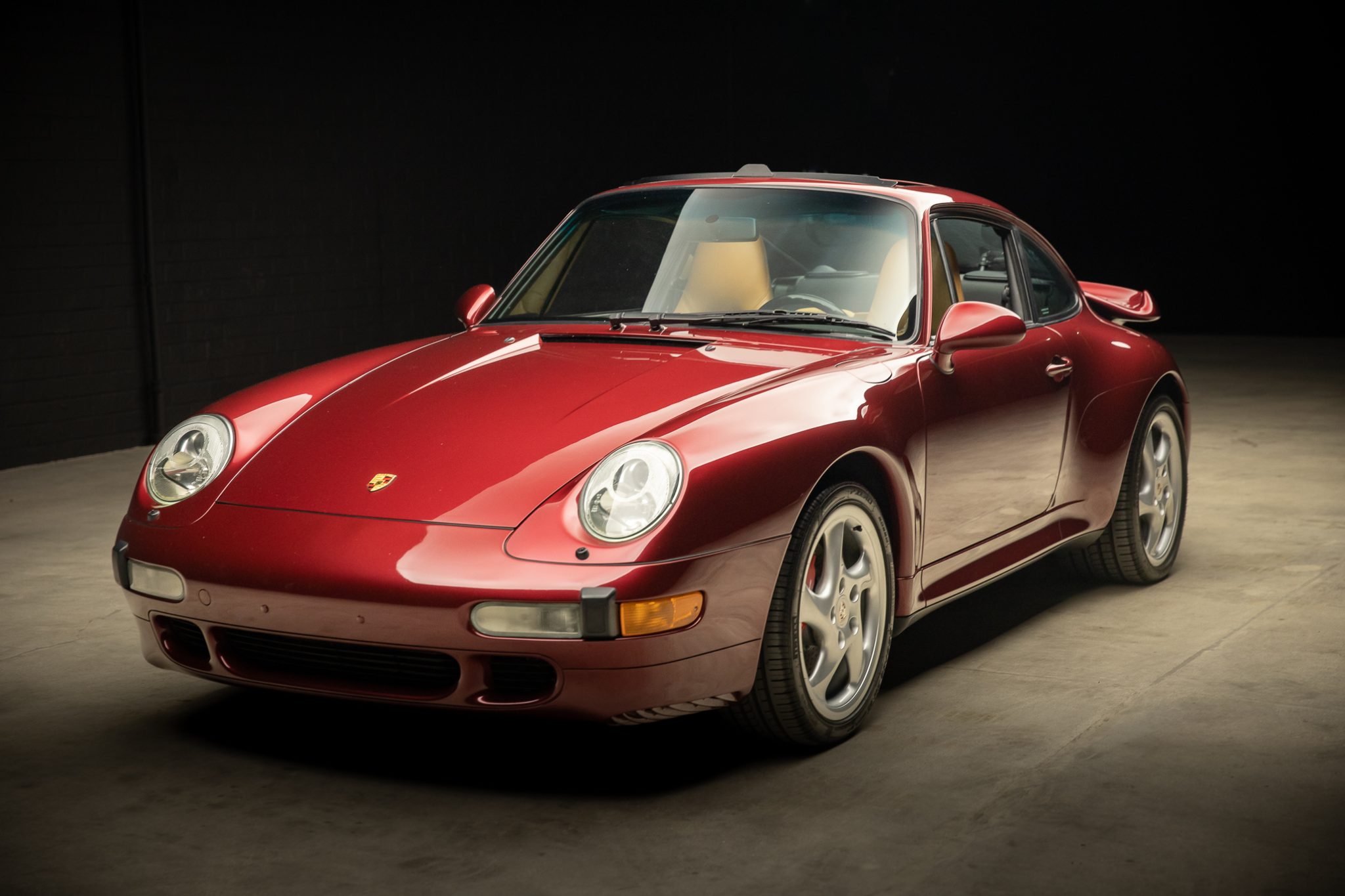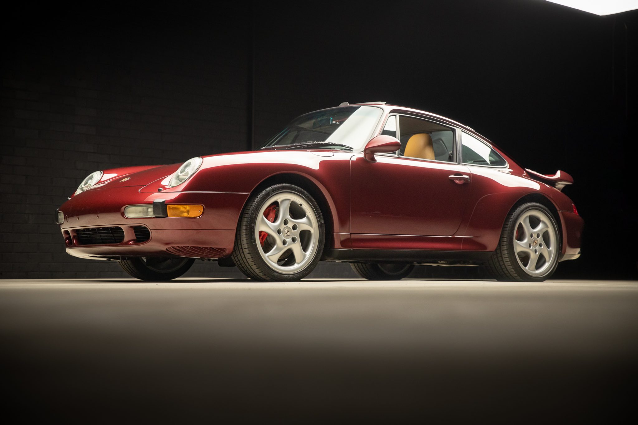 The 18″ Turbo Twist wheels are mounted with 225/40 front and 285/30 rear Pirelli P Zero Rosso tires. The full-color Porsche crest center caps are faded. The car features an Automatic Brake Differential (ABD), and the 993 was the first 911 to feature multi-link rear suspension. Braking is provided by red Porsche-branded four-piston calipers over cross-drilled rotors.