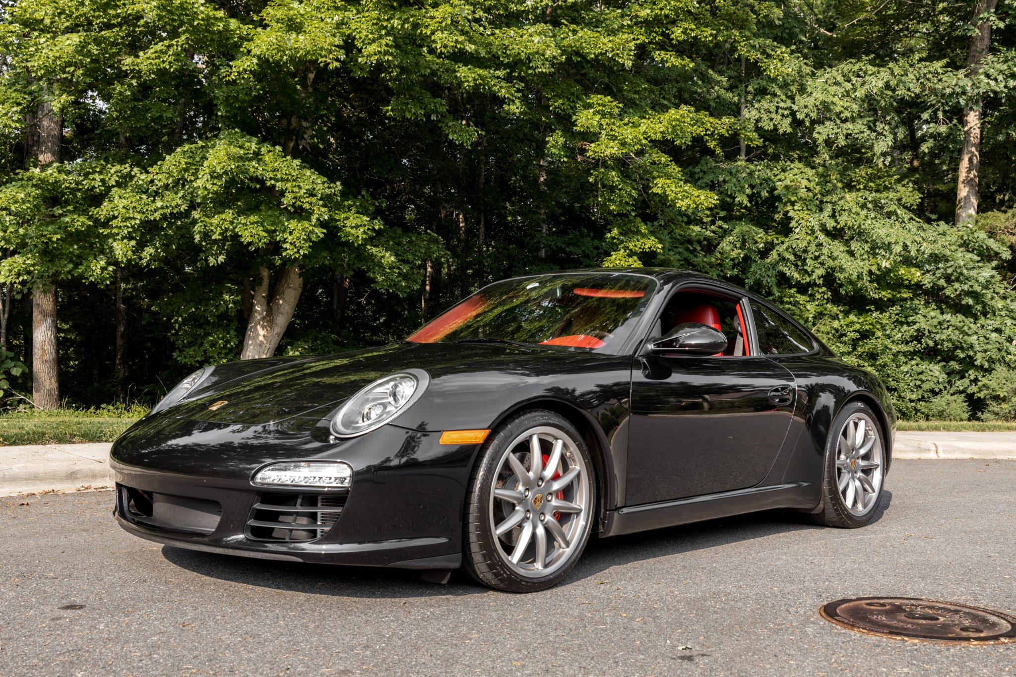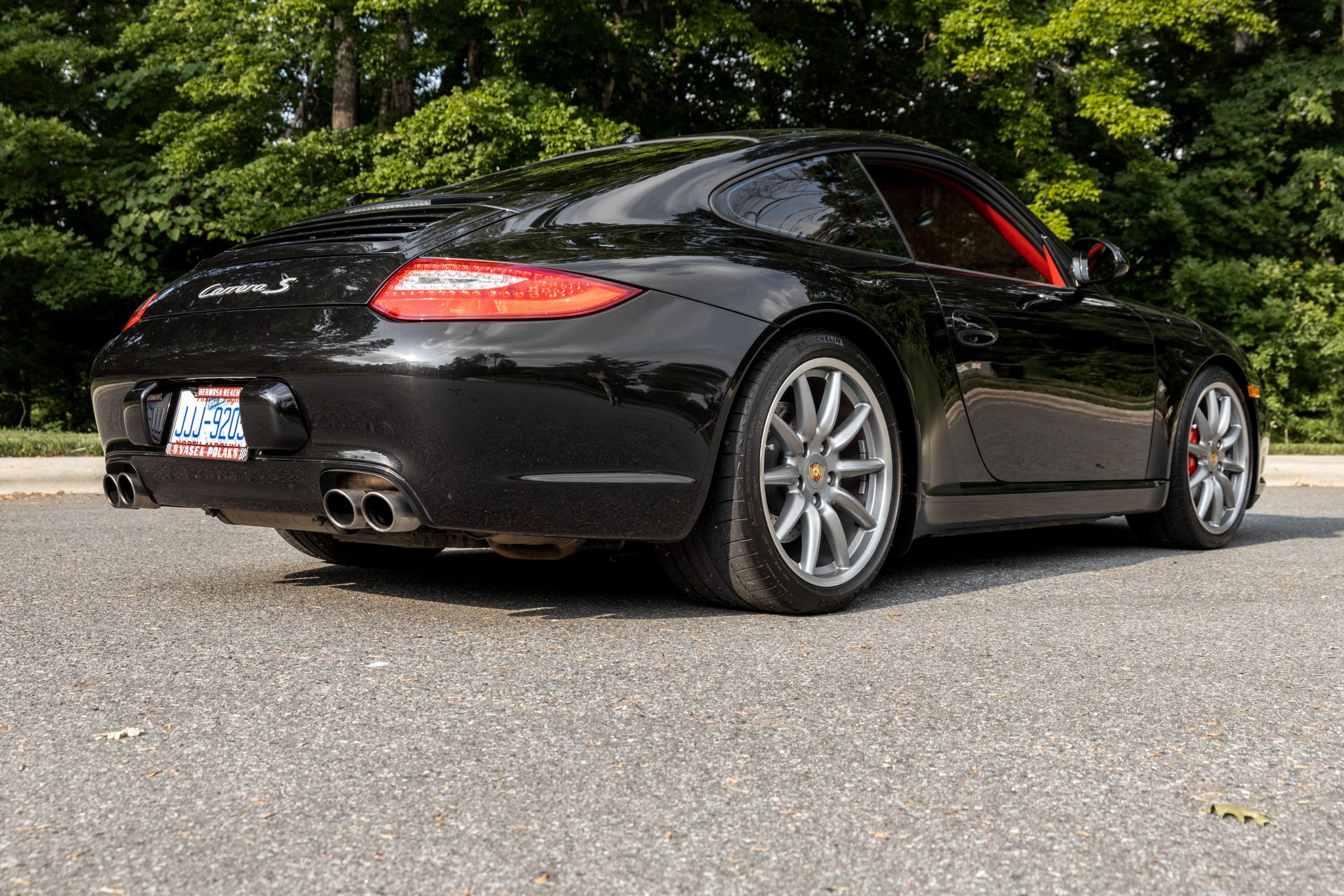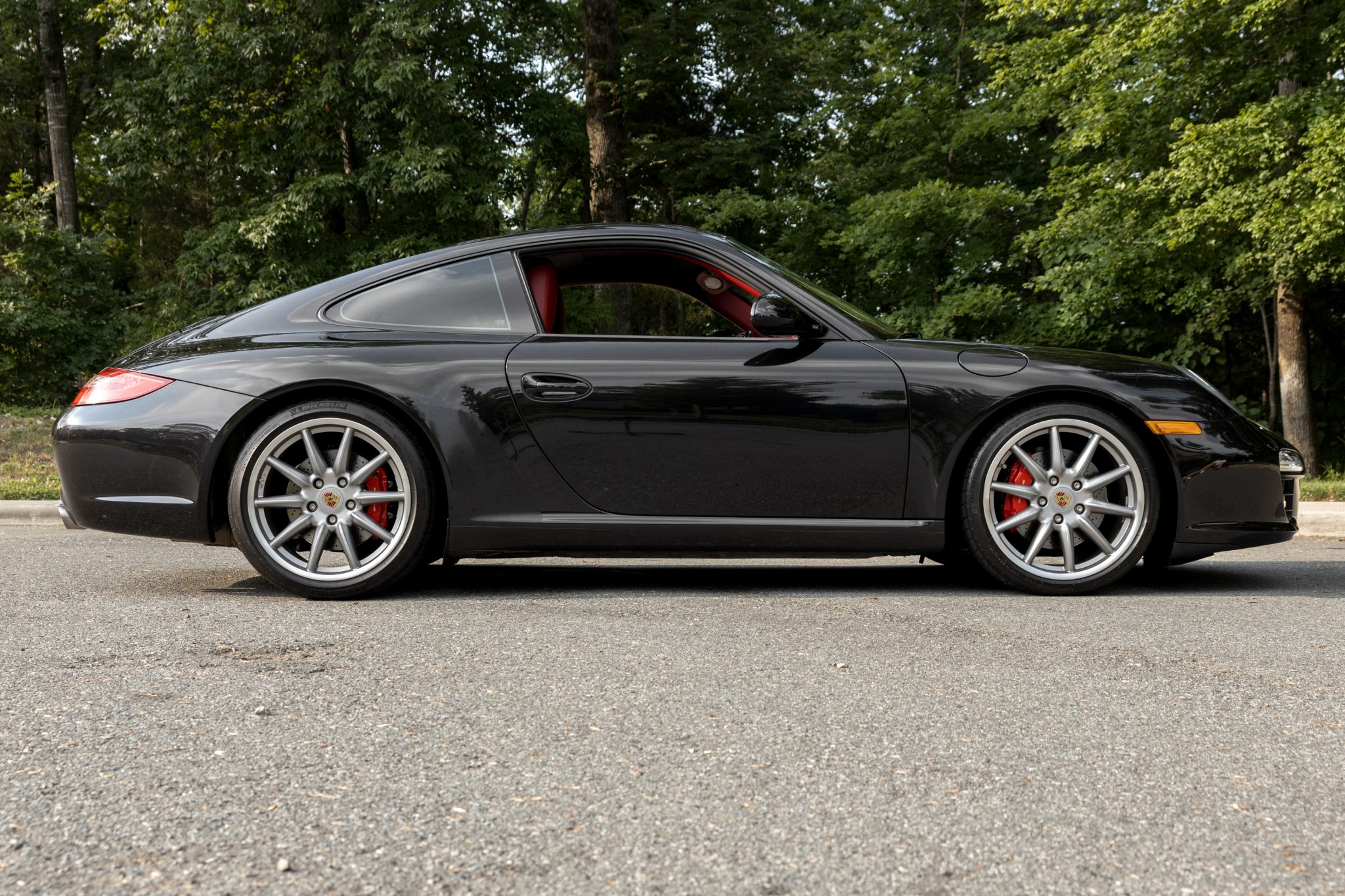 The 19″ Carrera Sport wheels are wrapped in Michelin Pilot Sport tires and braking is handled by red Porsche-branded multi-piston brake calipers fitted over cross-drilled and vented rotors at all four corners. The car is equipped with the Porsche Active Suspension Management Sports Suspension Package (PASM) as well as Porsche Stability Management (PSM), an active brake differential (ABD), and Anti-Slip Regulation (ASR).
