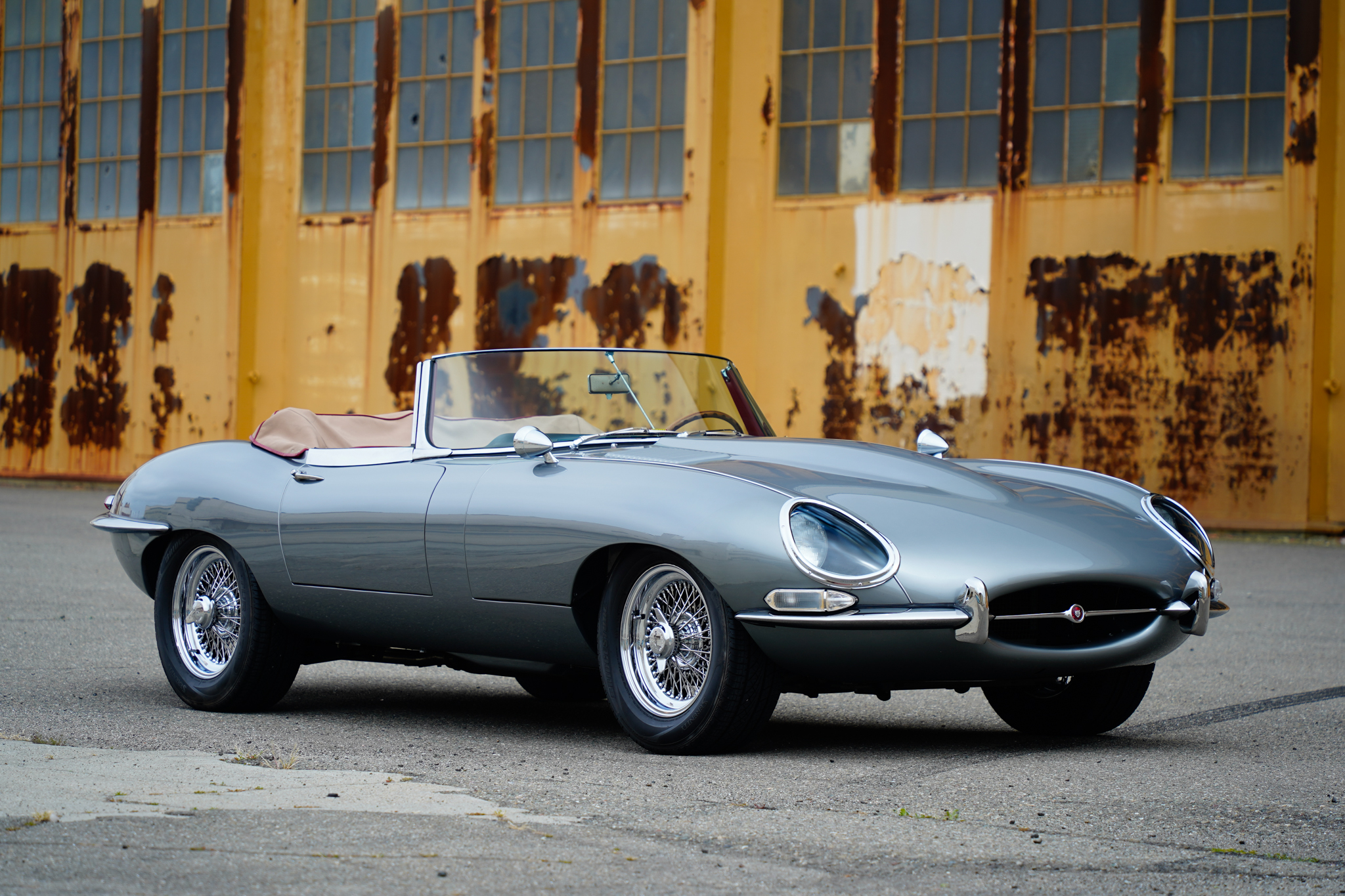 Chrome-finished 15″ wire wheels feature two-eared knock-off spinners and are mounted with 205/65 Bridgestone Turanza Serenity tires, while a full-size spare is mounted under the trunk floor. The fully independent suspension and four-wheel disc brakes were overhauled during the refurbishment, and the car features Koni shock absorbers up front and Boge shock absorbers at the rear.