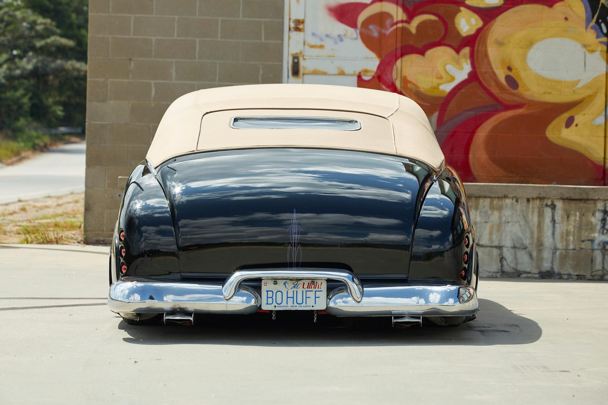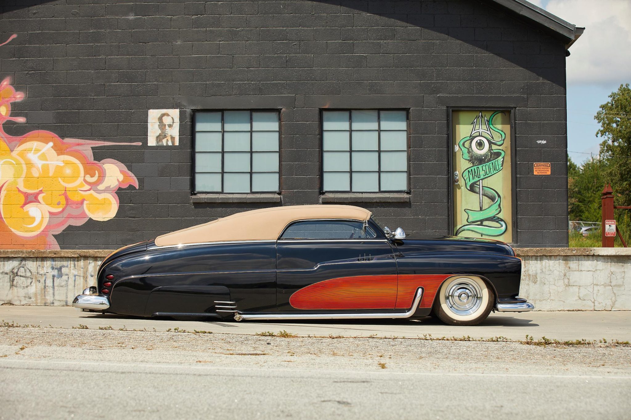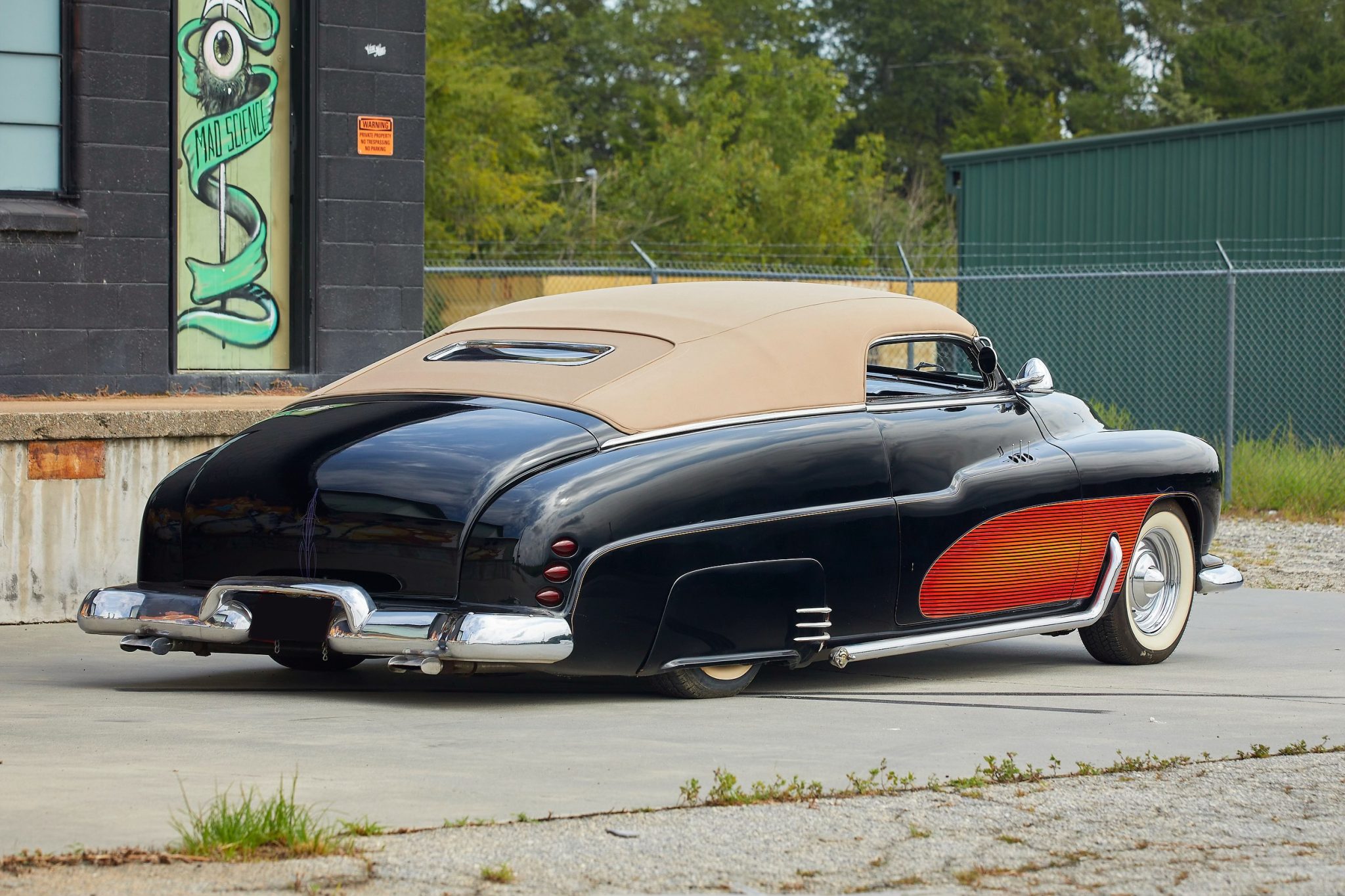 Chrome-finished steel wheels wear polished hub caps and are wrapped in Coker classic wide whitewall tires that show age. Stopping power is from four-wheel powered disc brakes with red-finished calipers. The car has been channeled over the chassis, and equipment includes front and rear suspension components that were reportedly sourced from a Chevrolet Monte Carlo and are hydraulically adjustable.