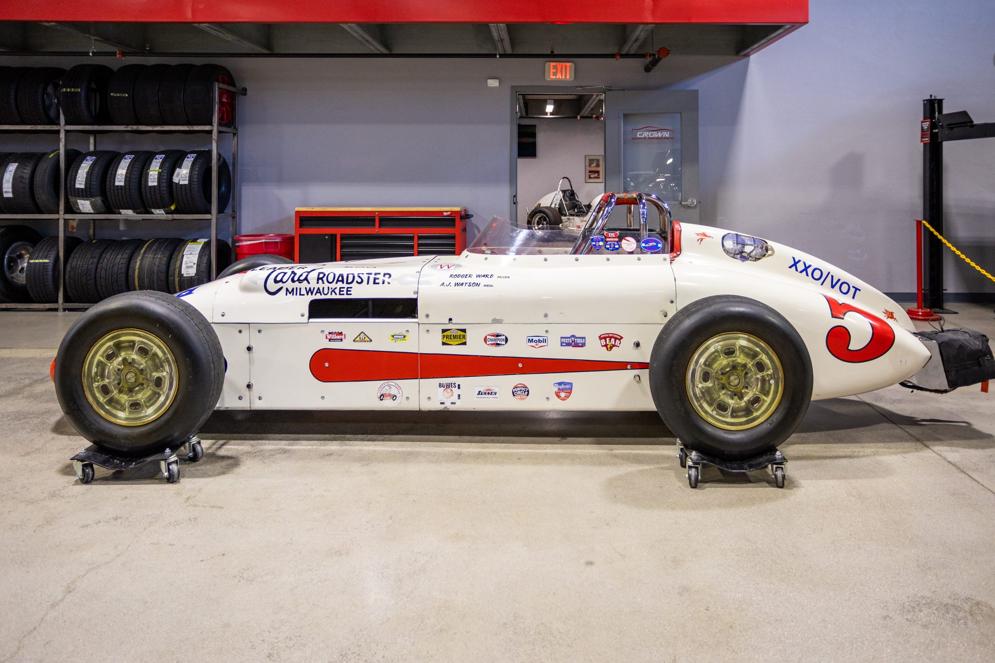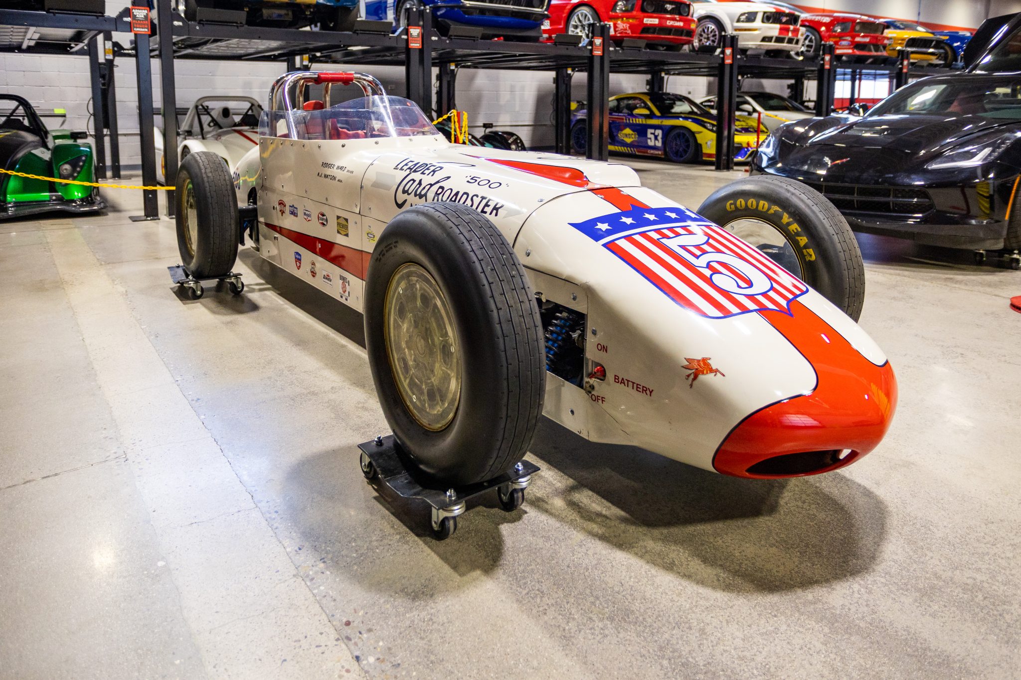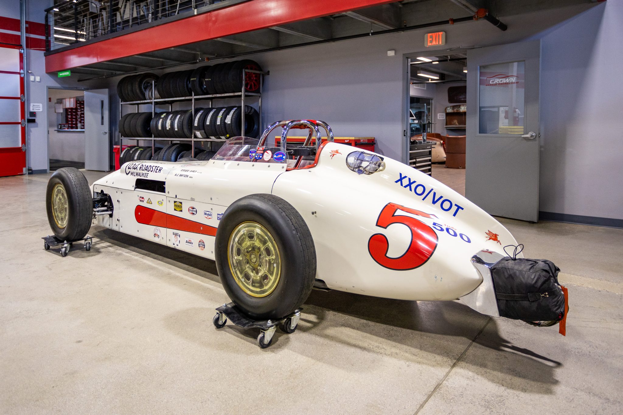 The 15″ steel wheels wear custom-fabricated inner and outer covers topped with Halibrand-style vinyl decals and are mounted with Goodyear Land Speed tires. The car is equipped with a Vega manual steering box and rides on an adjustable AFCO Racing coilover suspension. Stopping power is provided by Wilwood rear disc brakes.