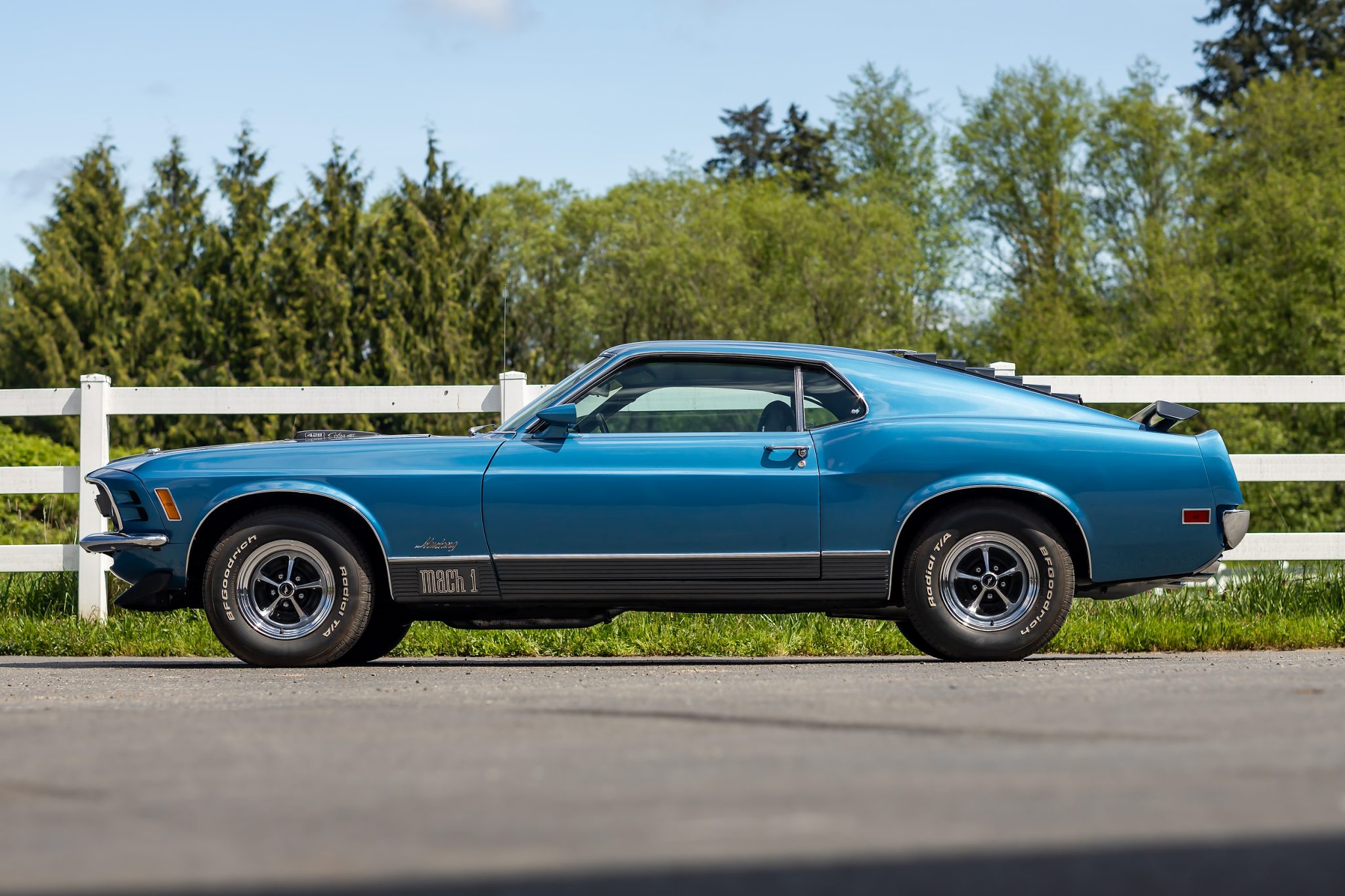 Magnum 500-style 14″ wheels are mounted with 225/70 BFGoodrich Radial T/A tires, while a full-size spare is stored in the trunk compartment. The car is equipped with a competition suspension, and stopping power is provided by four-wheel drum brakes.