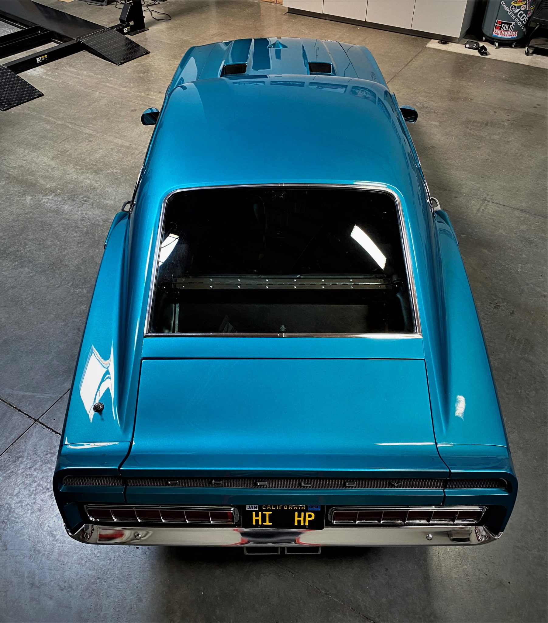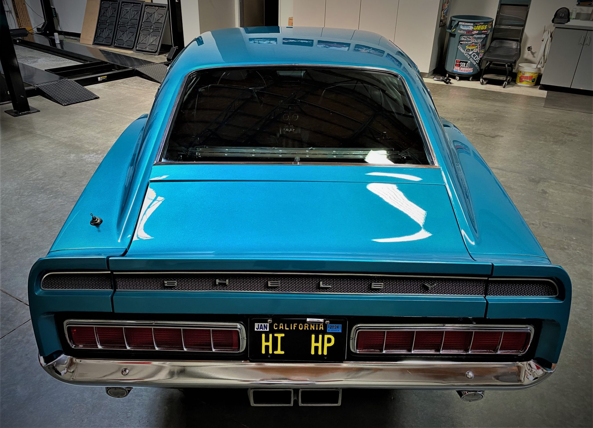 Five-spoke 15″ wheels with polished lips wear black Shelby center caps and are wrapped in BFGoodrich Radial T/A tires measuring 235/60 up front and 245/60 out back that were reportedly mounted in 2023. A space-saver spare and jack are mounted in the trunk. The car is equipped with power steering, and braking is handled by power-assisted front discs and rear drums.