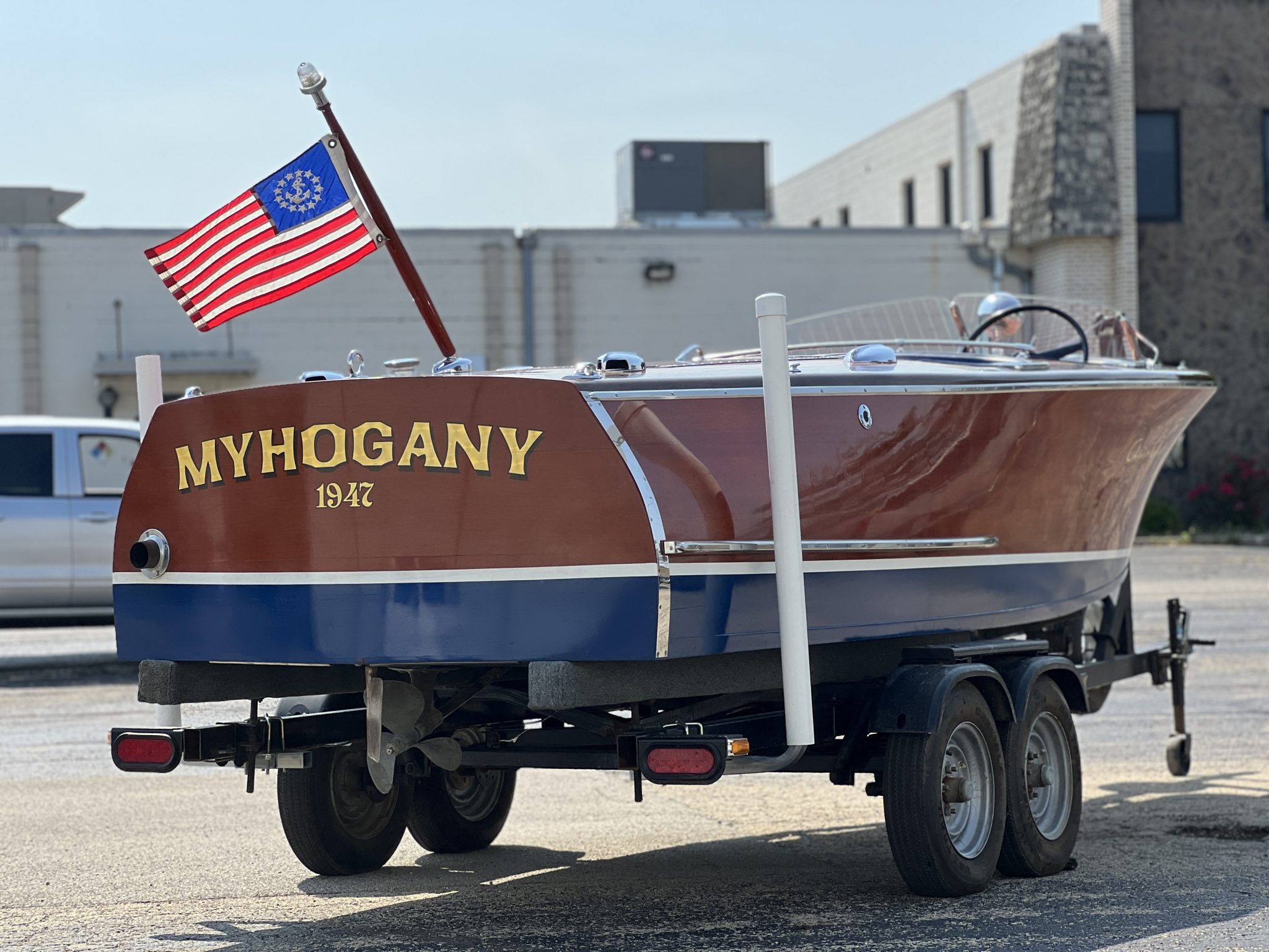 The two-seat cockpit is upholstered in blue vinyl and features blue textured flooring, a wooden dash, gunwale storage pockets, step plates, and a chrome gear selector.