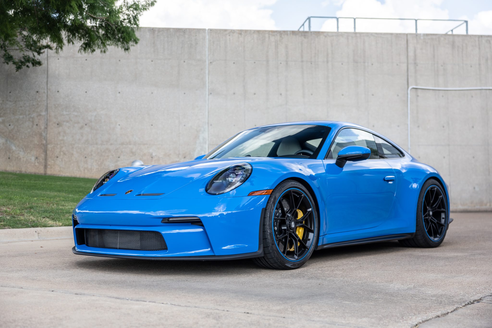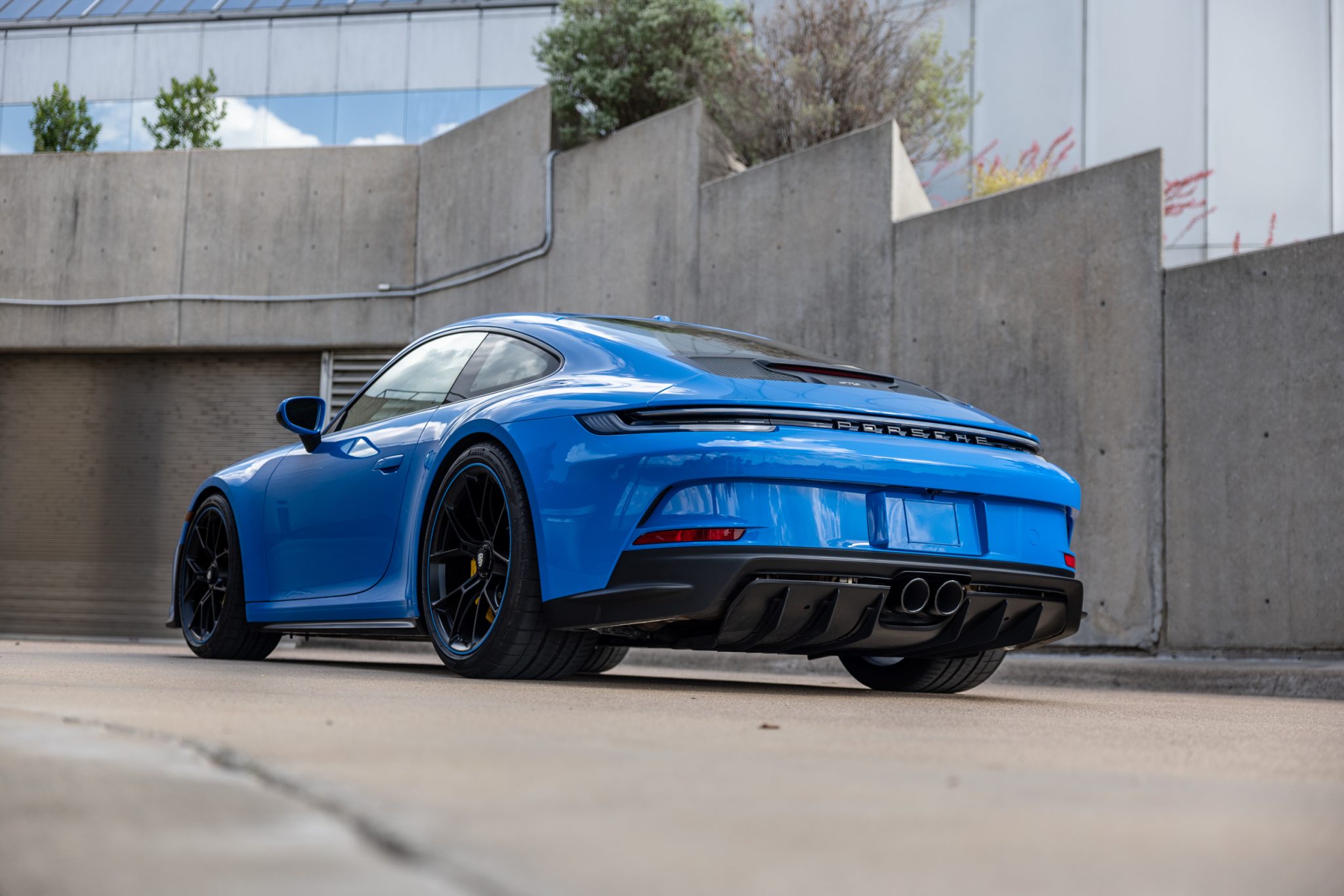 The 20″ front and 21″ rear GT3 center-lock wheels are finished in Satin Black with Shark Blue outer lips and wear 255/35 front and 315/30 rear Pirelli P Zero Corsa tires. Stopping power is provided by Porsche Ceramic Composite Brakes (PCCB) with cross-drilled and ventilated rotors and yellow-finished calipers. The car is equipped with a front-axle lift system and rear-axle steering.