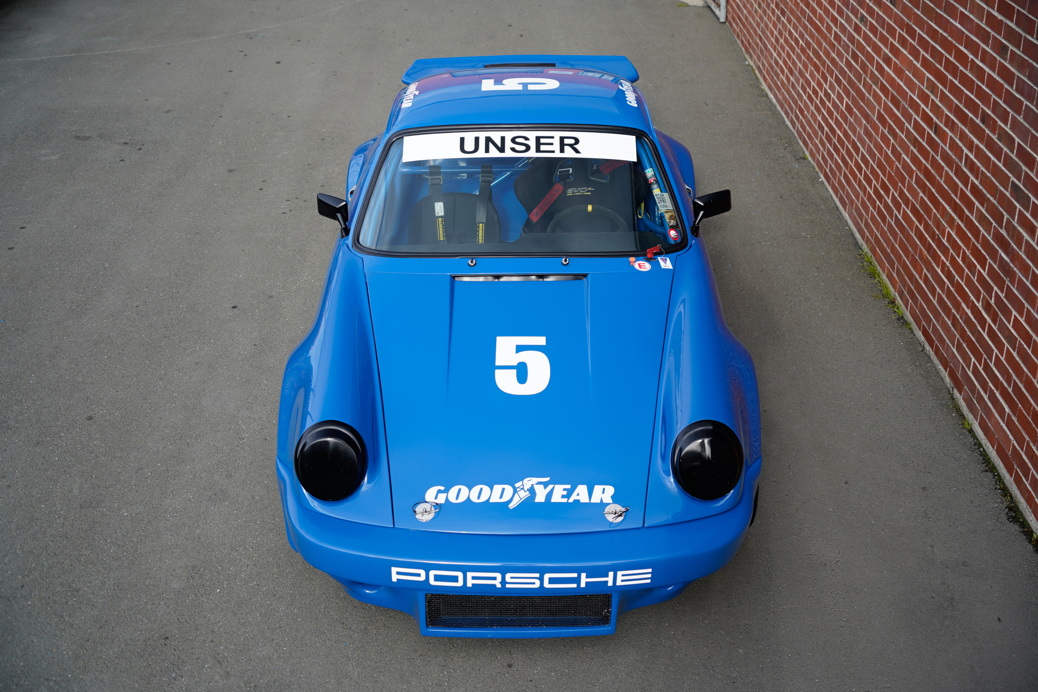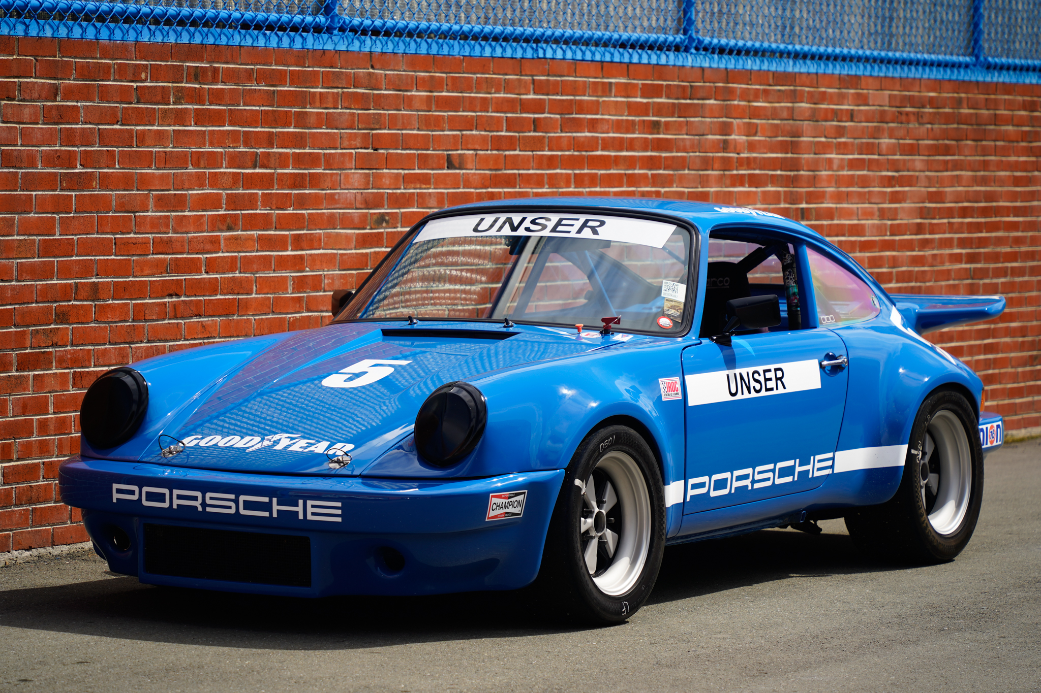 Further exterior details include covered headlights, hood pins, Lexan side and rear windows, flared fenders, a “whale tail” spoiler, dual megaphone exhaust outlets, and an electrical cutoff switch affixed to the cowl. The front fascia features air ducts for the brakes and an integrated front air dam, while a GT-style rear bumper has been installed. The windshield was replaced in December 2021, and rock chips are visible on the forward-facing rear fender flares.