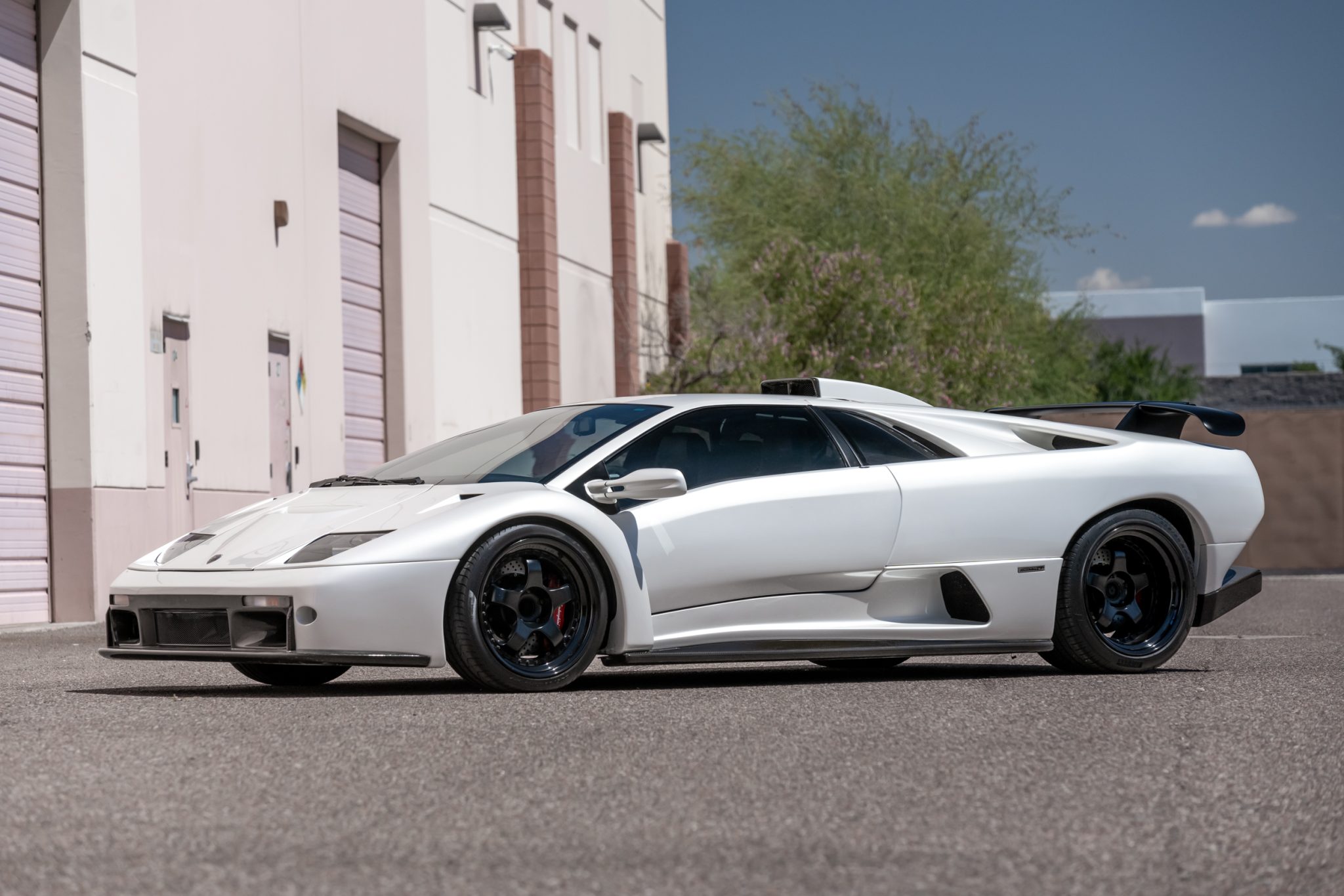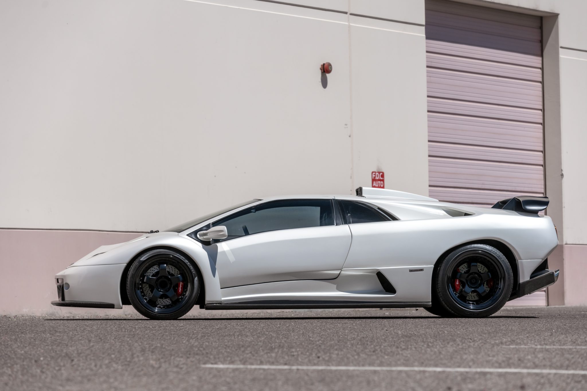 The fuel cap was moved to the top of the passenger quarter panel, and a Tubi-Style center-exit muffler has been added. Black staggered-width 18″ Work Meister S1 wheels wear Pirelli P Zero tires sized 245/35 up front and 335/30 out back. Red Lamborghini-branded brake calipers are mounted up front, while a Brembo rear big brake kit was installed under prior ownership. Cross-drilled rotors are featured all around.