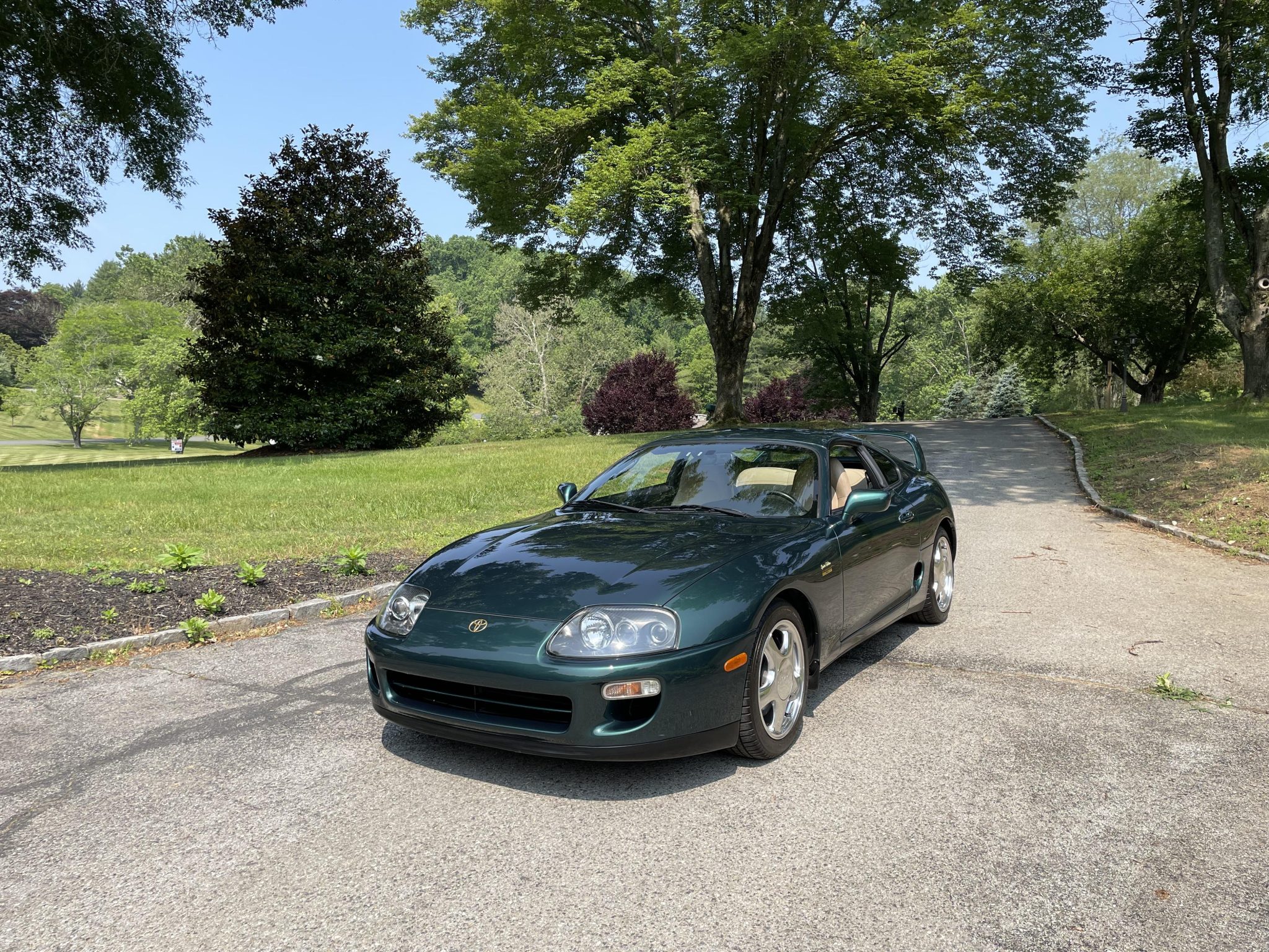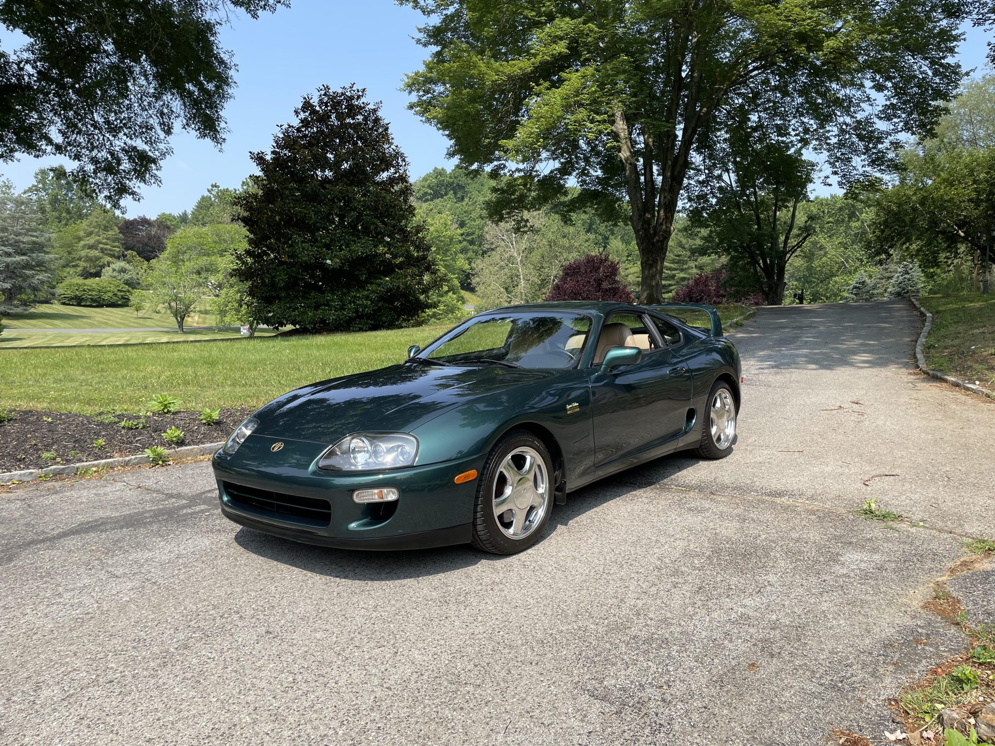 Chrome 17″ five-spoke wheels are mounted with 235/45 front and 255/40 rear Michelin Pilot Sport A/S 3+ tires. The car rides on a four-wheel double-wishbone suspension system and features speed-sensing progressive power rack-and-pinion steering and electronic traction control. Anti-lock braking is provided by Supra-logo calipers and ventilated discs at each corner. The seller states the brake master cylinder was replaced in 2021.