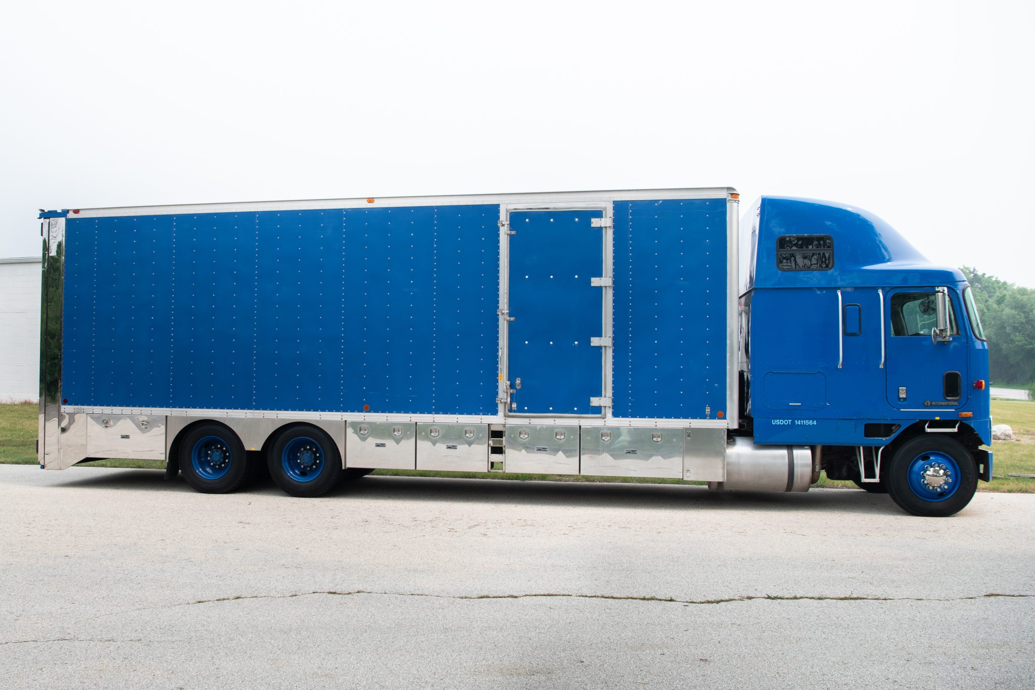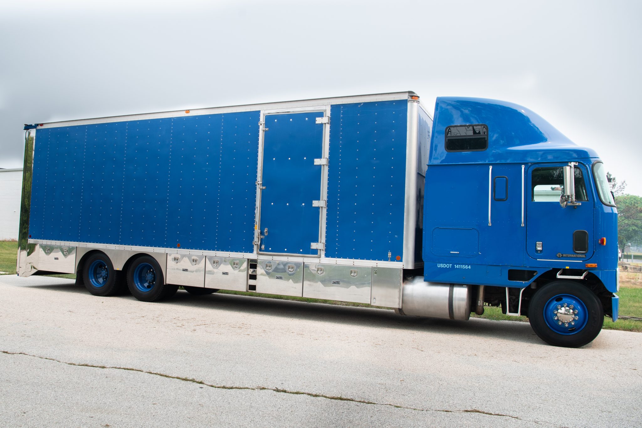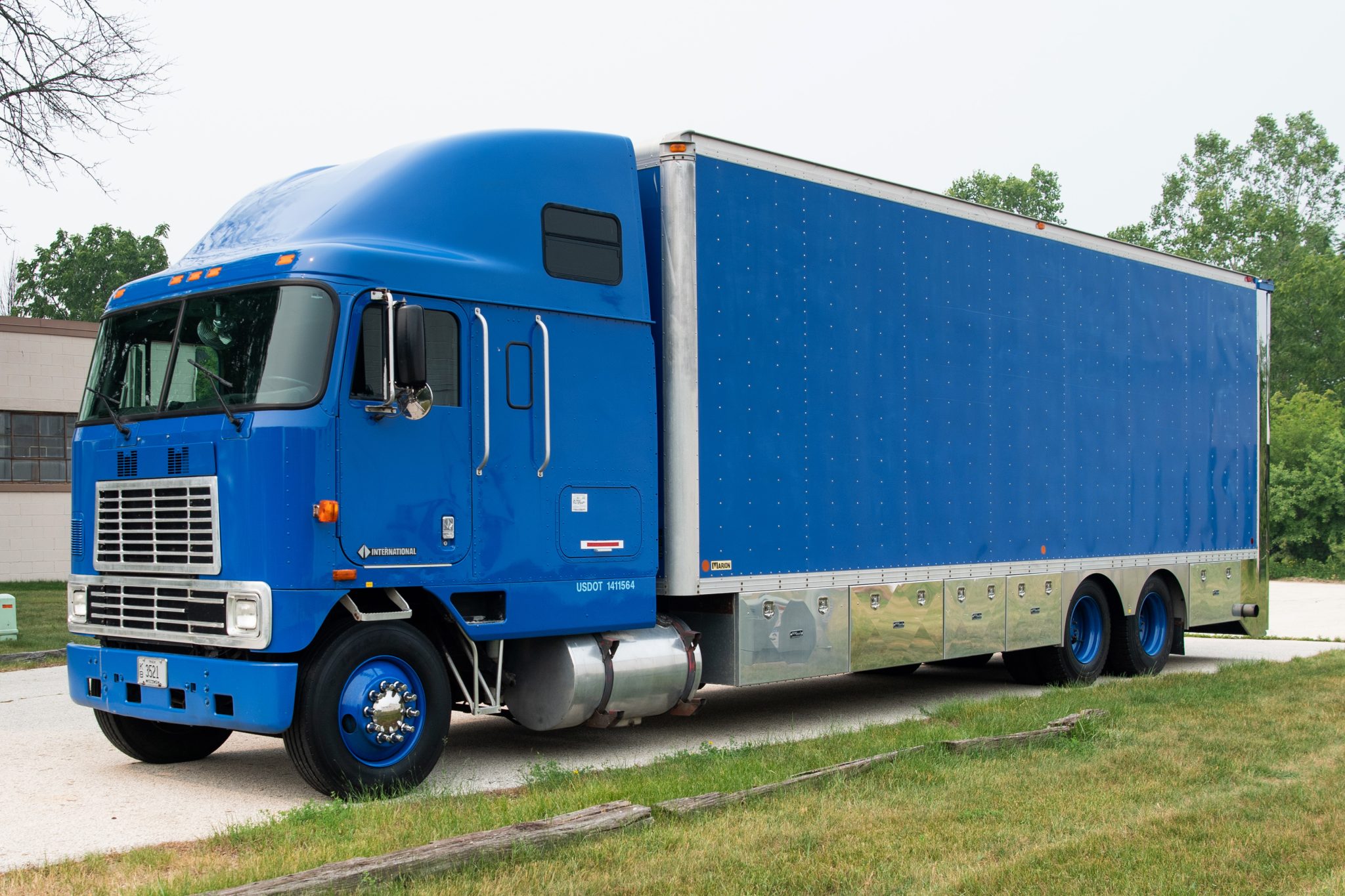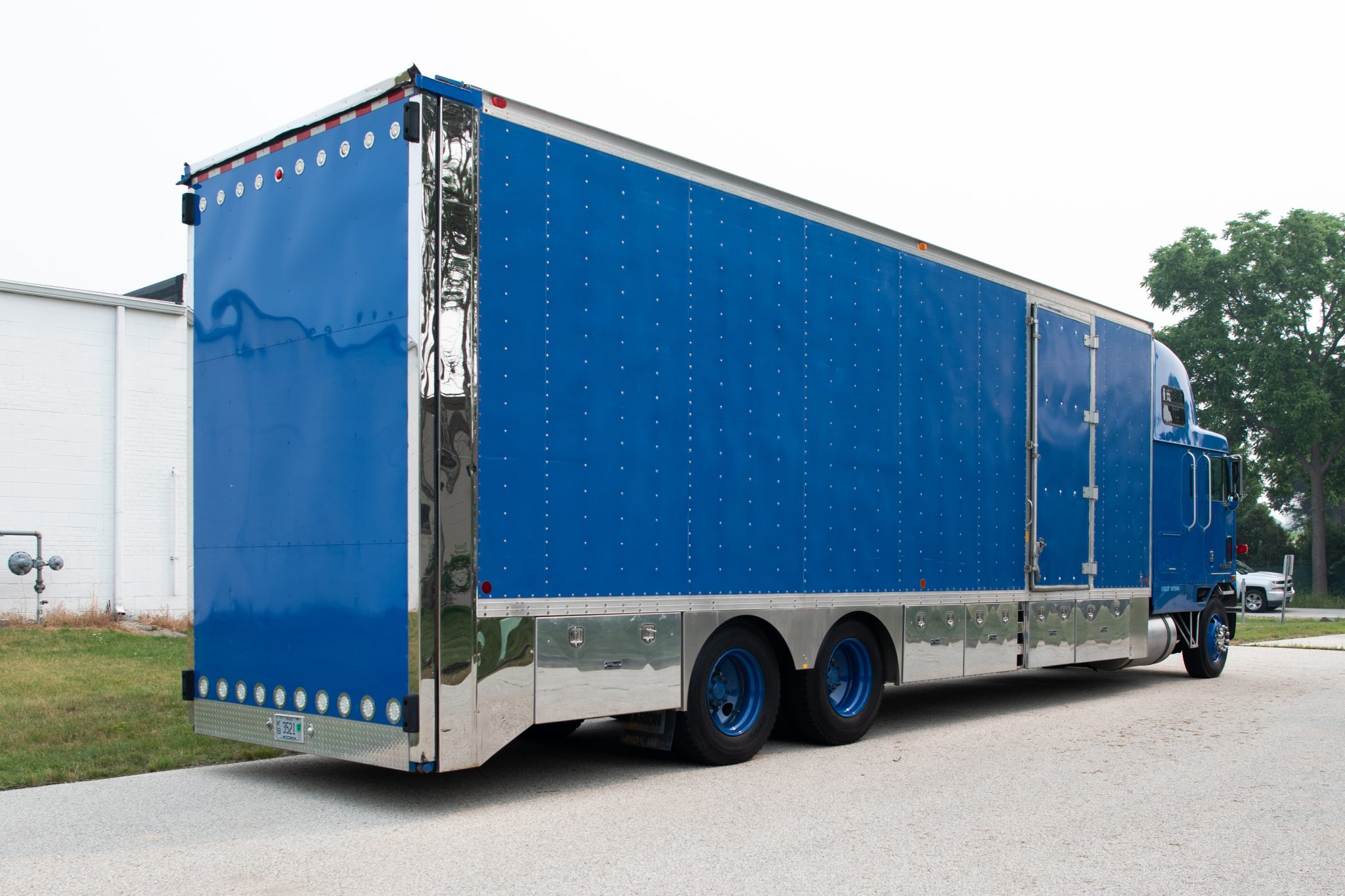 Blue 22.5″ steel wheels are wrapped in a mixed set of 295/75 tires. The truck is equipped with dual rear axles and a rear air suspension system.