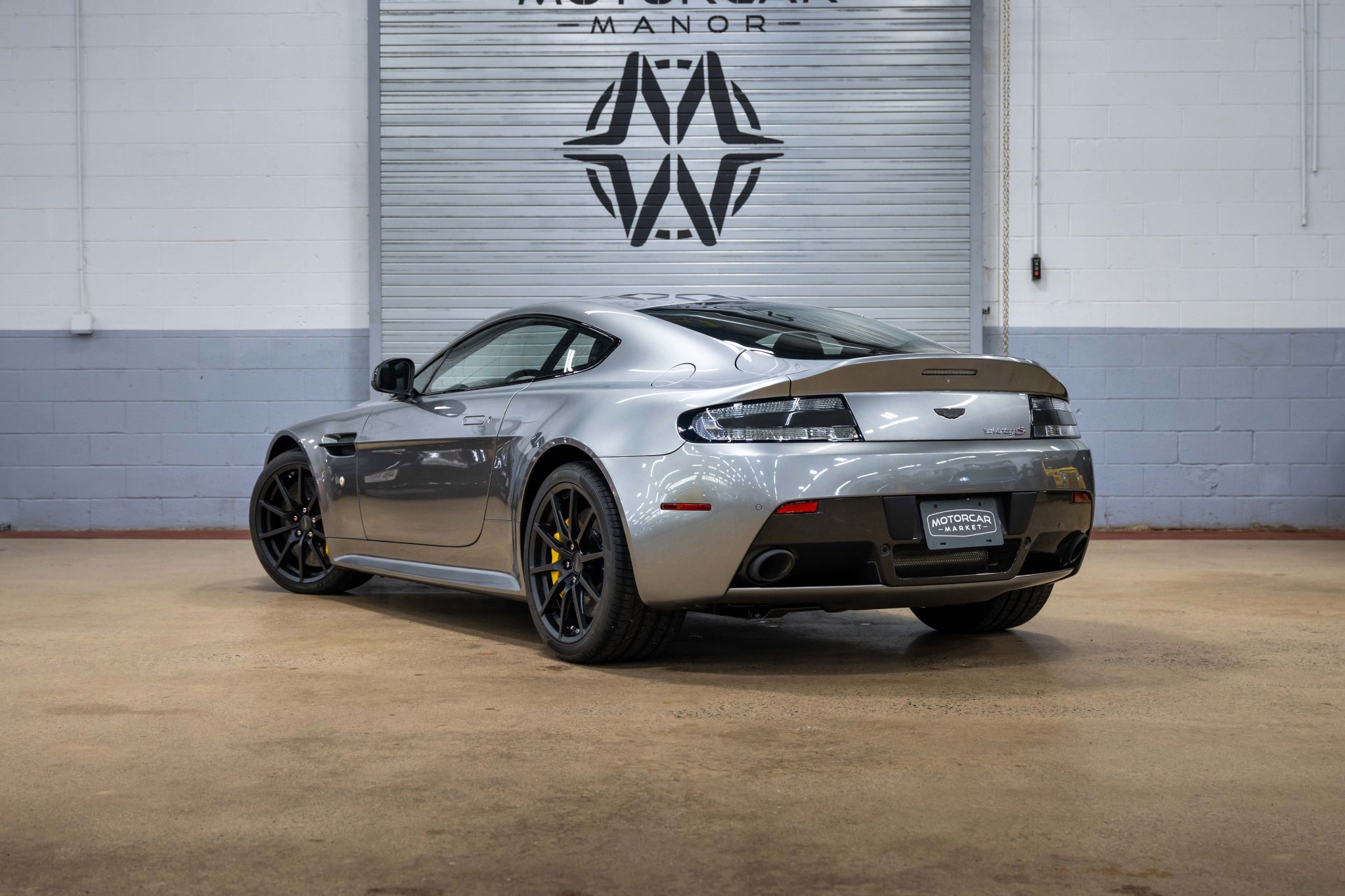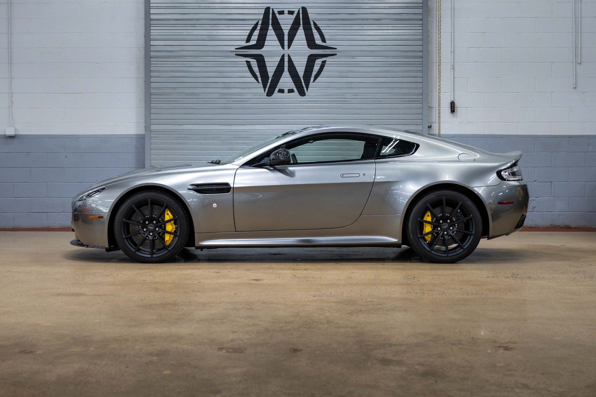 Satin Black-finished lightweight 19″ ten-spoke wheels are wrapped in 255/35 front and 295/30 rear Pirelli P Zero tires. The car is equipped with an Adaptive Damping System (ADS), Emergency Brake Assist (EBA), and Dynamic Stability Control (DSC). Braking is provided by yellow-finished Aston-Martin-branded calipers mounted over carbon-ceramic two-piece rotors at all four corners.