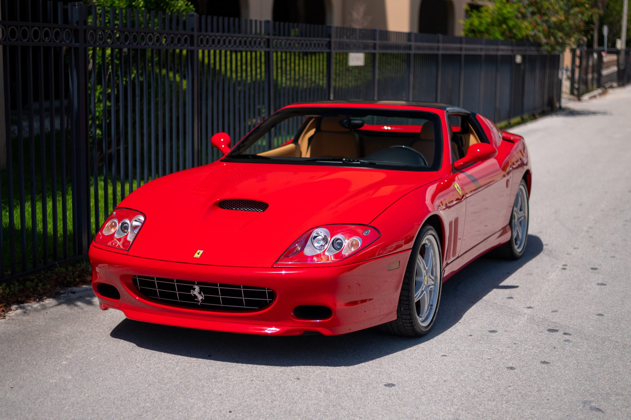 Silver-finished 19″ multi-piece alloy wheels are mounted with Bridgestone Potenza RE050A tires measuring 255/35 up front and 305/30 out back. The car is equipped with Skyhook adaptive dampers, and an upgraded suspension was included with the GTC package. Stopping power is provided by red Ferrari-branded calipers over cross-drilled carbon-ceramic rotors at all four corners, and the brake fluid was flushed in February 2023.