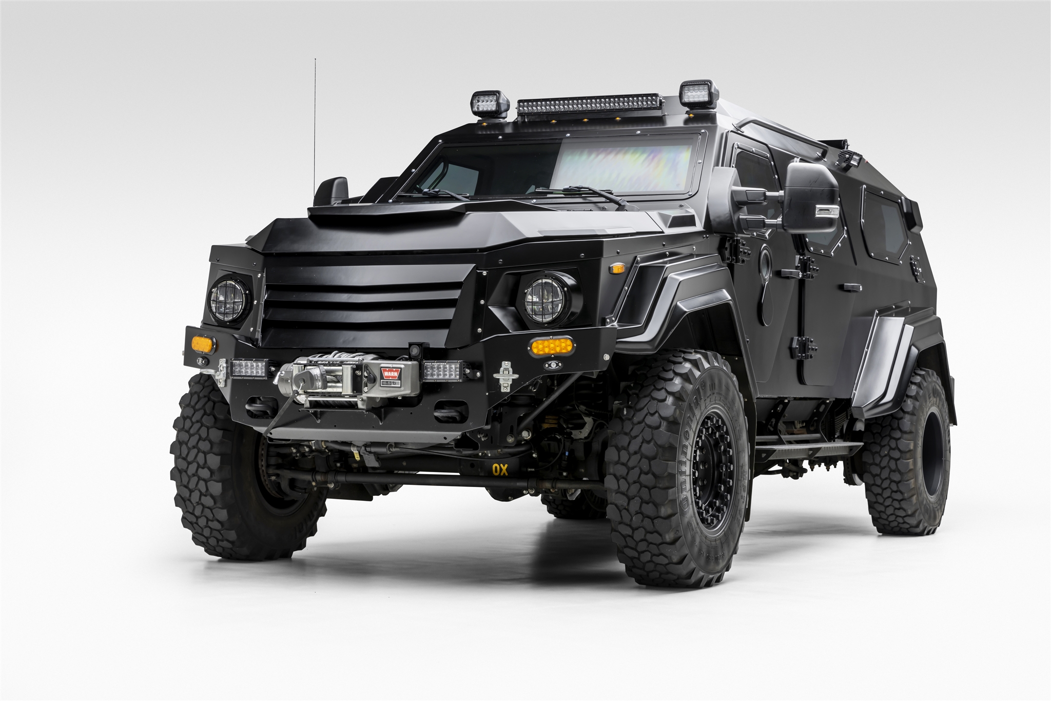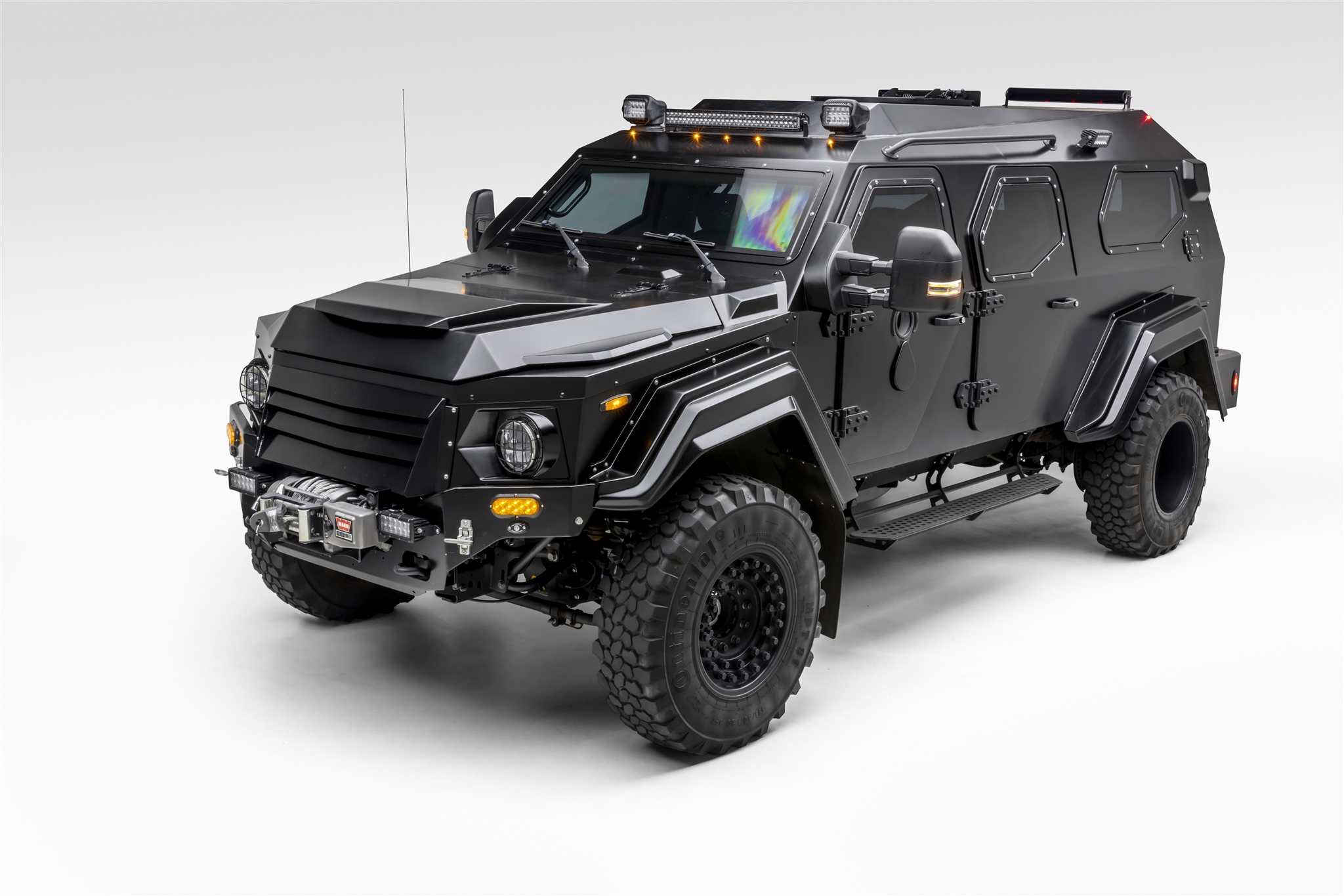 Hutchinson 20″ beadlock wheels wear 335/80 Continental MTP 81 all-terrain tires with run-flat capability, and a matching spare is mounted to the rear of the truck. Equipment includes manually locking front hubs, an onboard air compressor, and air chucks mounted above the side steps. Stopping power is from four-wheel disc brakes.