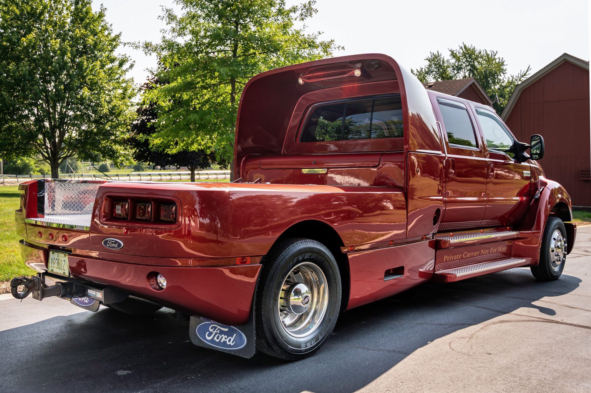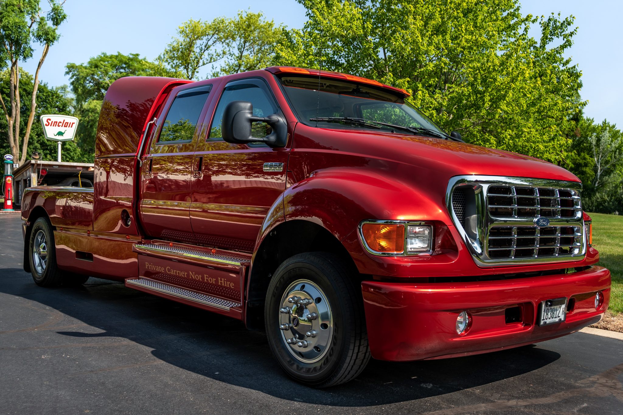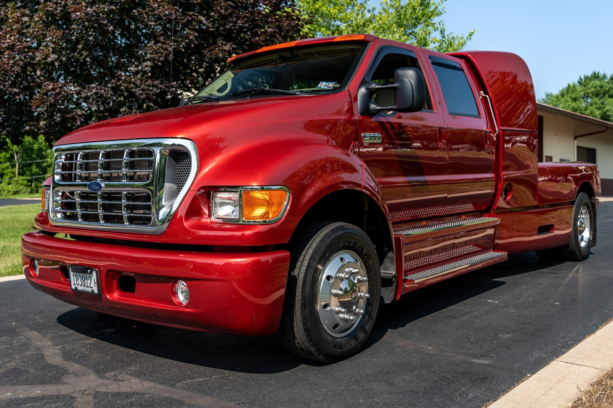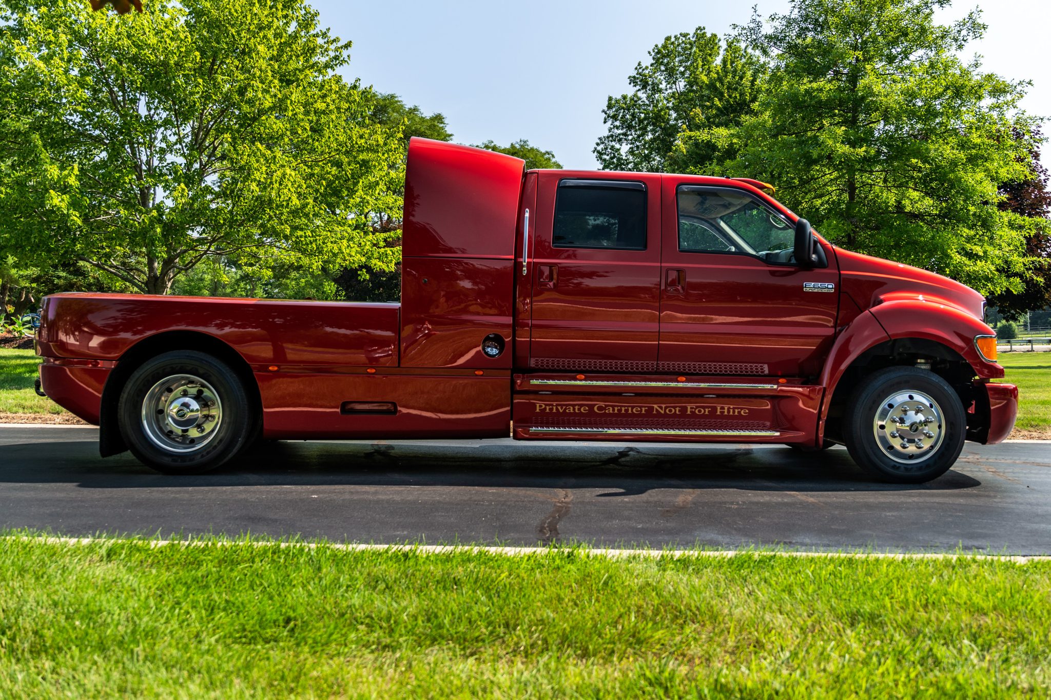 Polished 19.5″ alloy wheels are wrapped in 245/70 Goodyear G647 RSS tires mounted during current ownership. This F-650 rides on a 194″ wheelbase and features a Hendrickson HAS190 single-axle rear air-suspension system. Stopping power is provided by four-wheel disc brakes, and the truck is equipped with an air-powered parking brake.