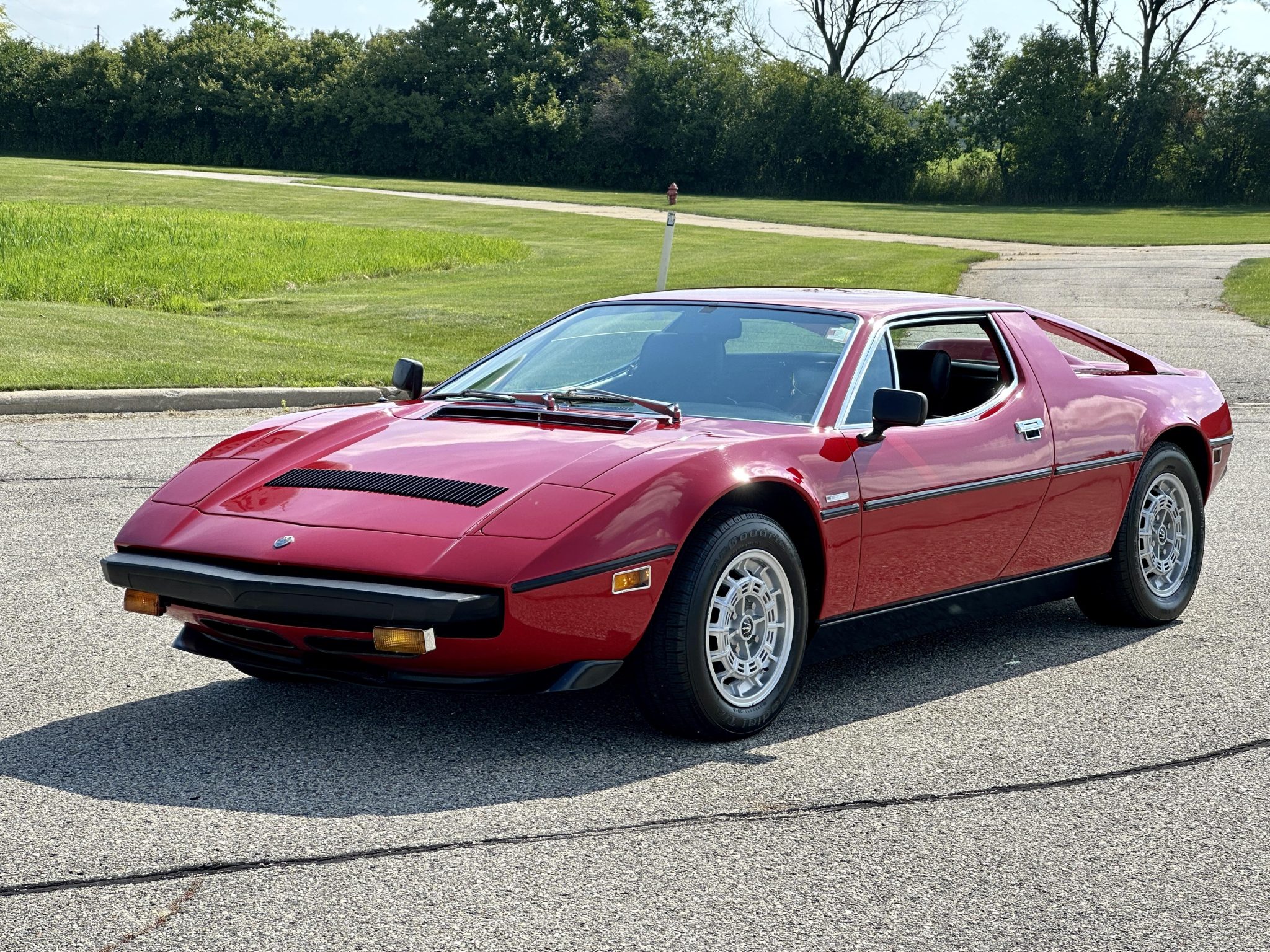 Silver 15″ Campagnolo wheels are mounted with BFGoodrich Radial T/A tires measuring 215/60 up front and 235/60 out back. The Merak rides on a 102.4″ wheelbase and features a fully independent suspension with double wishbones, coil springs, and telescopic shock absorbers as well as front and rear anti-roll bars. Stopping power is provided by a Citroen-sourced hydraulically boosted ventilated disc brake system. Imperfections in the paint are visible on the wheels, and the selling dealer notes that the tires are dry rotted.