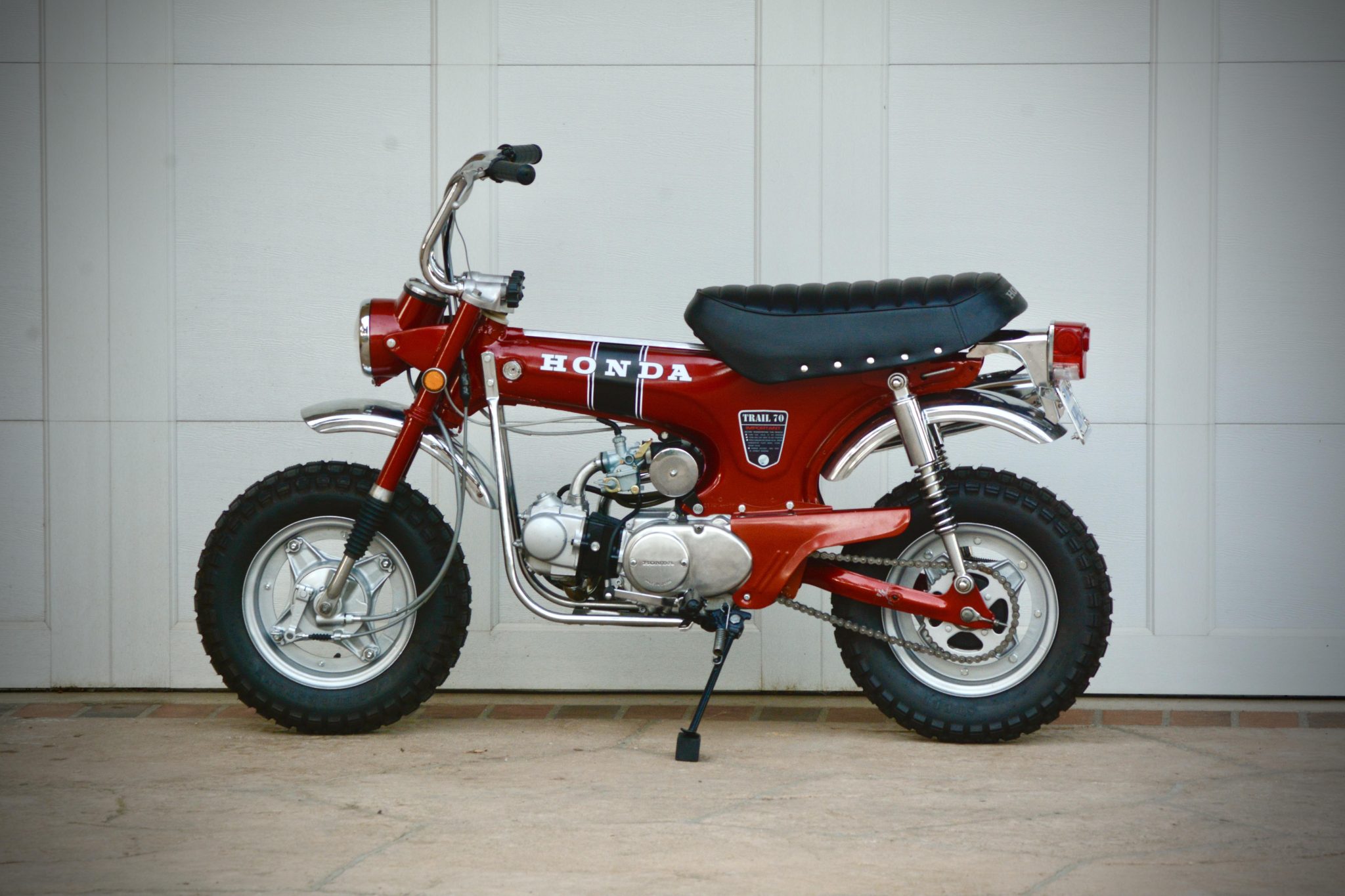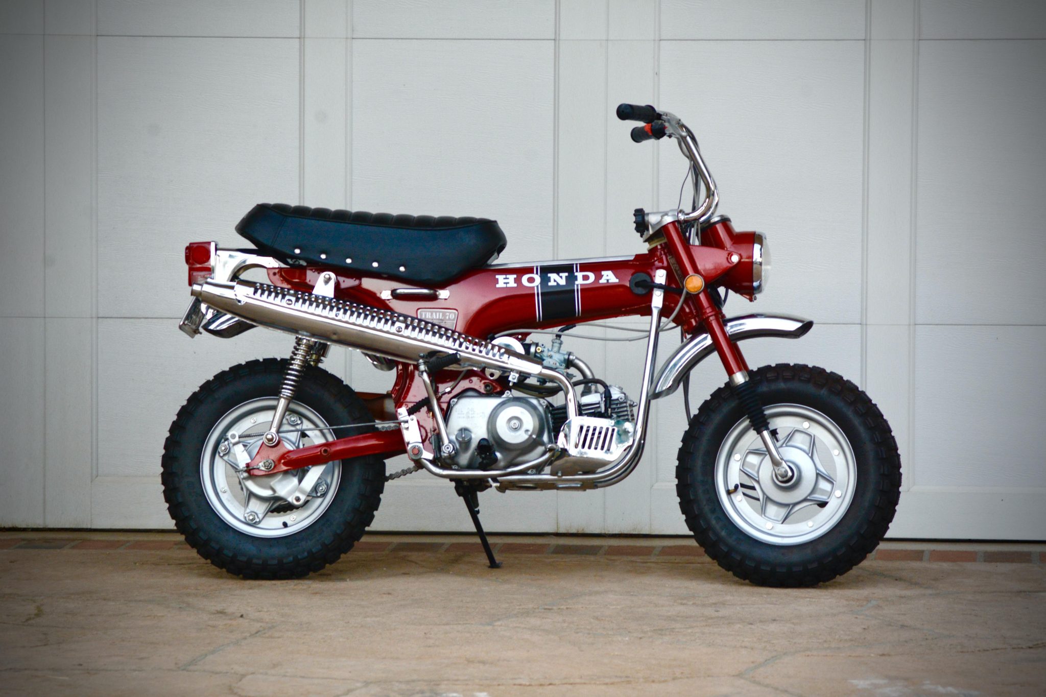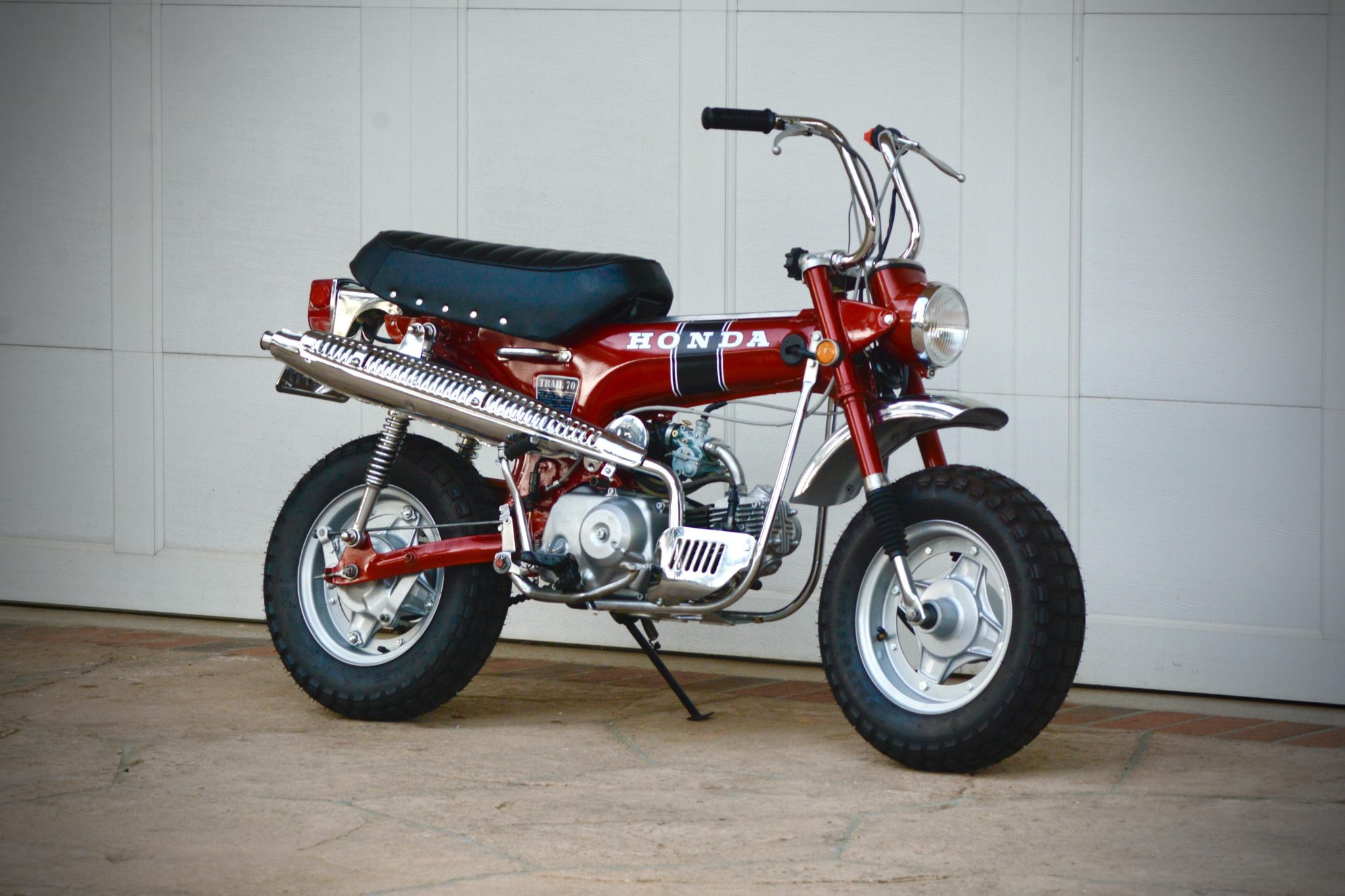 Silver-finished 10″ three-piece wheels wear 4.00″ Bridgestone Trail Wing tires. Suspension consists of an inverted fork with rubber gaiters as well as dual shocks mounted to the swingarm, and braking is handled by drums at both ends.
