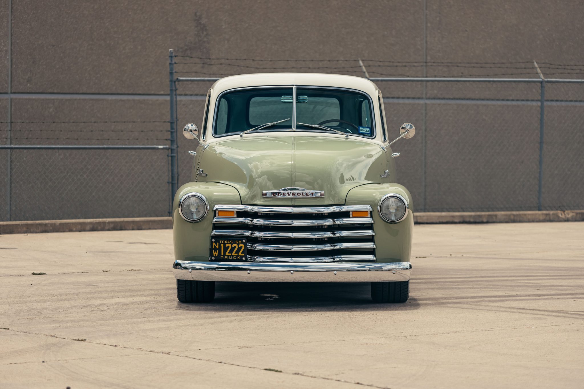 Circle Racing 18″ aluminum wheels are finished in white and mounted with 275/45 Michelin Primacy tires up front and Michelin Pilot Sport tires out back. Stopping power is from four-wheel Brembo disc brakes with slotted rotors, a Wilwood master cylinder, and a Hydratech hydraulic brake booster. The truck is equipped with an Art Morrison chassis, a fully independent suspension system, and coilover shock absorbers.