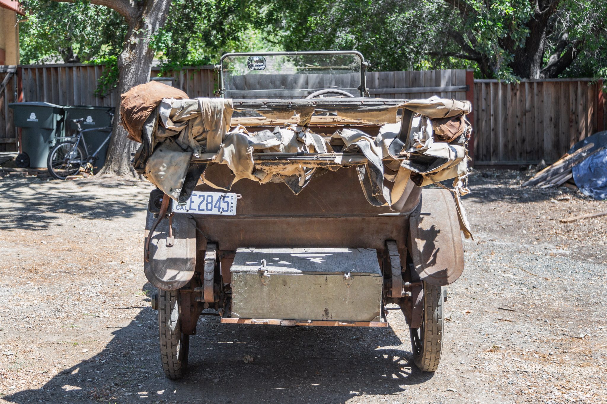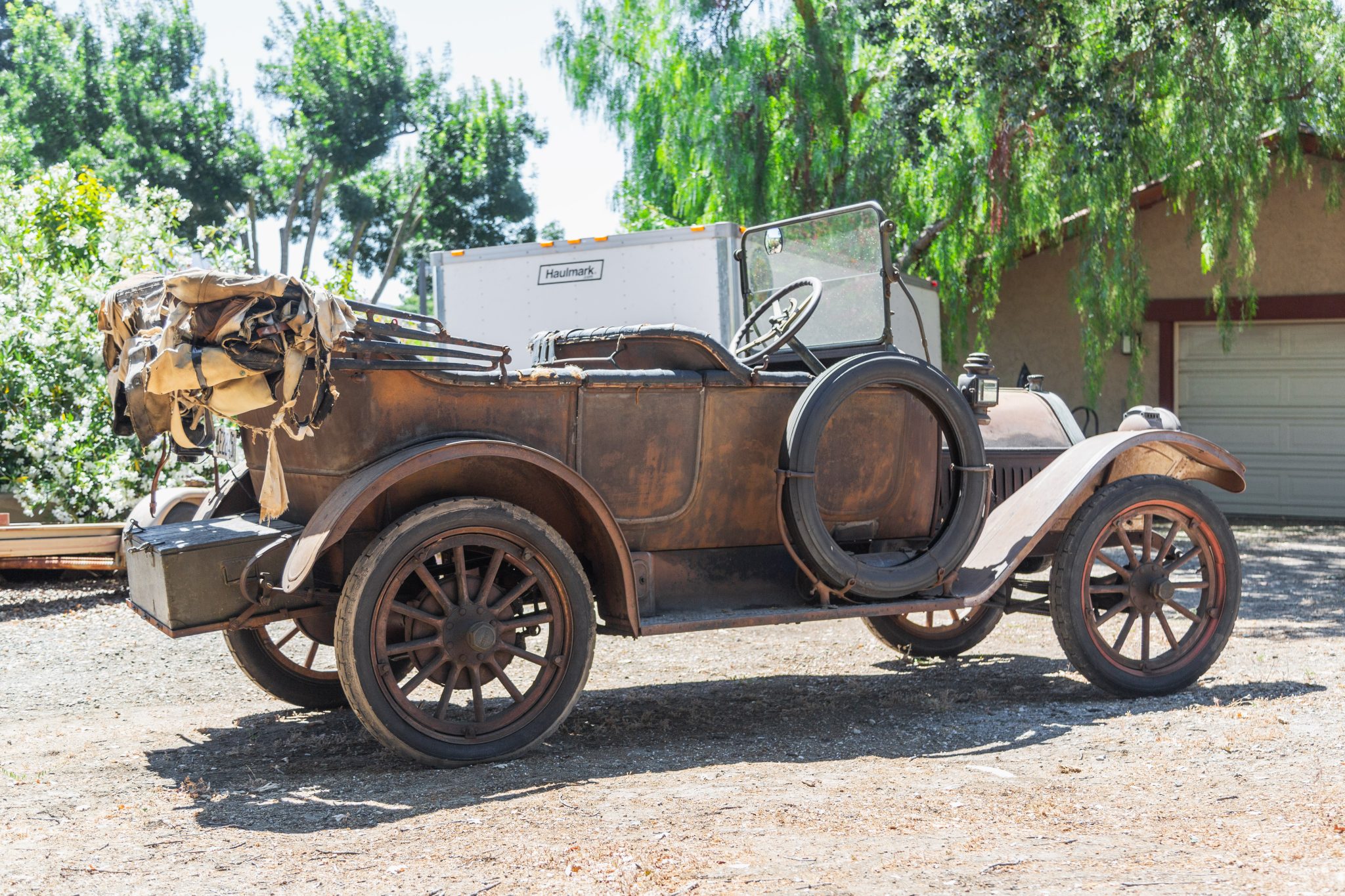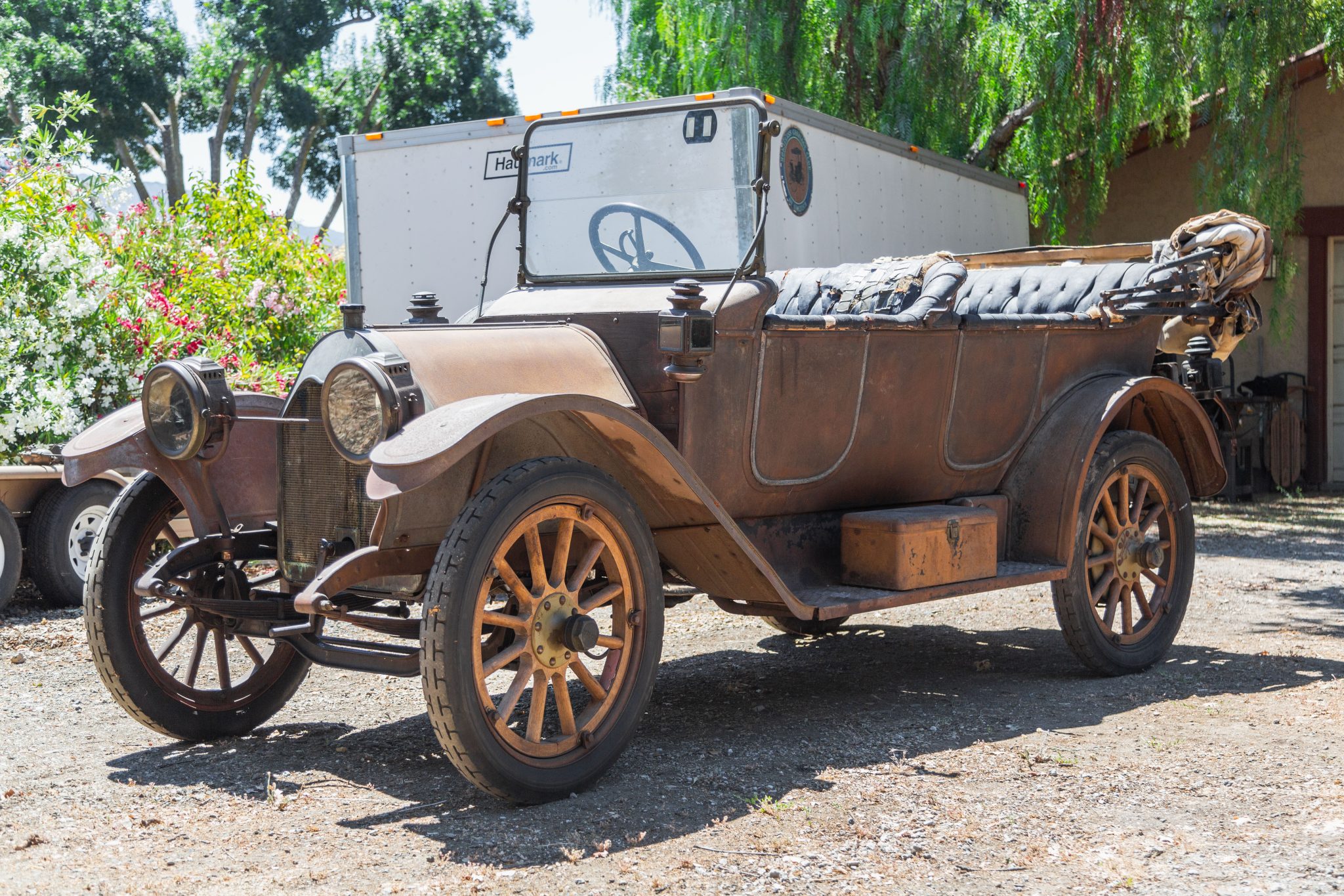 The wood spoke wheels feature Baker steel rims and Oakland-branded center caps, and they are mounted with 34×4″ Goodrich Silvertown Cord bias-ply tires. Replacement steel rims and wood spokes were installed on the left-side wheels under the seller’s ownership. A spare Universal tire is mounted on the right running board. The Model 40 rode on a 112″ wheelbase and featured front semi-elliptical leaf springs and rear ¾-elliptical leaf springs. Stopping power is provided by rear mechanical drum brakes.