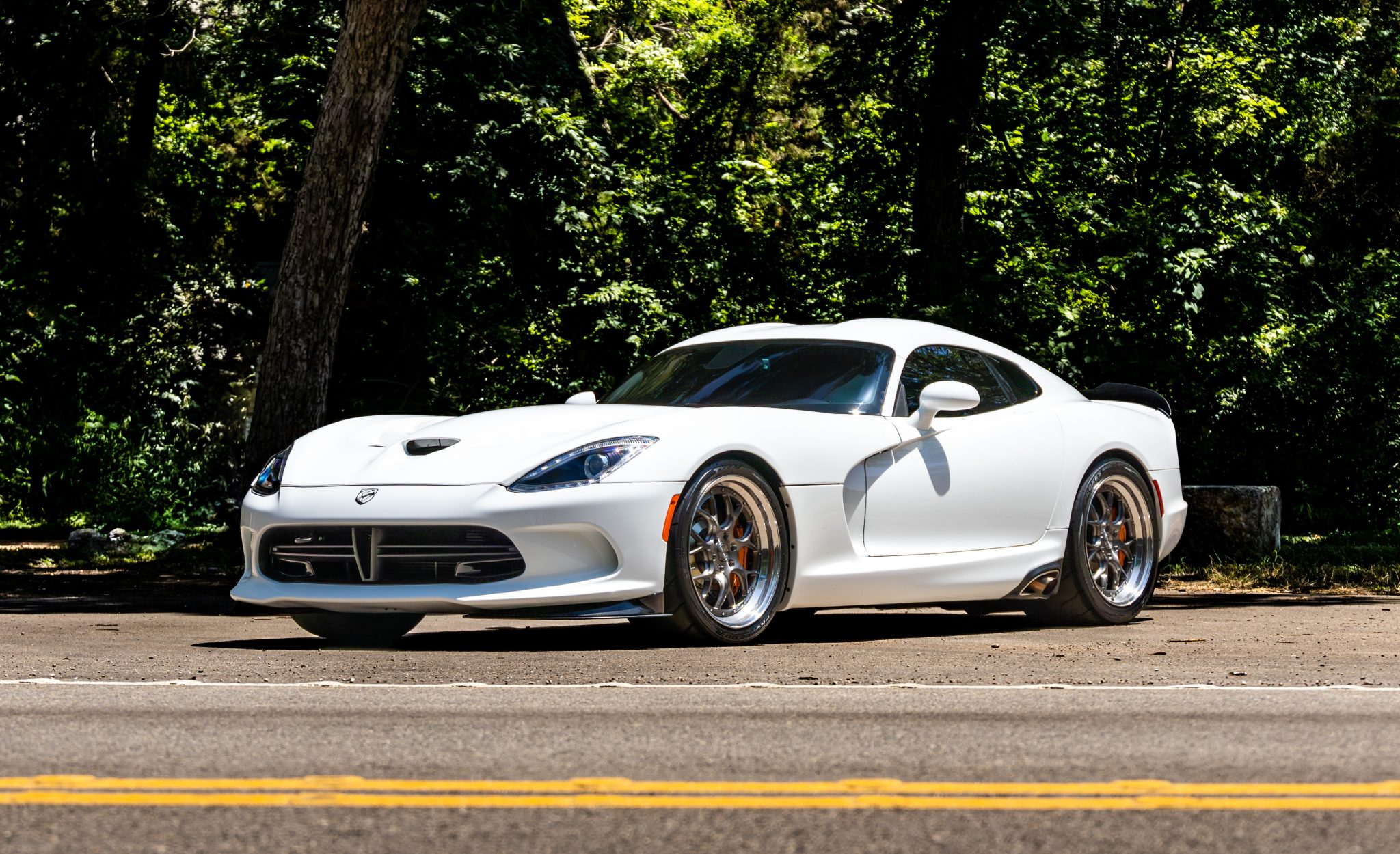 Aftermarket 19″ AL13 wheels are wrapped in Toyo Proxes R888R tires measuring 295/30 up front and 345/30 out back. Stopping power is provided by orange-finished Brembo calipers over StopTech ventilated and cross-drilled discs at all four corners.