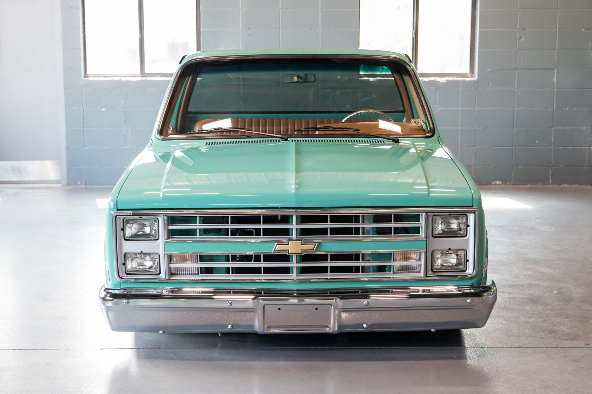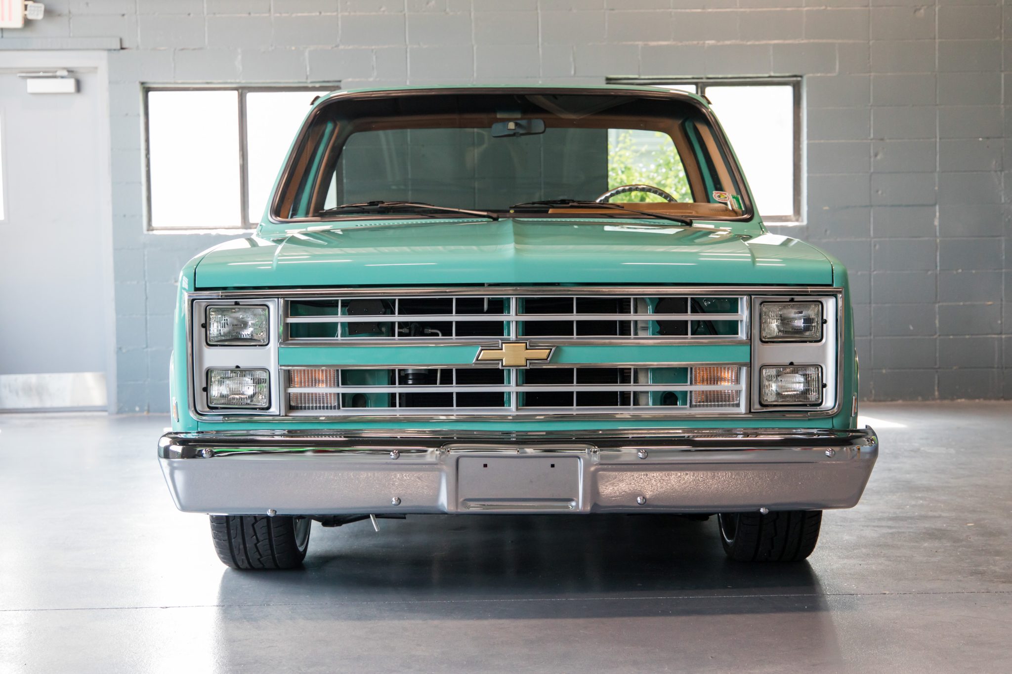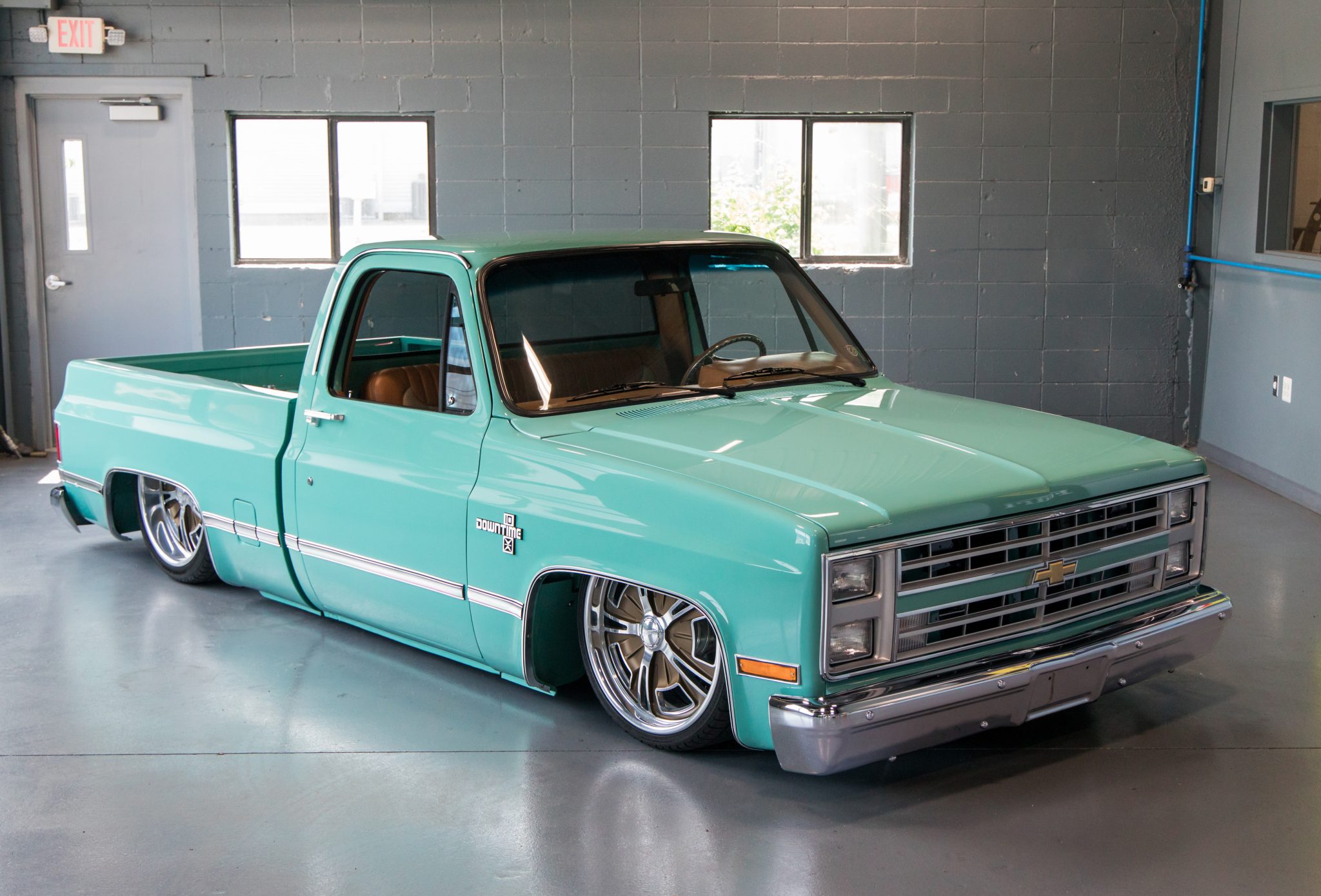 Staggered-width 22″ Schott alloy wheels are mounted with 255/30 and 285/35 Ironman iMove tires. Stopping power is from Wilwood calipers over drilled and slotted rotors up front and drums in back. The truck is equipped with power rack-and-pinion steering as well as an air suspension system that includes front and rear drop members, Belltech 3″ drop spindles, Firestone and Slam Specialties air springs, KYB shocks, Strong Arms tubular front control arms, and a four-link rear setup with an adjustable Panhard bar. The frame was powder coated under prior ownership.