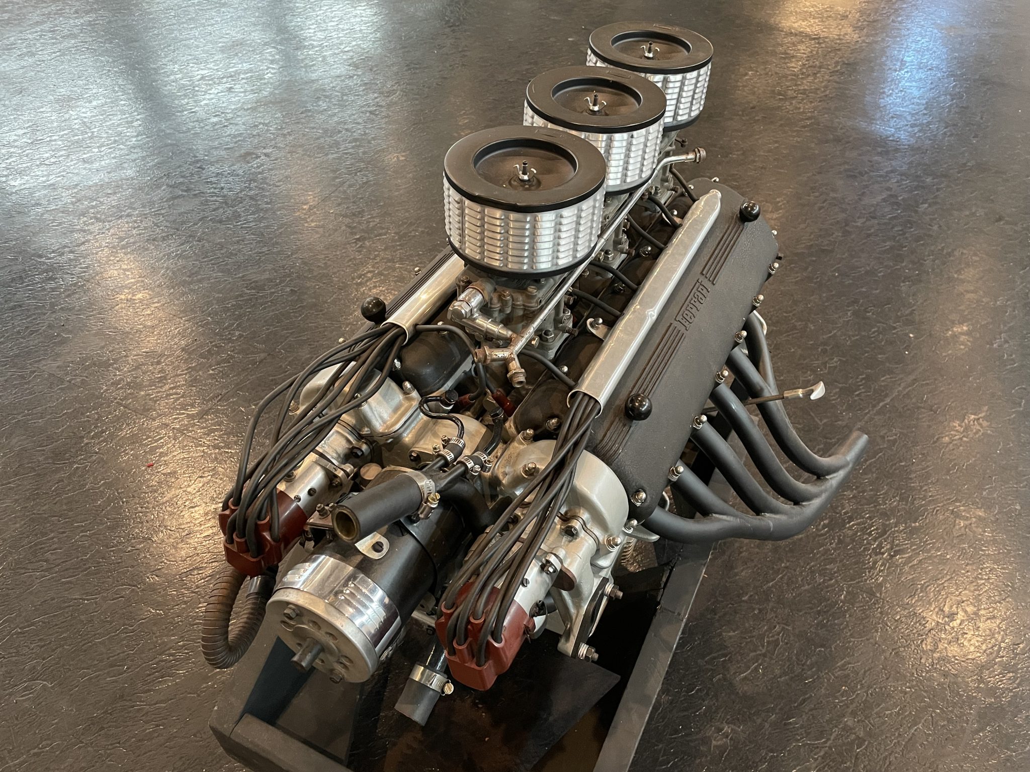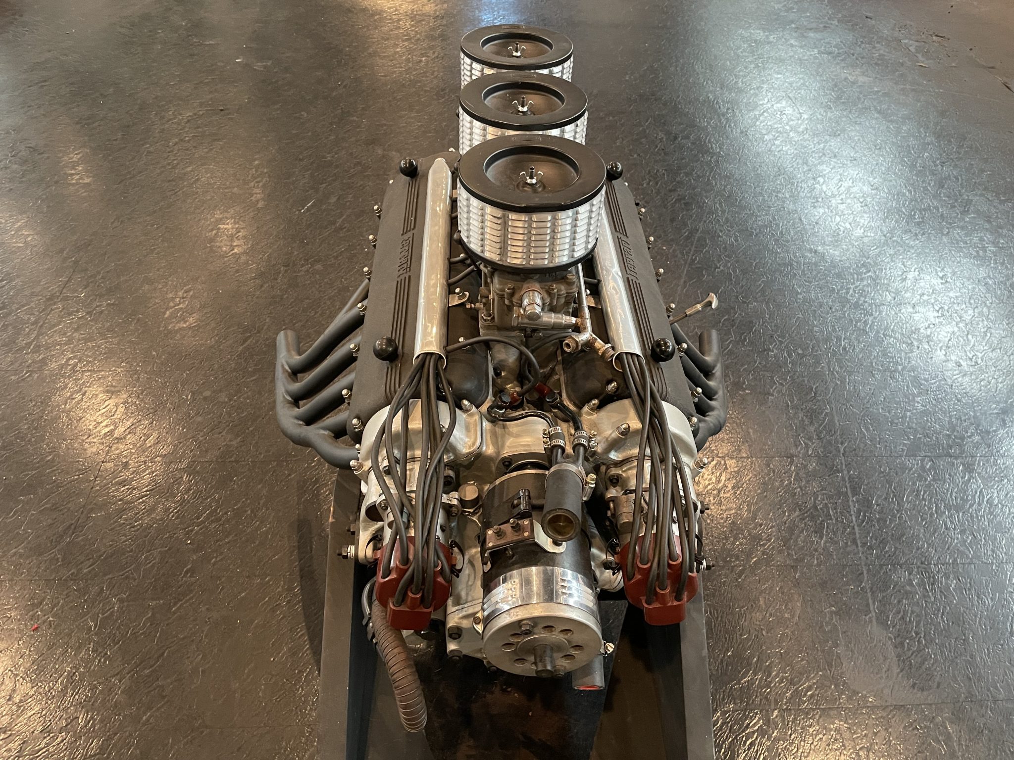 Three Weber 36DCZ3 twin-barrel 36mm downdraft carburetors are fitted with linkage and topped by louvered air cleaners. Additional installed components consist of black-finished valve covers, a dipstick, dual distributors, spark plugs and wires, a flywheel, and a generator. The seller notes that the exhaust headers have been repaired with body filler and should be replaced prior to use.