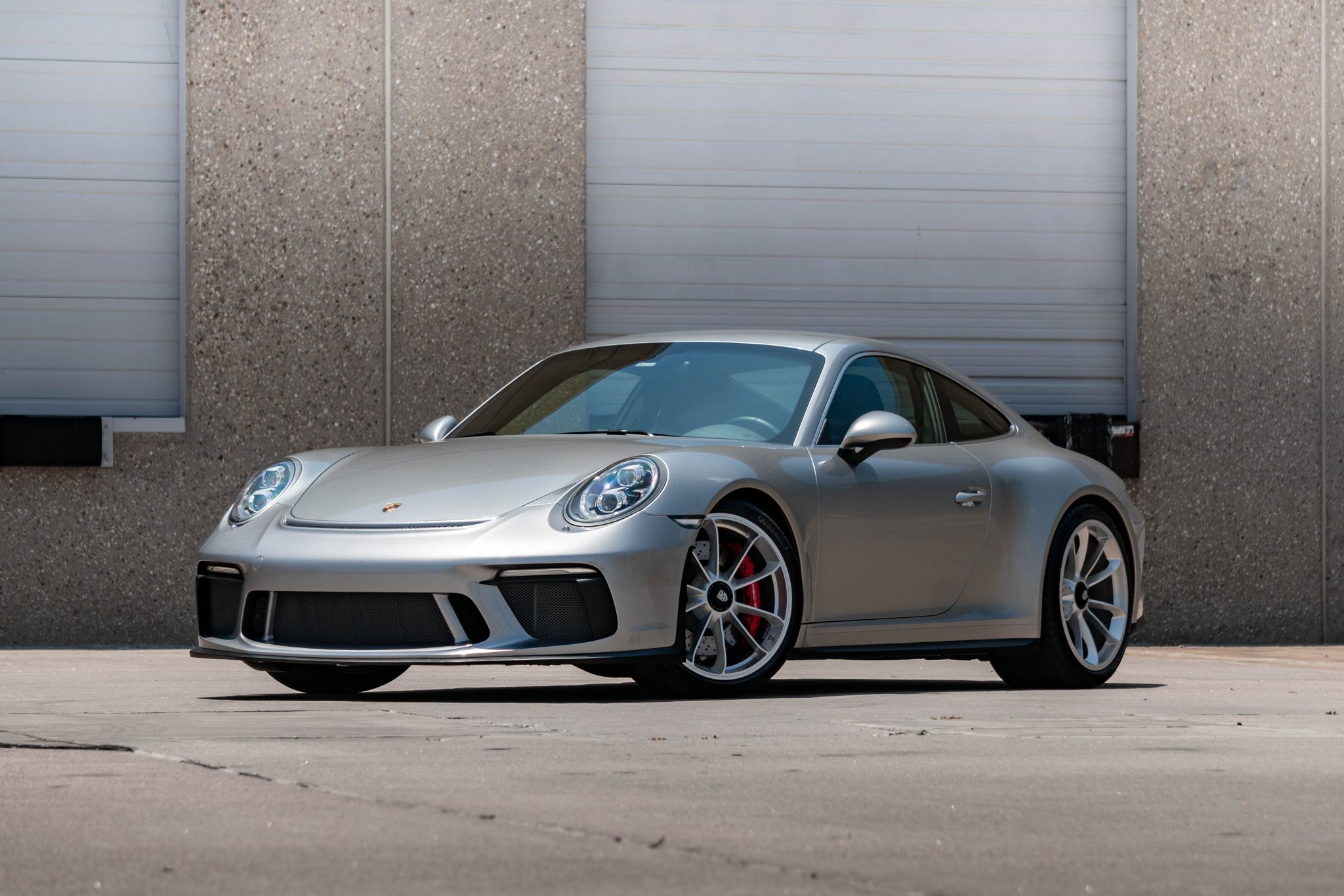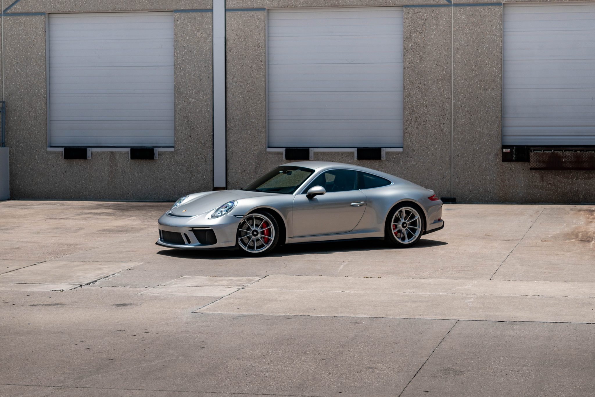 The 20″ center-lock alloy wheels are mounted with 245/35 front and 305/30 rear Michelin Pilot Sport Cup 2 tires showing 2018 and 2019 date codes. Braking is handled by red Porsche-branded calipers over cross-drilled and ventilated discs, and the car is equipped with a front-axle lift system.