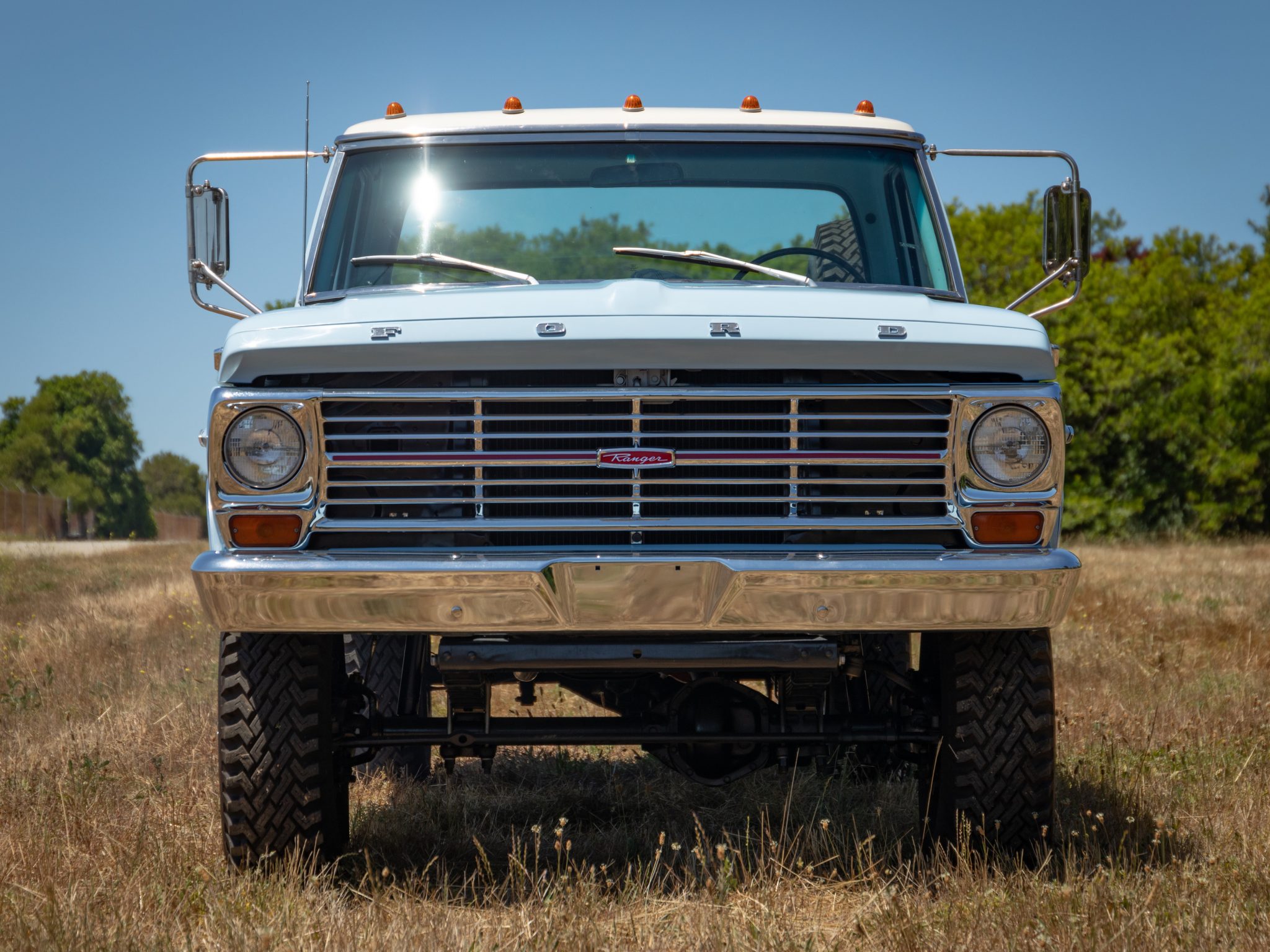 White-finished 16″ steel wheels are mounted with 9.00x16LT Specialty Tires of America Superlug tires, and a matching spare is mounted inside the bed. The truck is equipped with power steering and manually locking front hubs. The braking system has reportedly been modified with front disc brakes with four-piston calipers sourced from a later model F-250 as well as a Corvette-sourced master cylinder and a Classic Performance Products brake distribution block. The seller reports the steering box has been replaced.