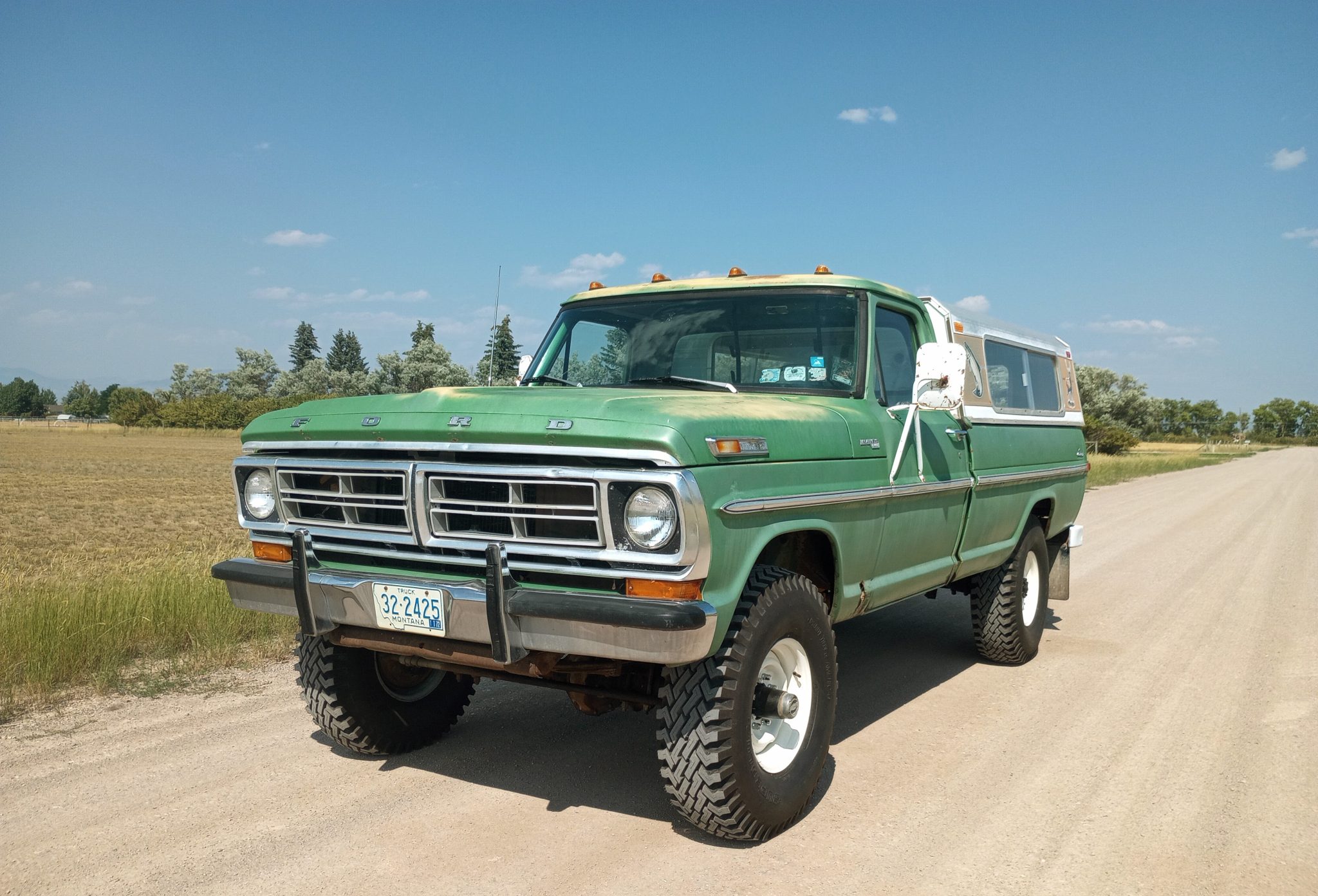 White-finished 16″ steel wheels are wrapped in 9.00-series STA Superlug bias-ply tires. The truck is equipped with power-assisted drum brakes and Warn manually locking front hubs.