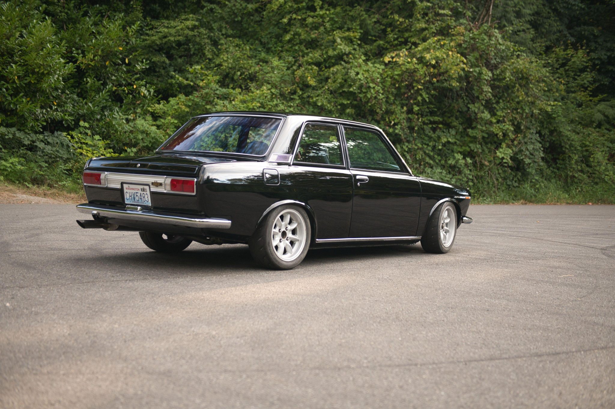 Silver-finished 15″ Panasport alloy wheels are mounted with 195/50 Toyo R888r tires. The suspension has been modified with coilovers up front, rear lowering springs and alignment brackets, a 1″ front sway bar, and adjustable camber plates. Stopping power is provided by front disc and rear drum brakes. The seller reports the tie rods and ball joints have been replaced and notes wear on the wheels.