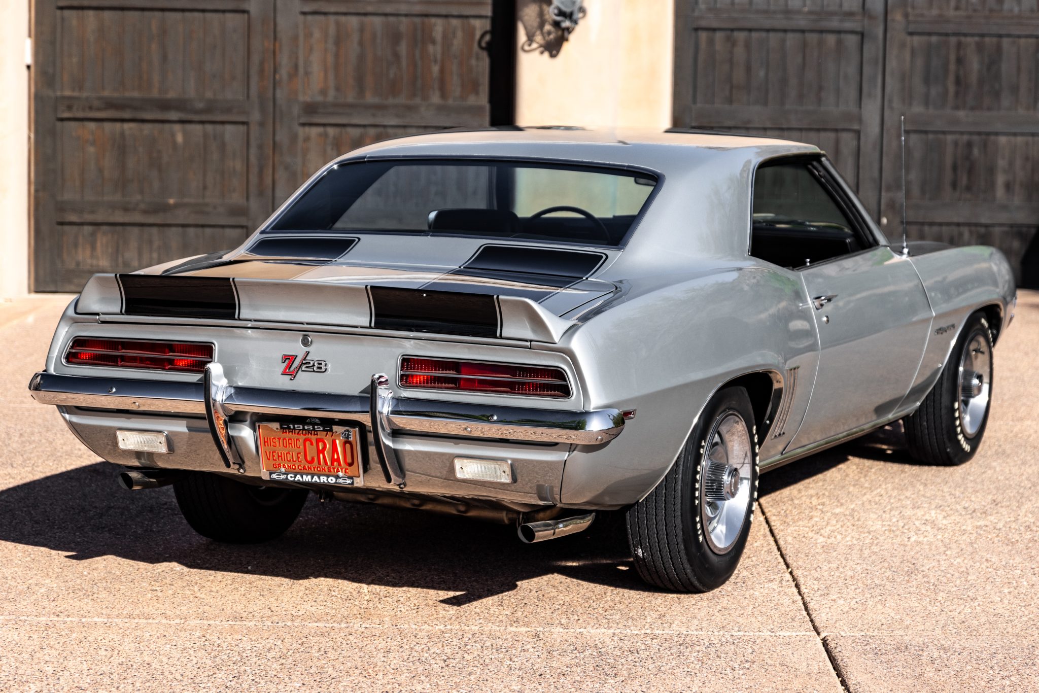 Silver-painted 15″ Rally wheels wear polished trim rings and hubcaps and are mounted with Goodyear Wide Tread GT bias-ply tires. A matching spare wheel and tire are mounted in the trunk along with a jack. Power-assisted steering was equipped from the factory, and braking is handled by power-assisted front discs and rear drums.