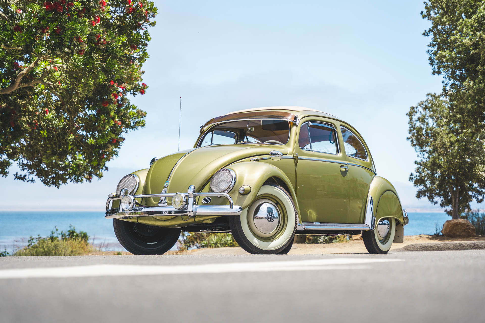 Body-color 15″ steel wheels wear chrome VW-branded hubcaps and are wrapped with Firestone whitewall tires, while a matching spare is mounted in the front trunk. Braking is handled by four-wheel drums.