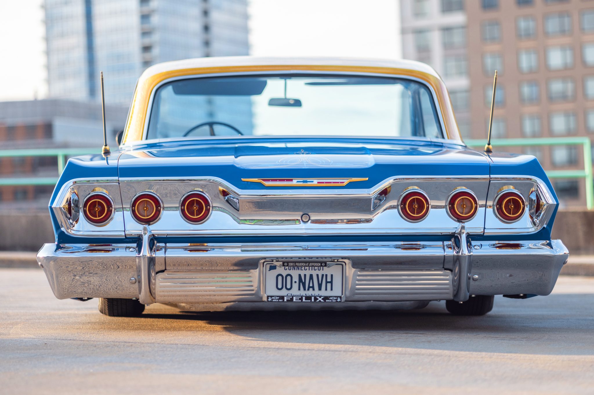 Gold-finished Dayton 13” wire wheels are secured with two-eared spinners and mounted with 155/80 Travelstar UN106 whitewall tires. The car is also equipped with power-assisted four-wheel disc brakes, extended front control arms, and a custom rear-end wishbone.