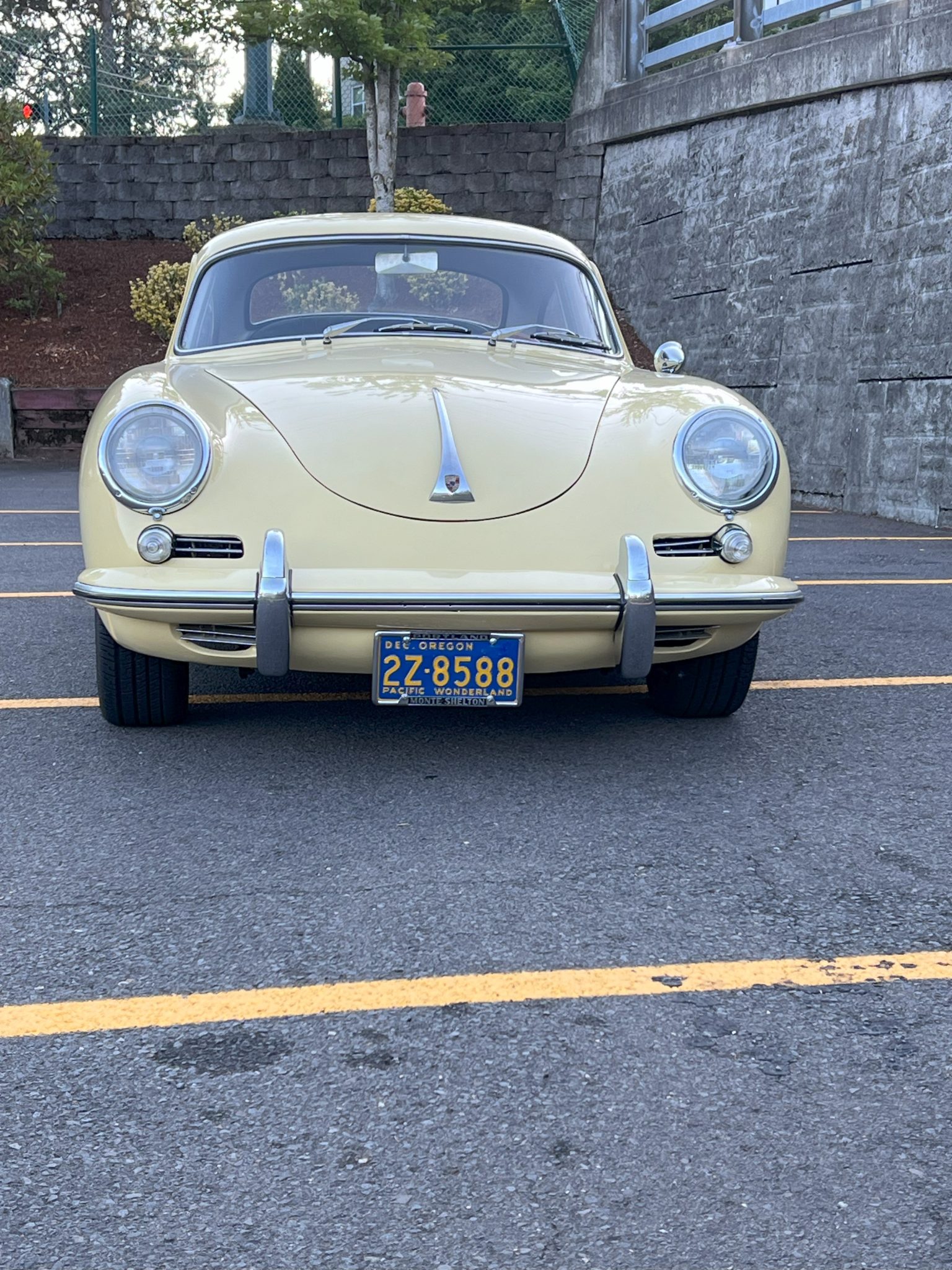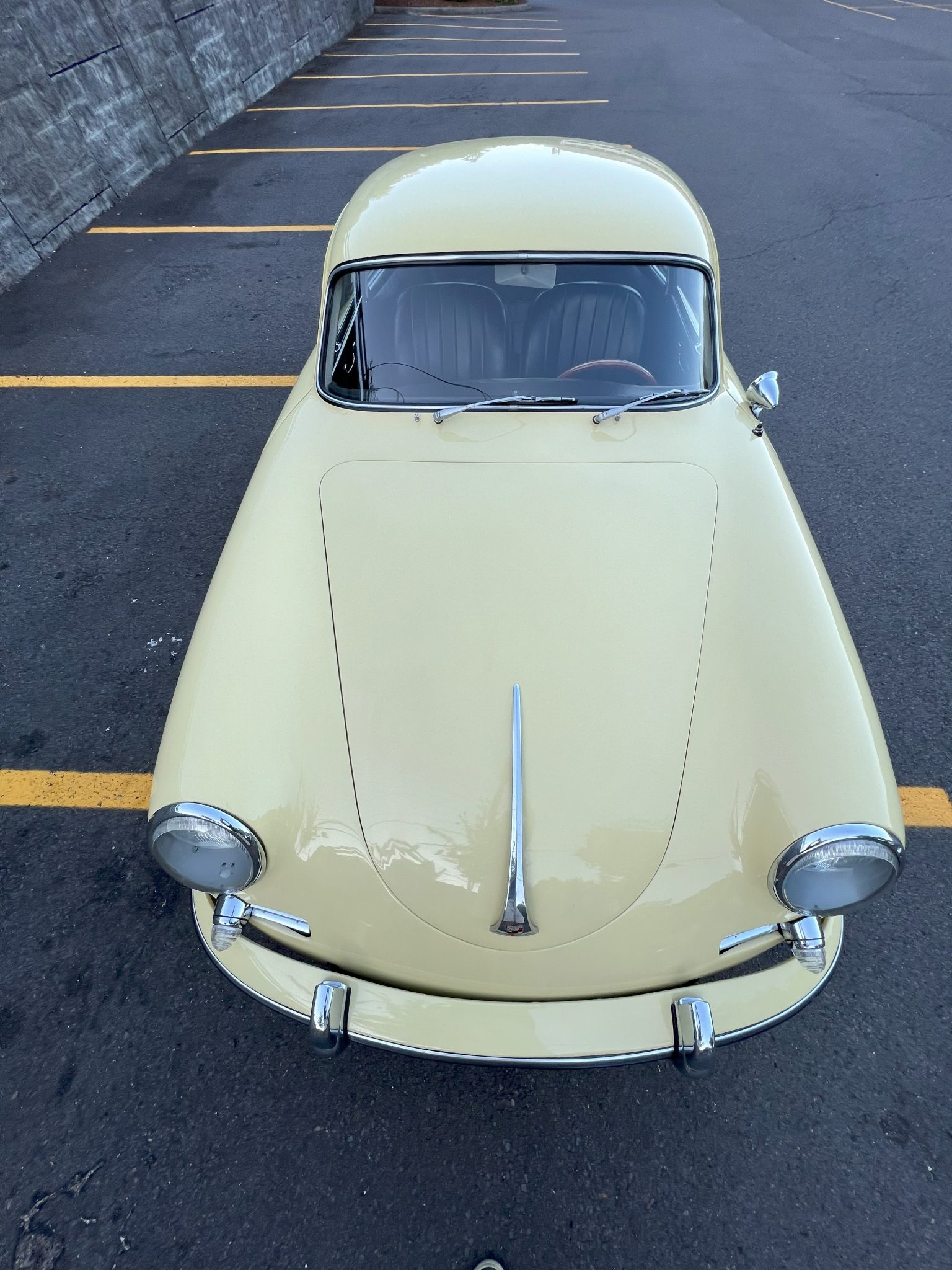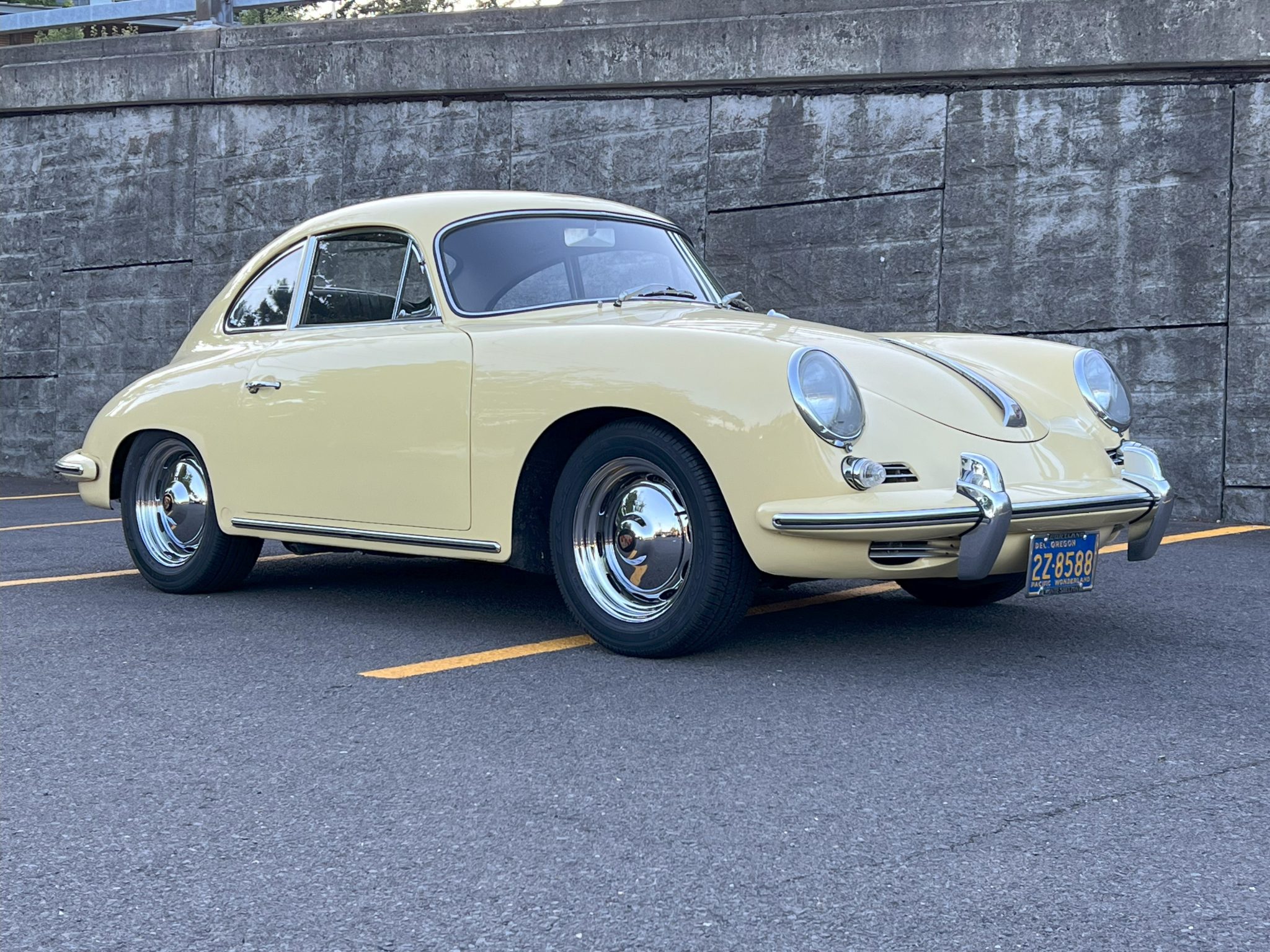 Chrome 15″ steel wheels wear Porsche-logo hubcaps and were mounted with 195/60 Goodyear Eagle RS-A tires in July 2023. A spare wheel with an older tire is mounted in the front trunk. Koni Classic shocks are fitted, and stopping power is provided by finned drums at all four corners. In April 2023, the wheel cylinders were rebuilt and a brake fluid flush was carried out.
