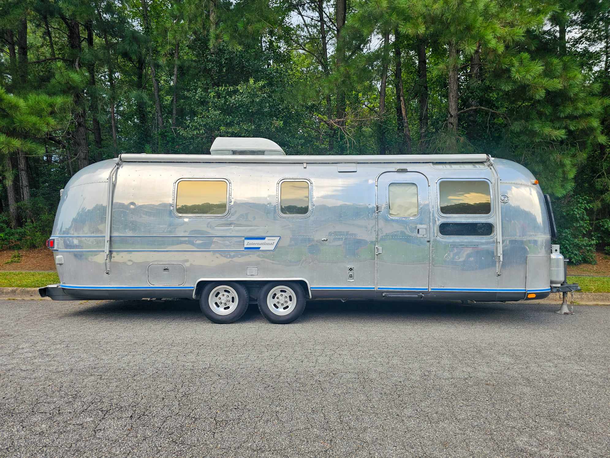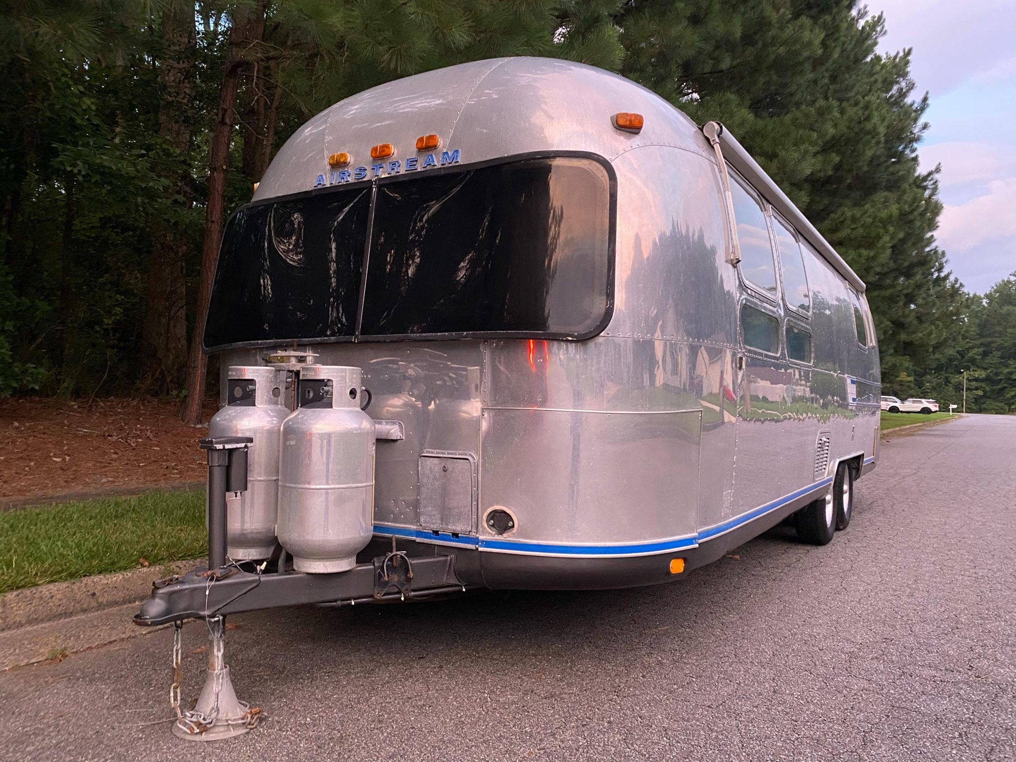 Five-slot 15″ alloy wheels are mounted with 225/75 Hi-Run tires that show date codes from 2013, while a spare is mounted to the underside. Stopping power is from electrically activated drum brakes that were reportedly installed under prior ownership. Equipment includes dual house batteries, two tongue-mounted propane tanks, four stabilizer jacks, a power-operated tongue jack, and shore connections for water and 30-amp electrical service. The propane regulator is said to have been replaced in 2013. The freshwater tank leaks, and the seller notes that one of the house batteries is in need of replacement.