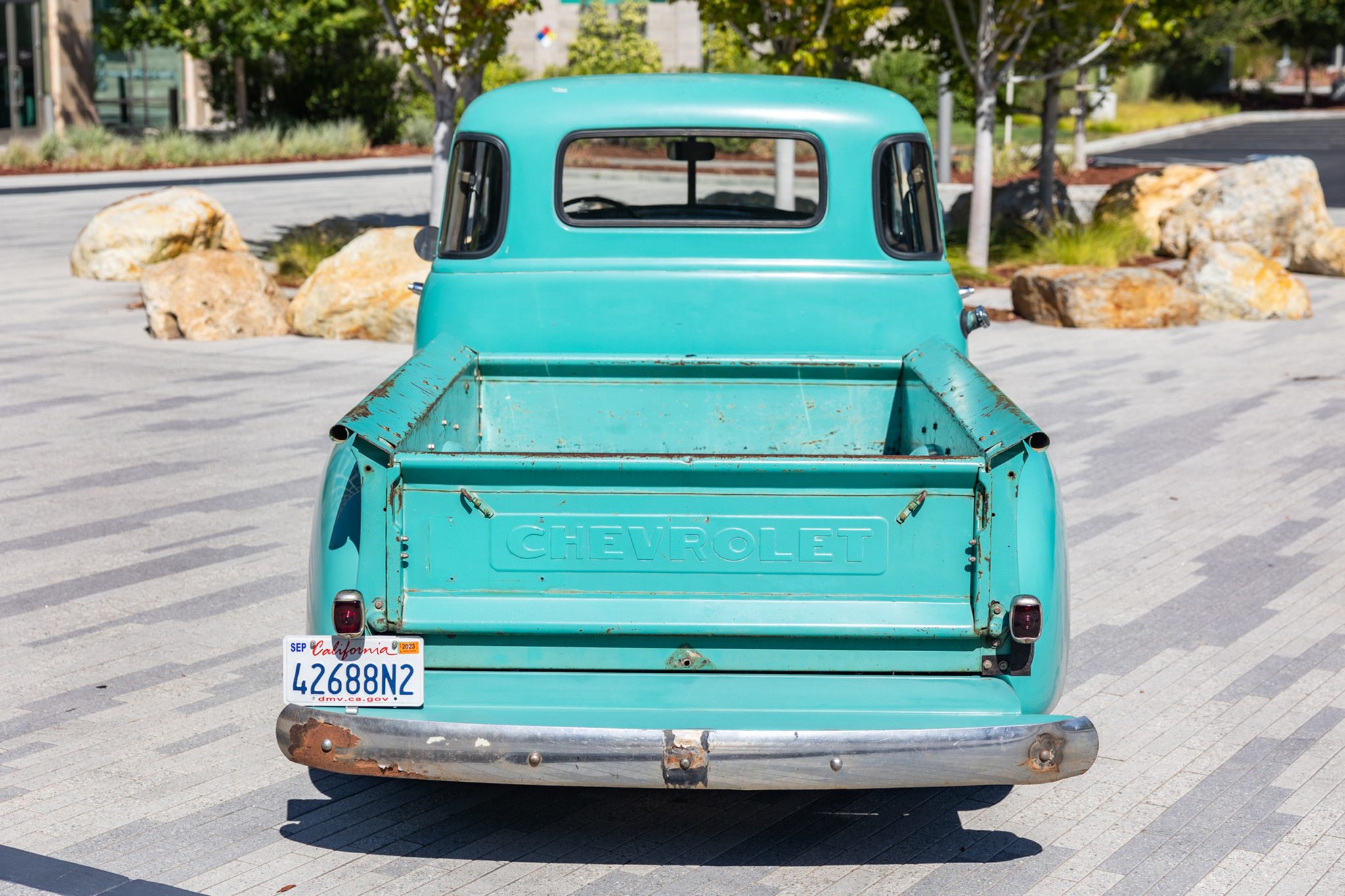 Circle Racing 18″ artillery-style aluminum wheels are finished in blue and wear Chevrolet branded hubcaps. Michelin Pilot Sport 4 tires measuring 275/45 are mounted at all four corners. The fabricated steel Art Morrison chassis incorporates rack-and-pinion steering, tubular front control arms, an independent rear suspension, and adjustable Strange Engineering coilovers. The truck has been fitted with power steering, and braking is handled by a Hydratech power brake system with red-finished Brembo calipers over slotted rotors.