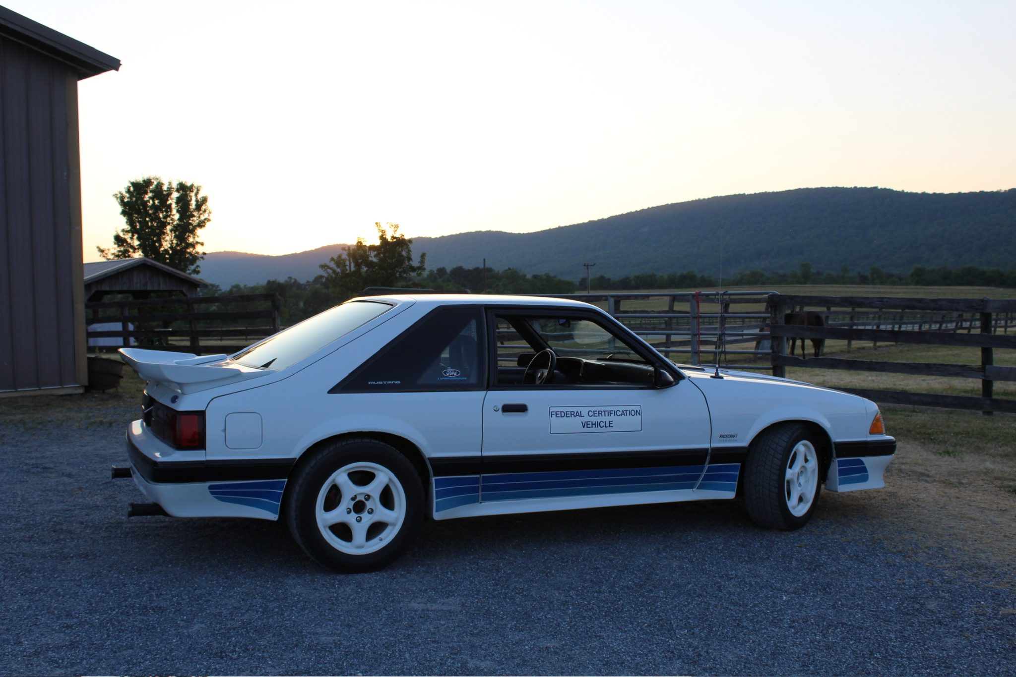 White 16″ DP-5 SCC wheels wear older 225/50 General XP 2000Z tires. Saleen installed SVO-style four-wheel disc brakes and cockpit-adjustable Monroe Formula GP shocks and struts. The front wheel bearings were adjusted in May 2023.