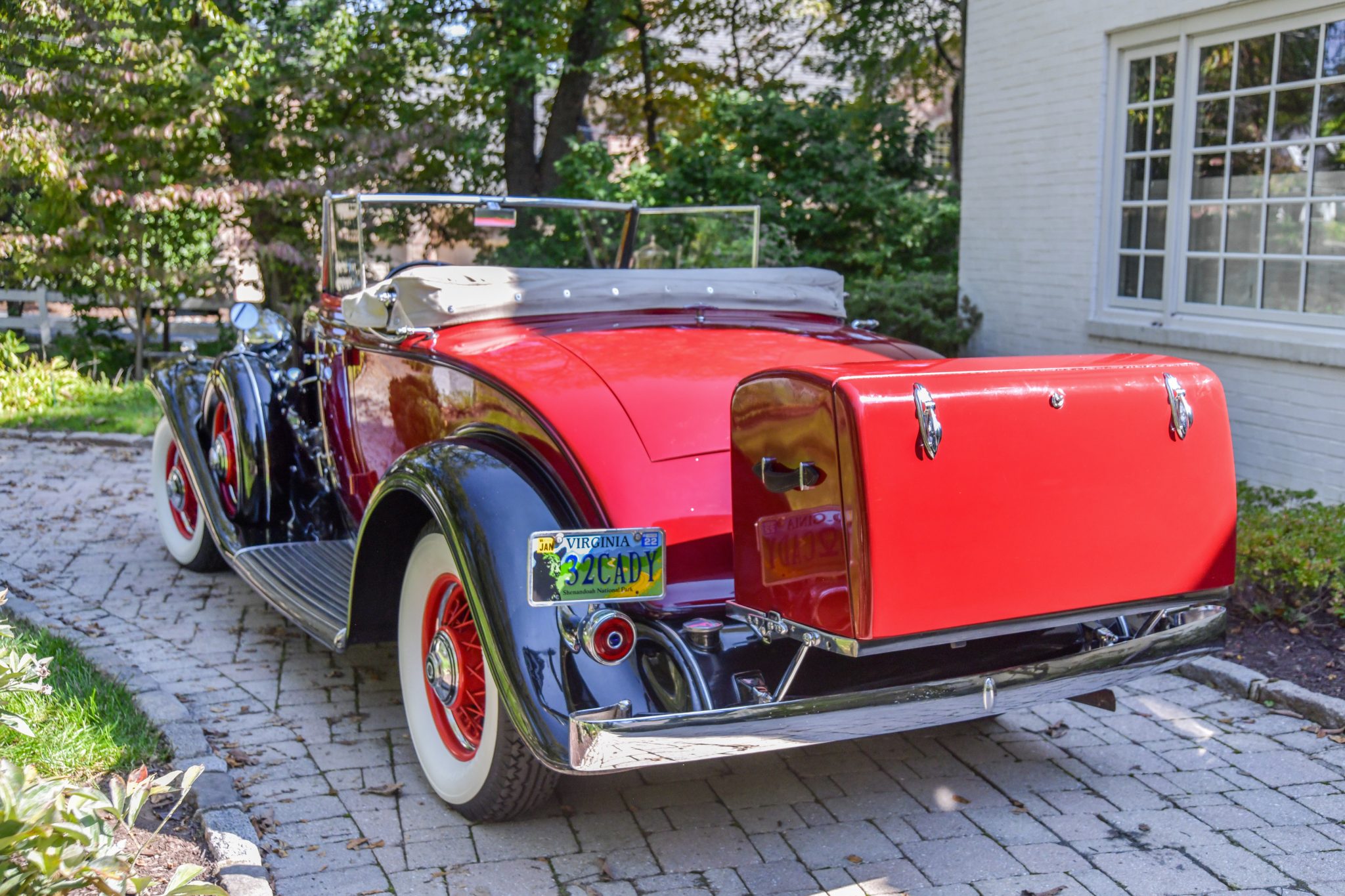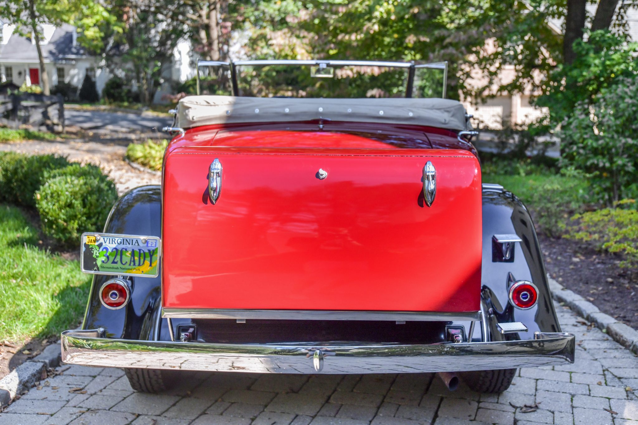 The wire wheels are painted bright red and wear center caps with “V8” insignias, and they are mounted with 7.00–17 Firestone Heavy Duty whitewall bias-ply tires that were installed in 2019. Dual side-mount spares and metal spare tire covers were optional equipment for 1932 V8 cars, and they are mounted with mirrors in the fenders. The 355-B rode on a 134″ wheelbase and featured semi-elliptical leaf springs at all four corners as well as lever-arm shock absorbers, which can be adjusted to five different settings through ride regulation. Stopping power is provided by drum brakes.