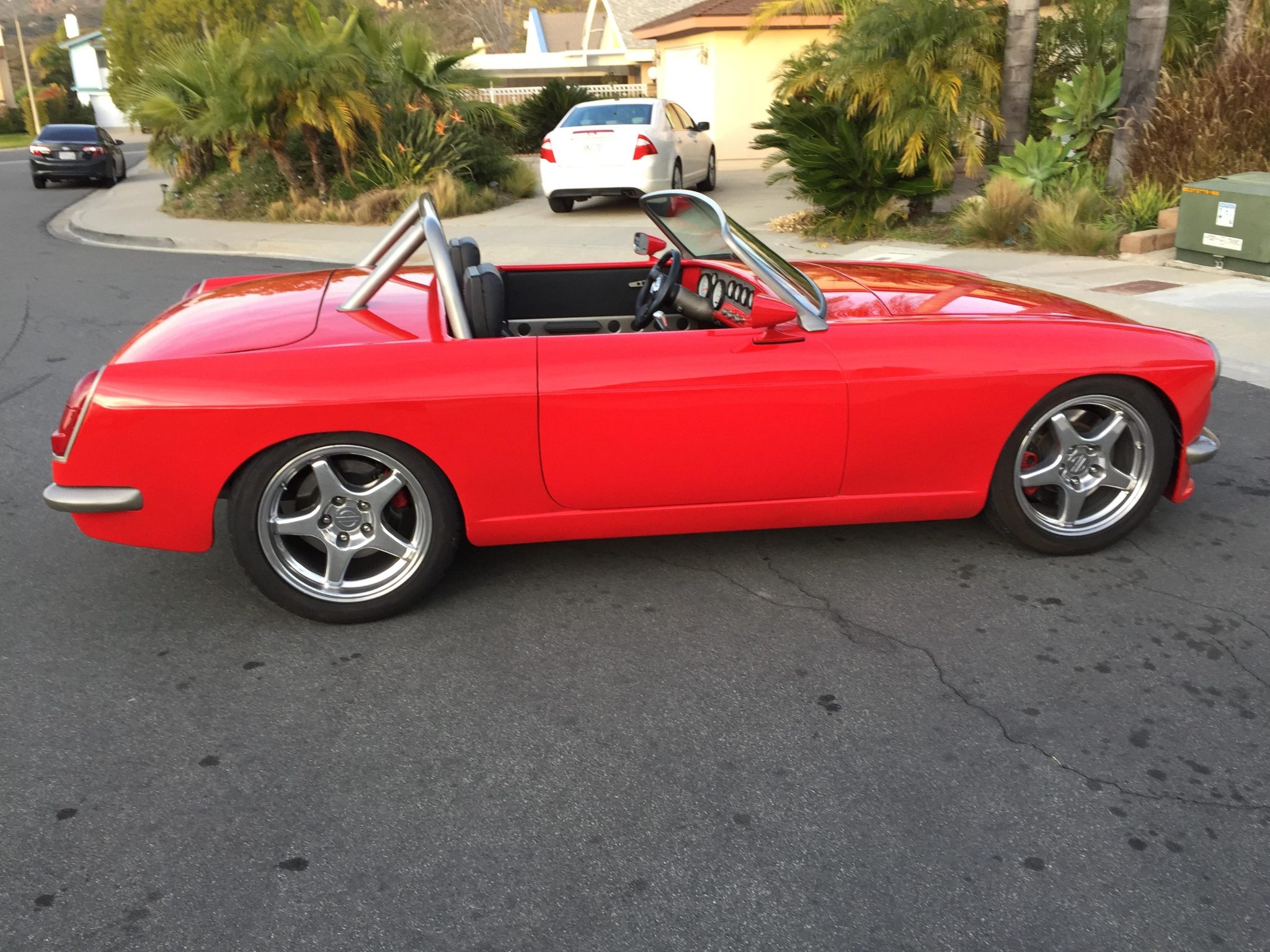 Polished 17” ZR1-style wheels are mounted with 275/40 front and 315/35 rear Nitto NT05 tires. The car is equipped with power steering as well as C4 Corvette disc brakes with dual vacuum-assisted master cylinders. A C4 Corvette suspension is mounted to custom-fabricated front and rear subframes incorporated into the monocoque. The suspension also includes a quick ratio steering rack, polyurethane bushings, QA1 adjustable coilovers, and a custom front sway bar with spherical bearing links.