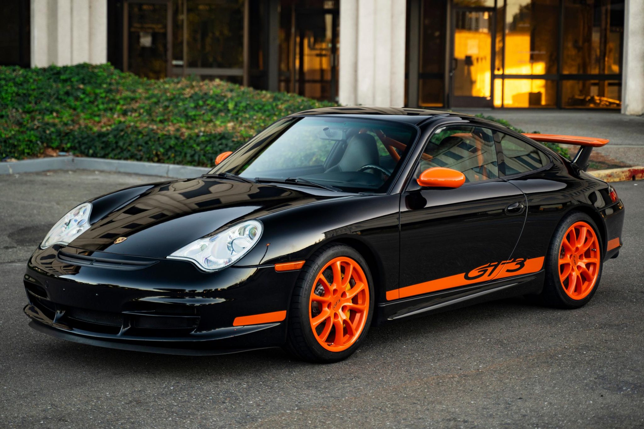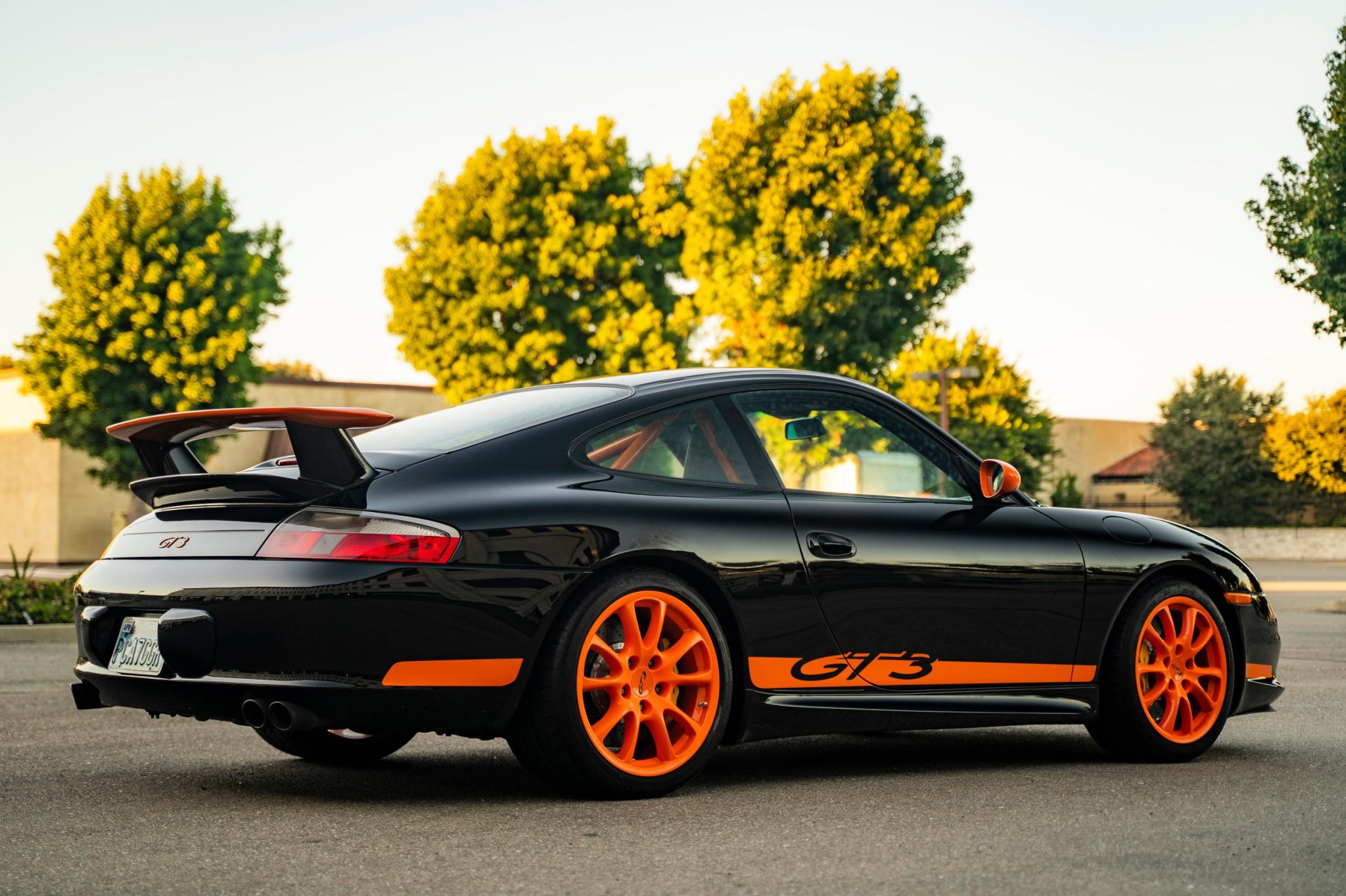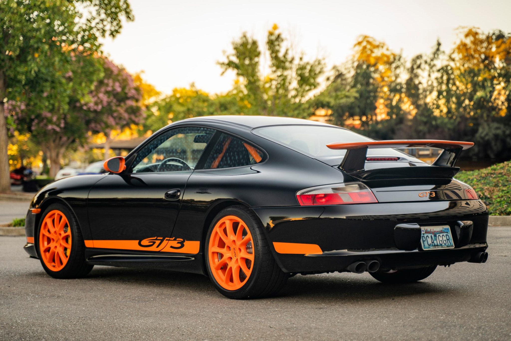 The 18″ wheels were powder-coated orange under current ownership and are mounted with 235/40 front and 295/30 rear Michelin Pilot Sport tires. Braking is from Porsche-branded calipers over ventilated carbon-ceramic rotors at each corner. The GT3 features a lower sport-tuned suspension compared to the standard Carrera model.