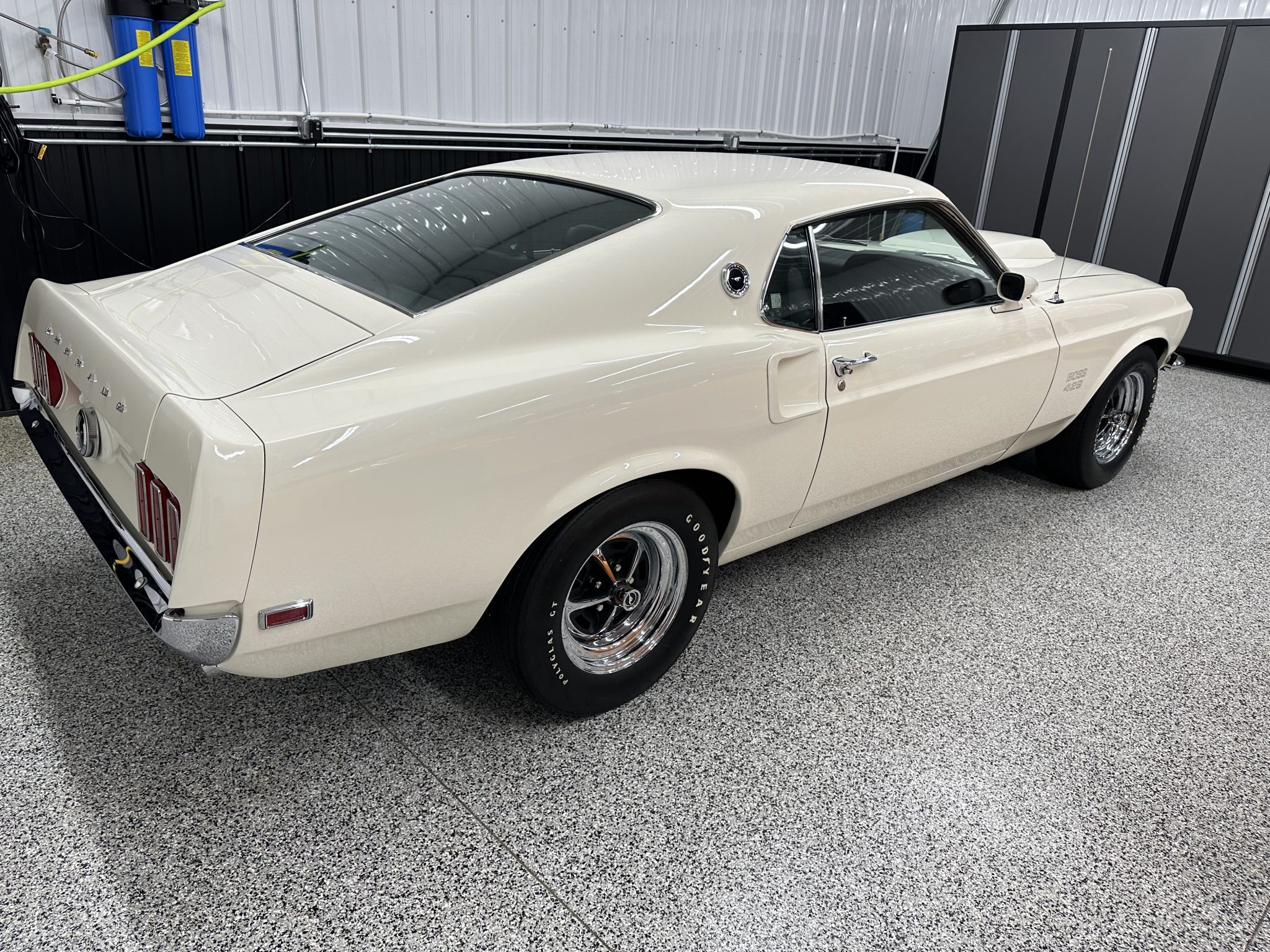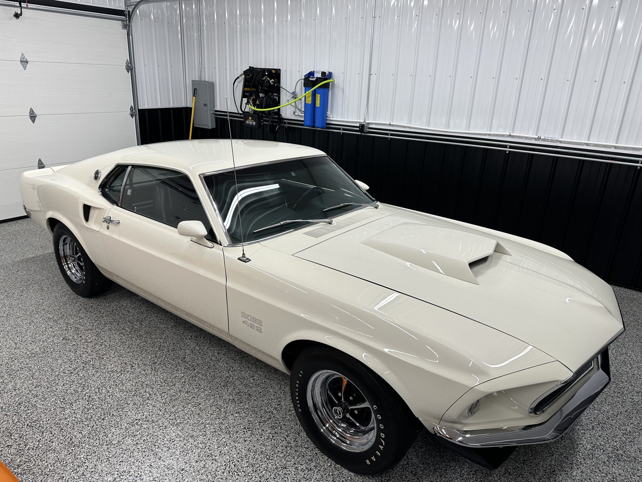 The 15″ Magnum 500-style wheels are mounted with Goodyear Polyglas GT tires. The Boss 429 model was equipped with revised control arms, a higher-rate front anti-roll bar than other Mustang variants, a rear anti-roll bar, and a competition suspension with staggered rear shocks. Power-assisted brakes with discs up front and drums out back were standard on the 429, with the front brakes reinforced with heavy-duty hubs and rotors as well as oversized spindles. Power-assisted steering was also equipped from the factory.