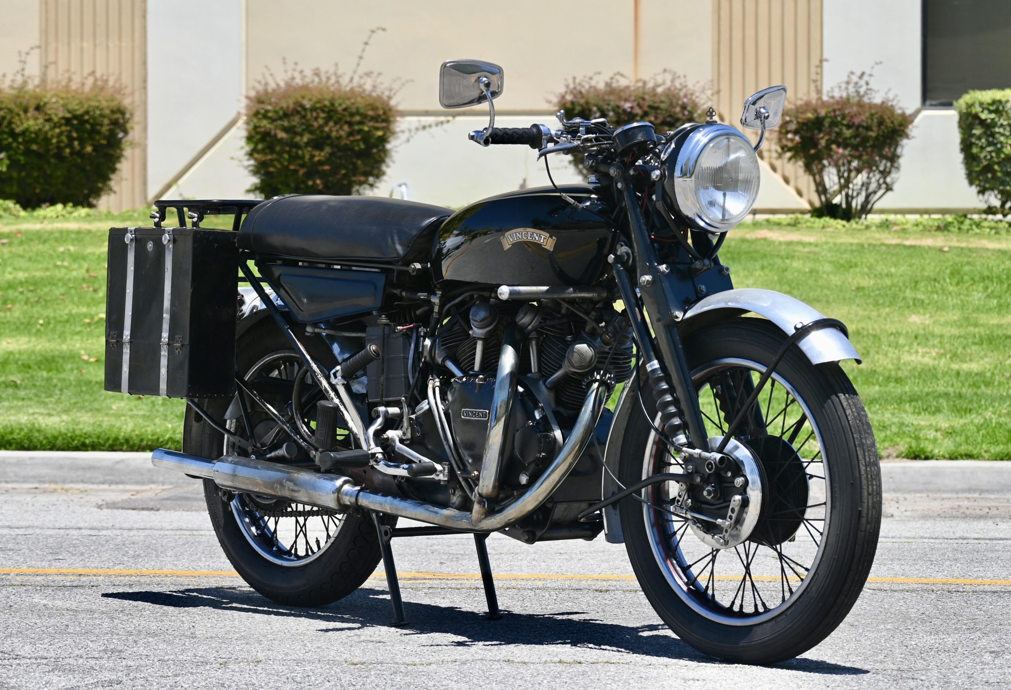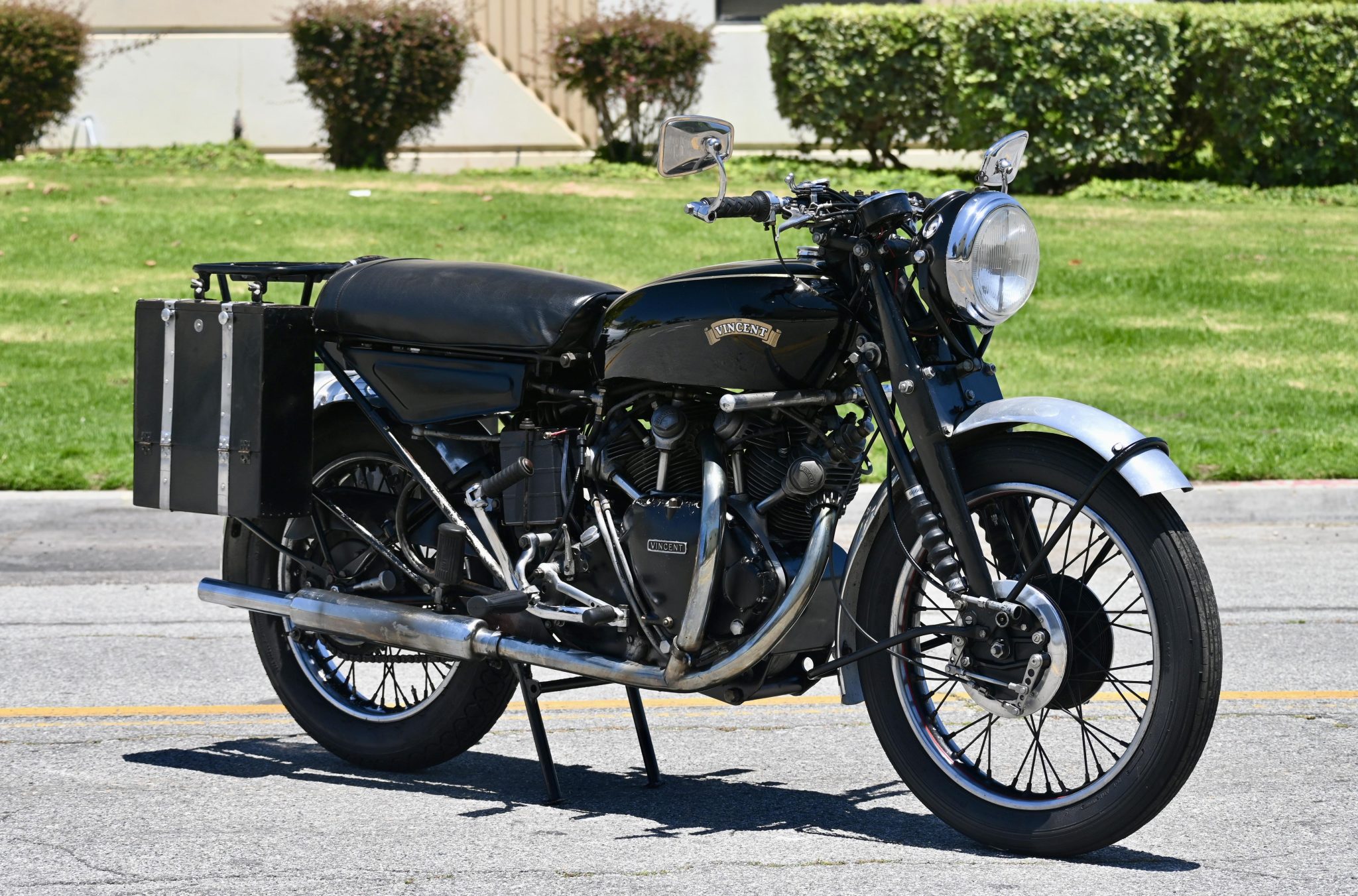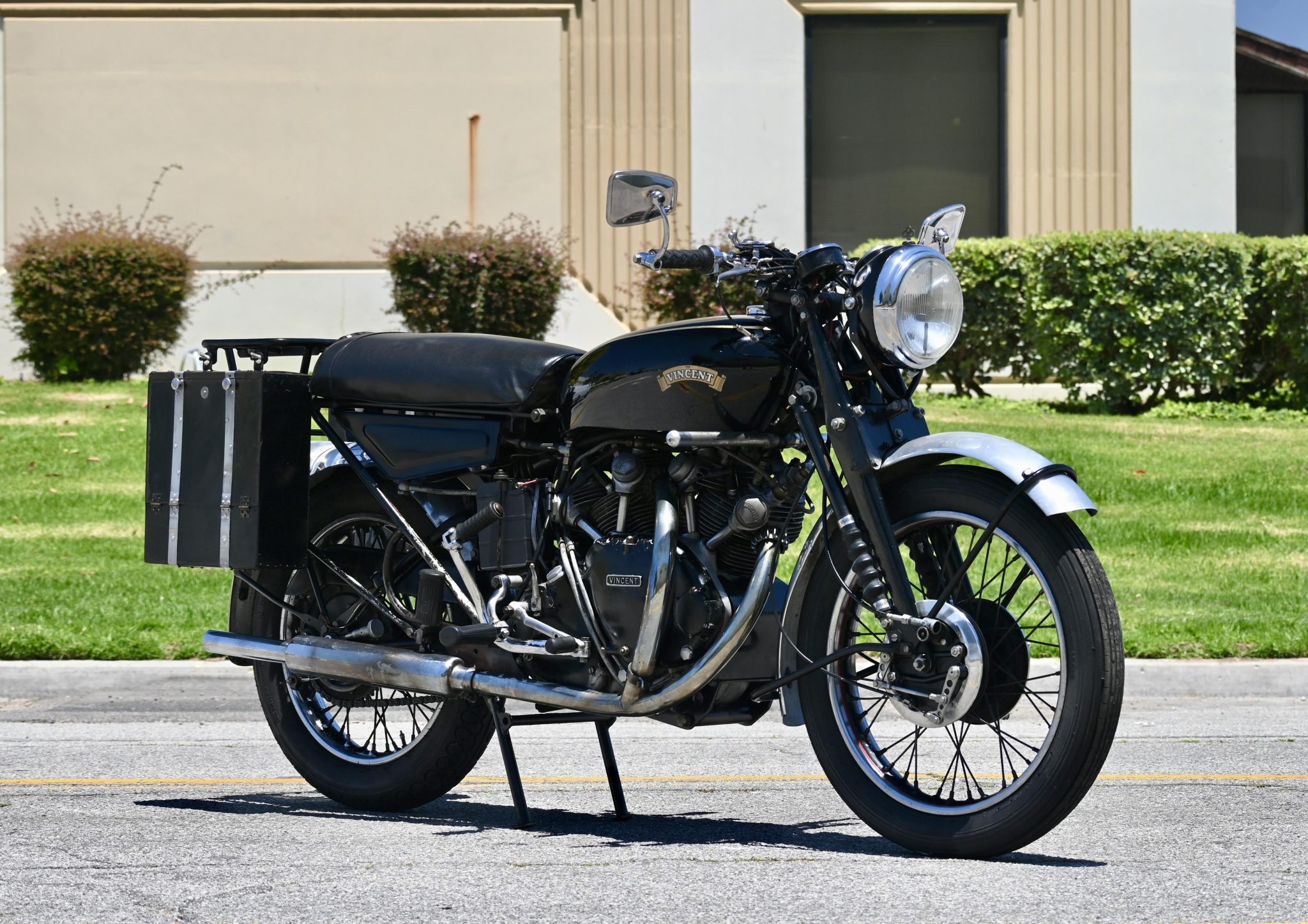The 19″ front and 18″ rear rims feature black-painted centers with red pinstripes and wear Avon Speedster MKII tires. Suspension consists of a Vincent Girdraulic fork as well as a monoshock mounted to the modified swingarm. Braking is from twin leading-shoe drums up front and a single drum out back.