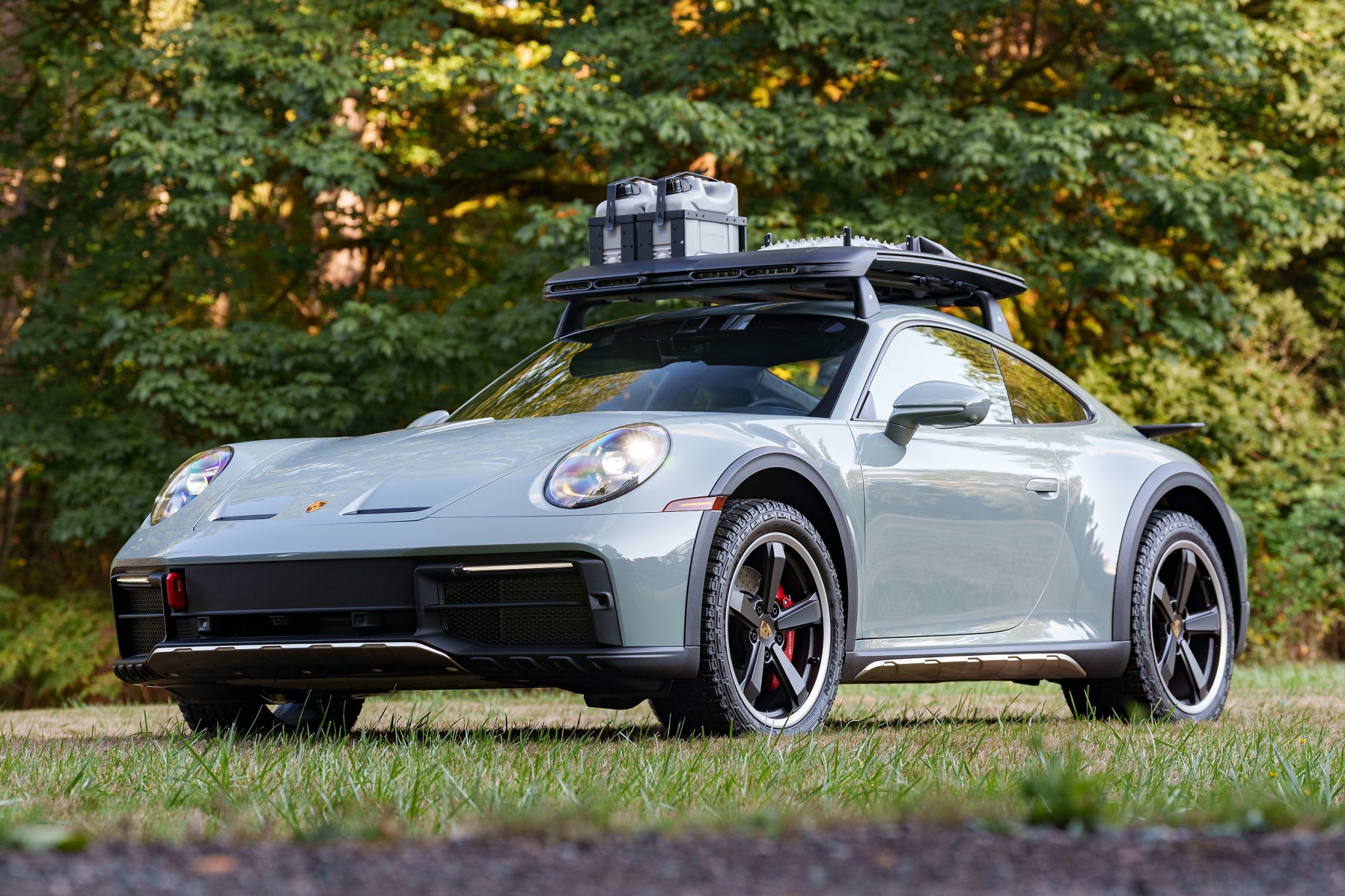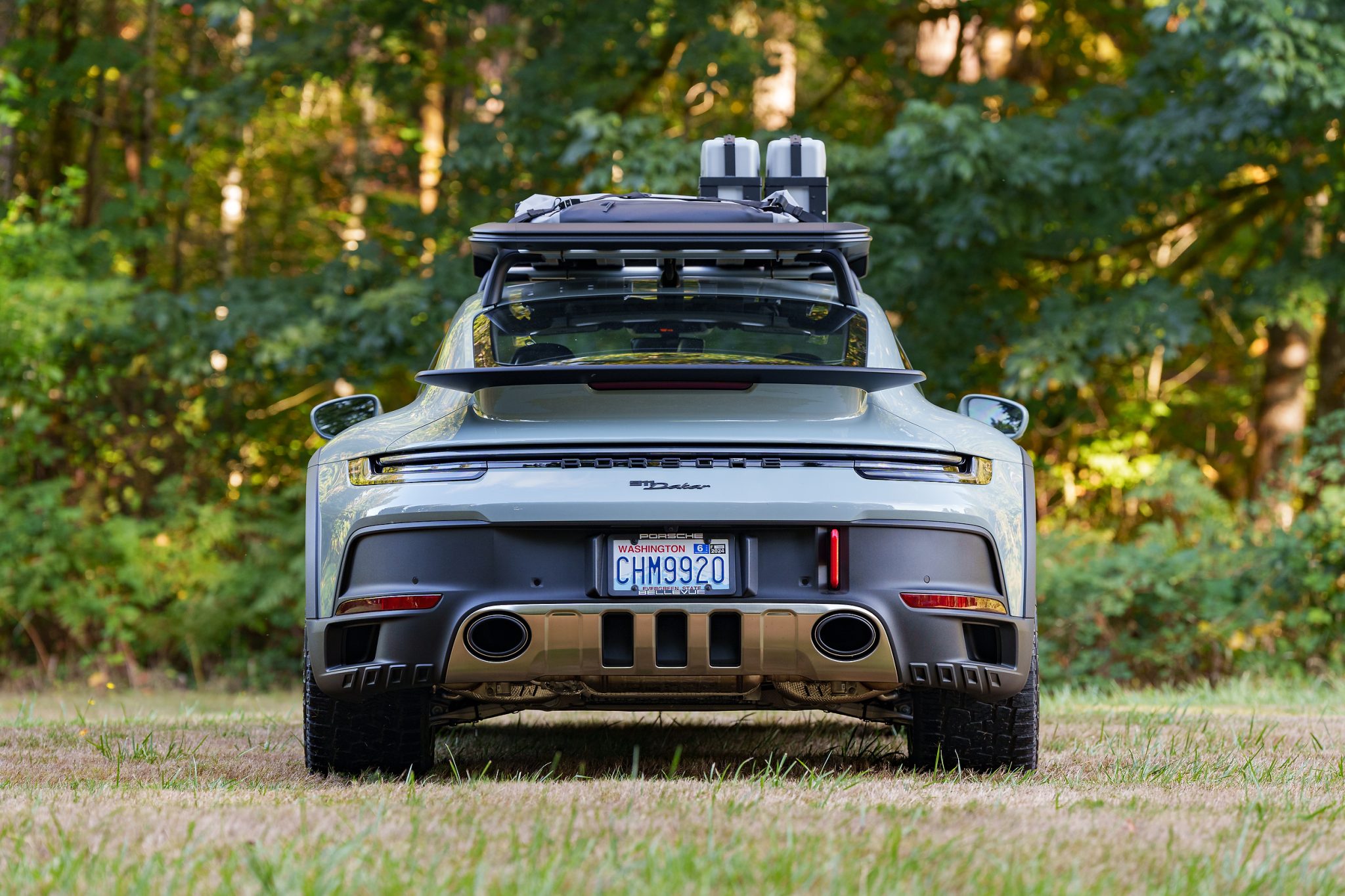 This example is finished in optional Shade Green Metallic, and clear paint protection film has been applied to the front end by the original selling dealer in August 2023. Equipment includes stainless-steel front and rear skid plates, a carbon-fiber front hood with stainless-steel vents, a carbon-fiber fixed rear spoiler, body-color mirror bases, 911 Dakar puddle lamps, black rocker-panel cladding with inset stainless-steel guard plates, black wheel-arch extensions, lightweight glass, red front and rear tow hooks, and Exclusive Design tailpipes finished in silver. A Porsche Dakar roof rack featuring an inset light bar, a spade, jerry cans, and sand recovery rails was installed by Porsche Bellevue in August 2023.