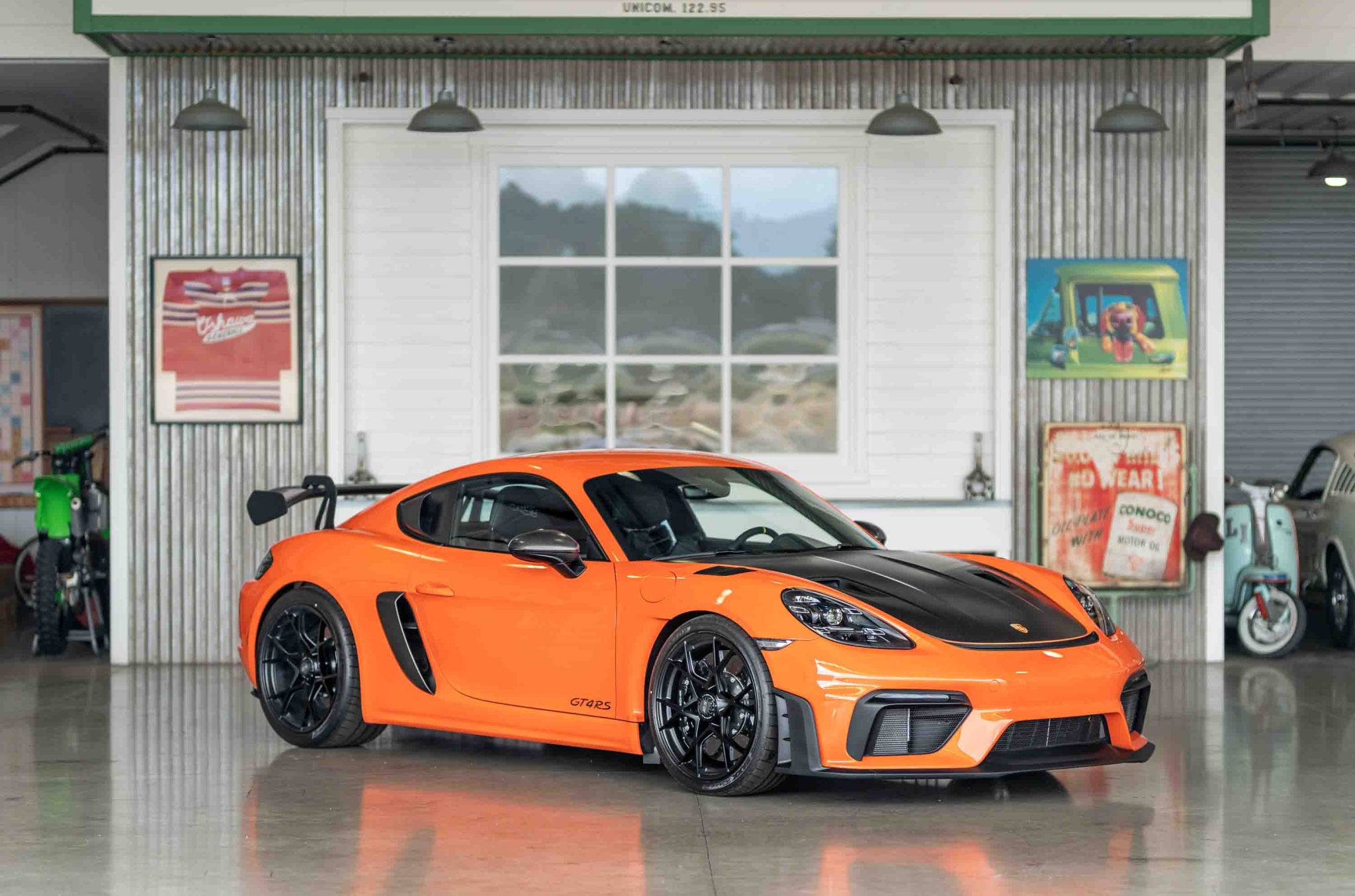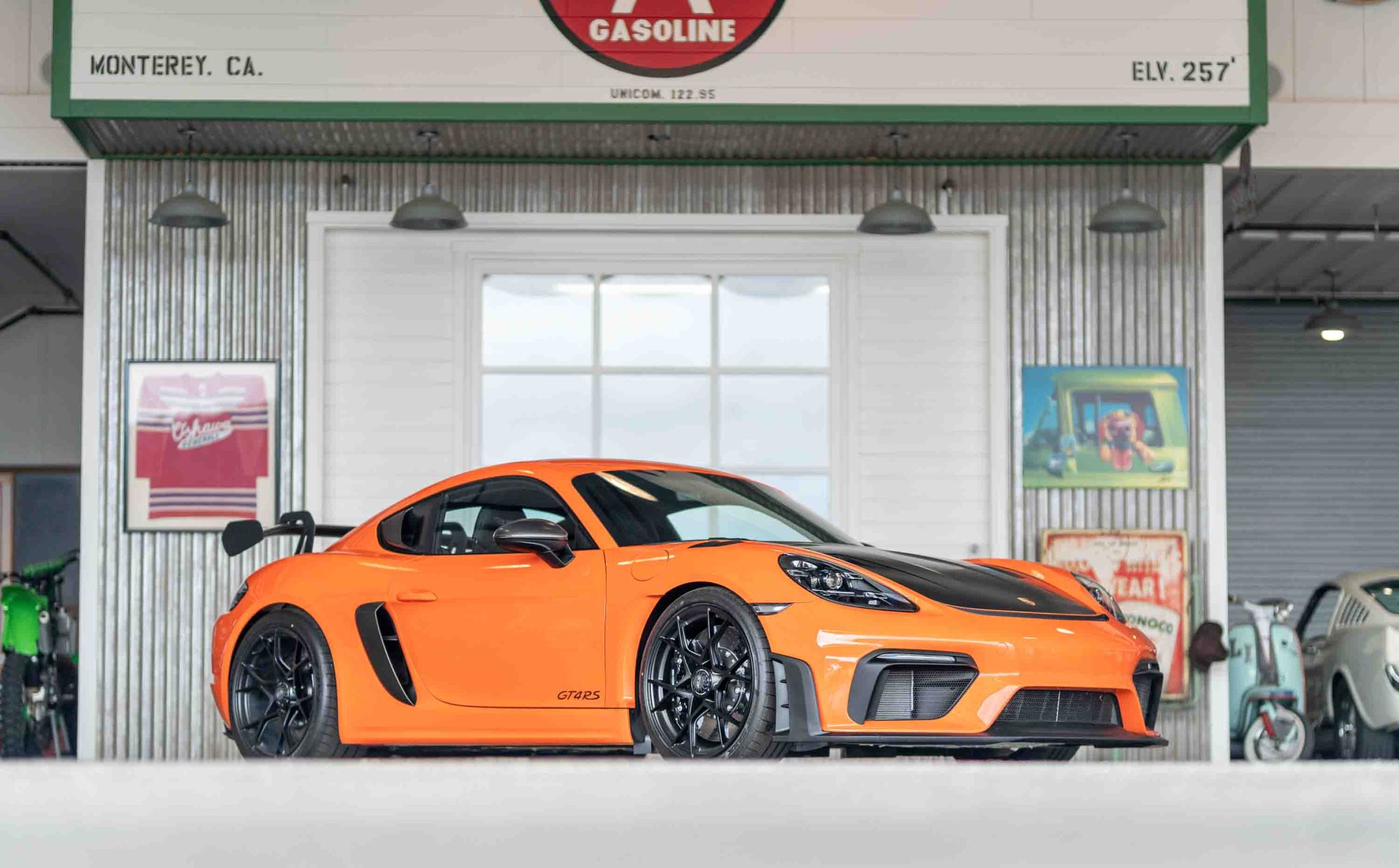 Satin black-finished center-locking 20″ forged aluminum wheels are wrapped in 245/35 front and 295/30 rear Dunlop Sport Maxx Race 2 tires. A front axle lift system was optioned from the factory as well as Porsche Ceramic Composite Brakes (PCCB) featuring black-painted Porsche-branded calipers at all four corners.