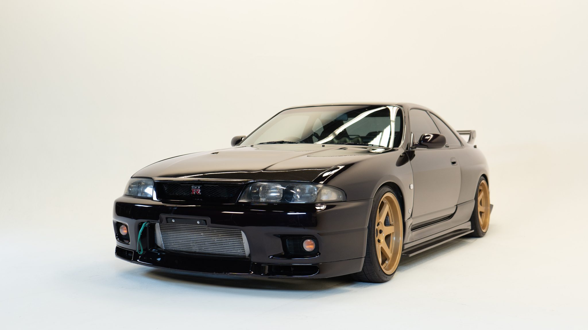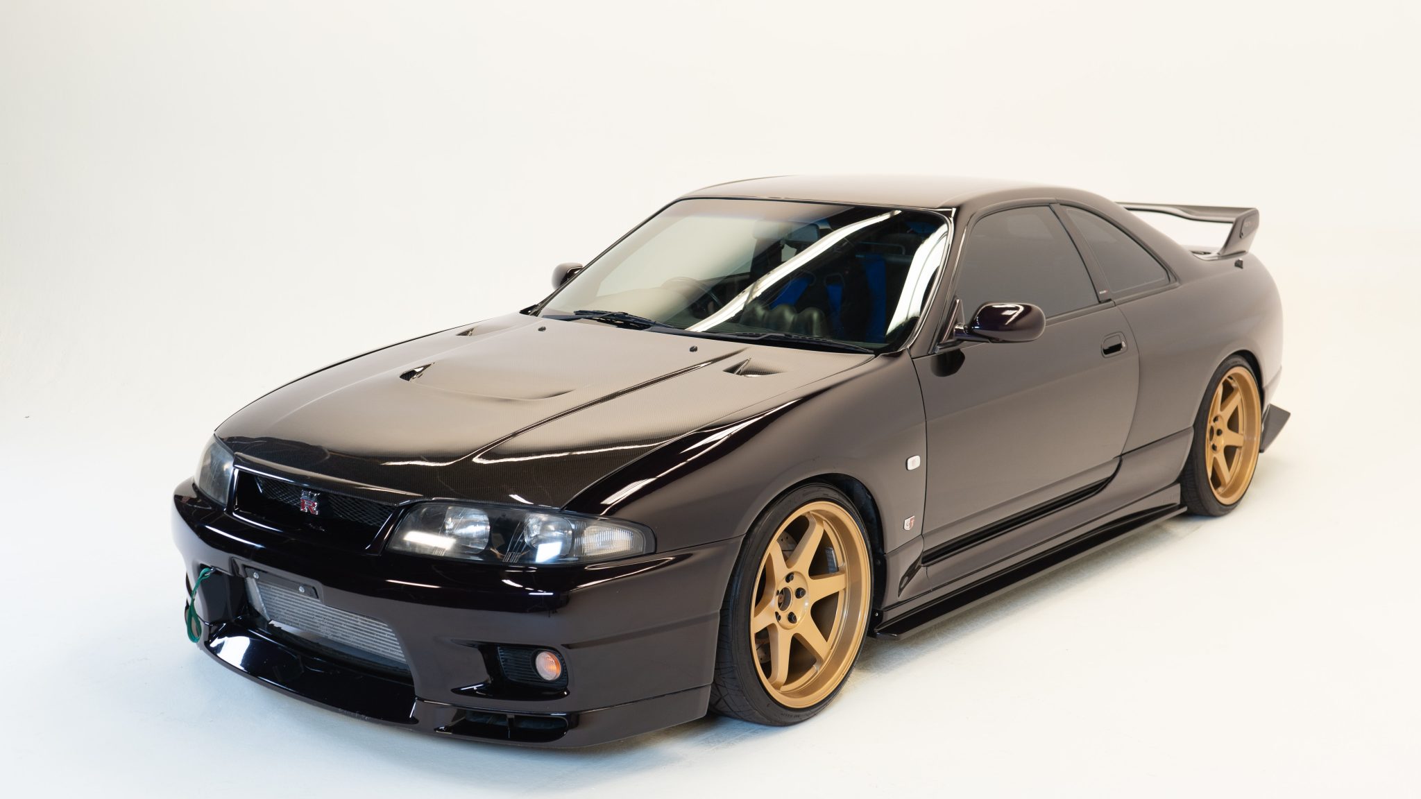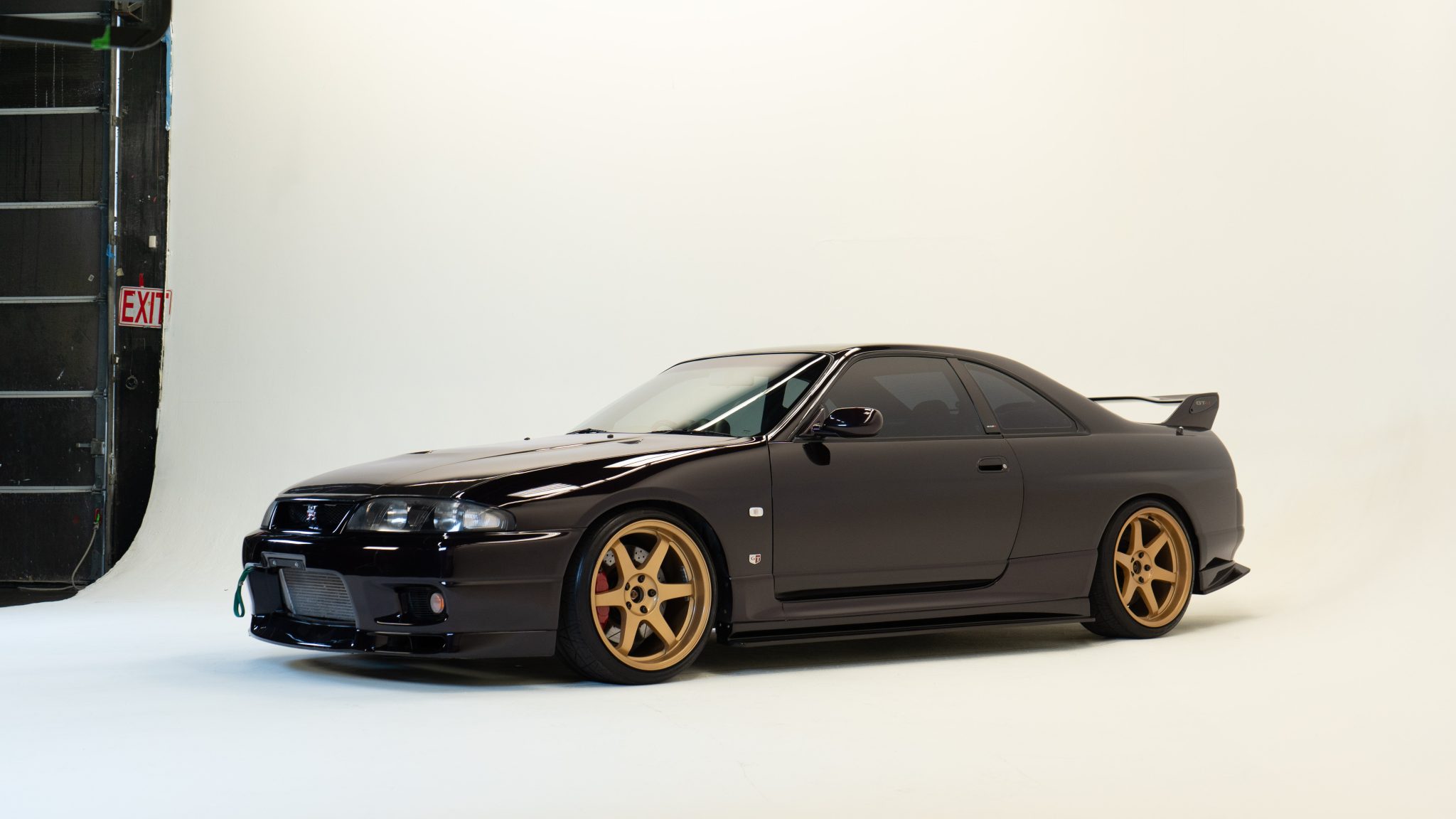 Gold-finished 19″ wheels are wrapped in 275/30 Nitto Invo tires and are mounted over slotted and cross-drilled brake rotors with red Infiniti-branded calipers. An Enjuku Racing rear HICAS delete kit has been installed, and the car is equipped with front and rear shock tower braces.
