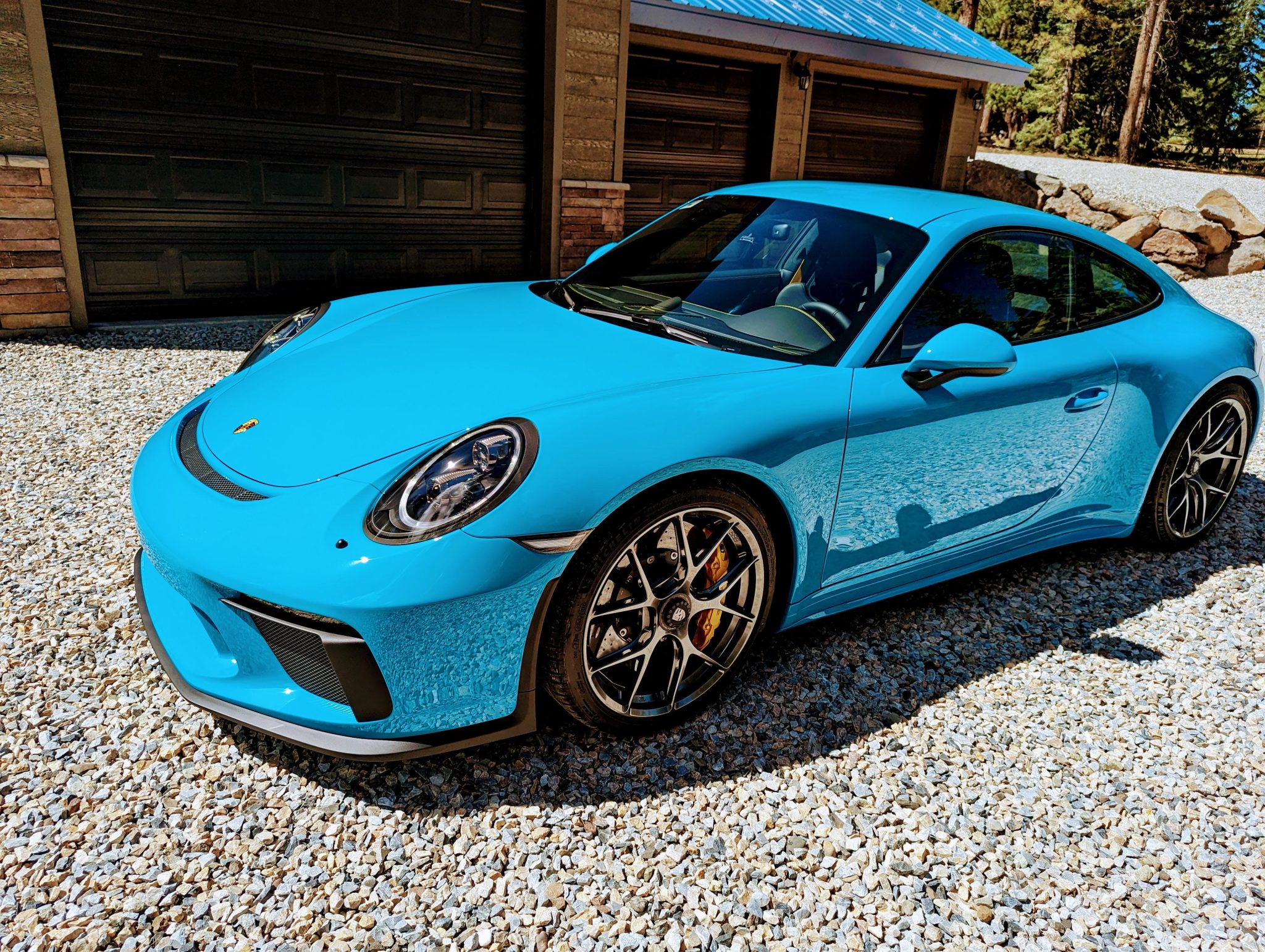 Forged 20″ BBS center-lock wheels are mounted with 245/35 front and 305/30 rear Michelin Pilot Sport 4s tires showing 2022 date codes. Braking is handled by yellow Porsche-branded calipers over ceramic-composite rotors.