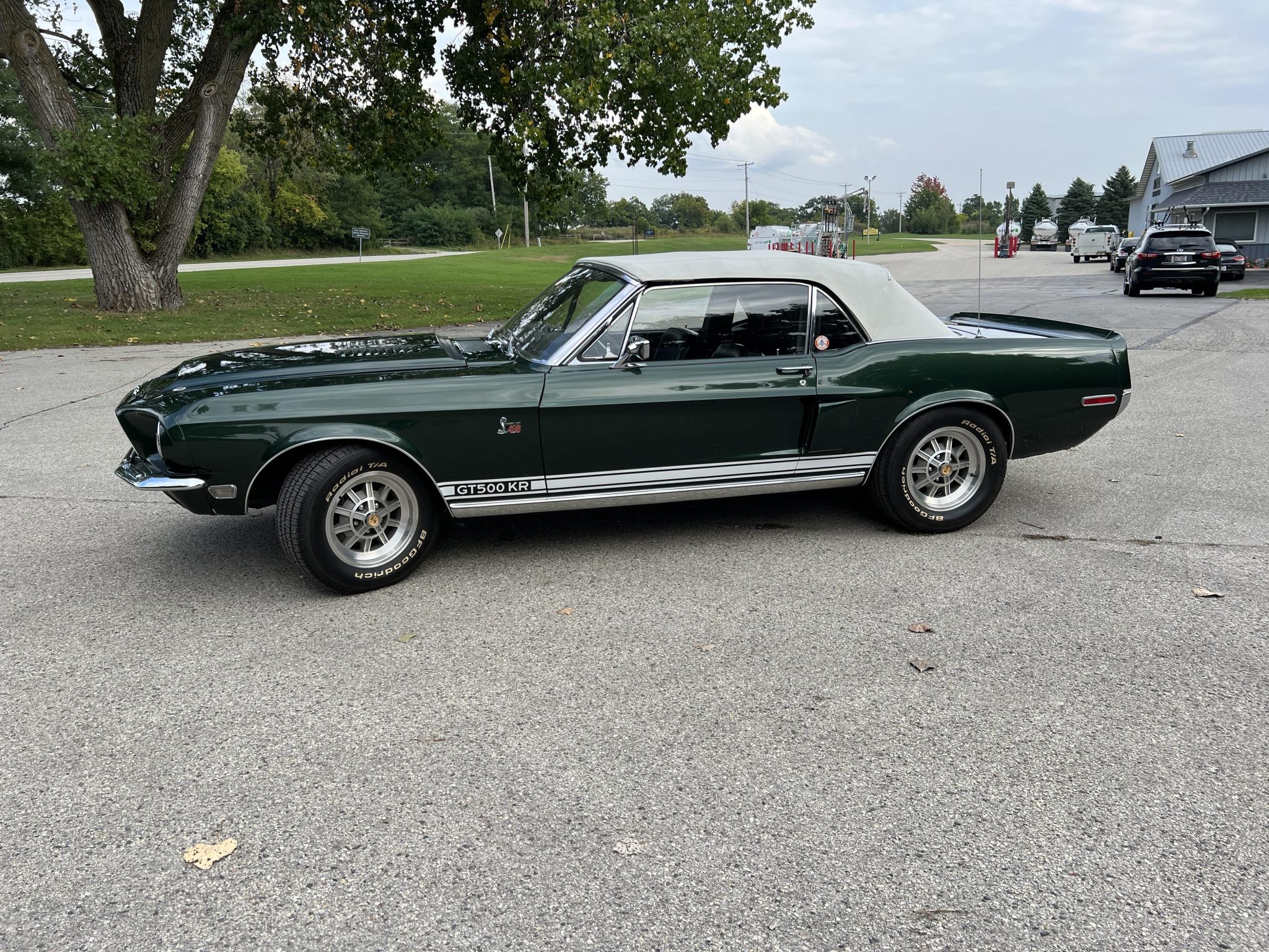 This example was delivered from the factory in Highland Green (R), and it was repainted in its factory color under previous ownership. Additional features include white GT500KR side stripes, side-view mirrors, a silver-painted tail panel, and a Cobra Jet fuel cap and fender badges. The power-operated white soft top features a folding glass window. Replacement turn signals and sequential taillights were reportedly installed by the selling dealer. Cracks on the fiberglass hood scoop can be seen in the gallery.